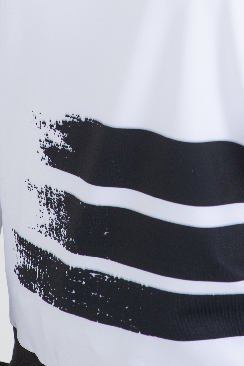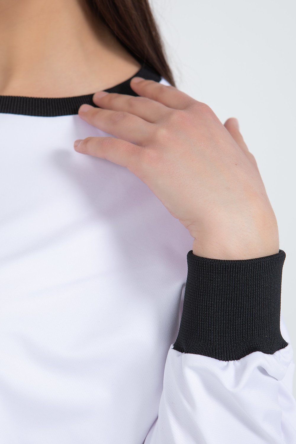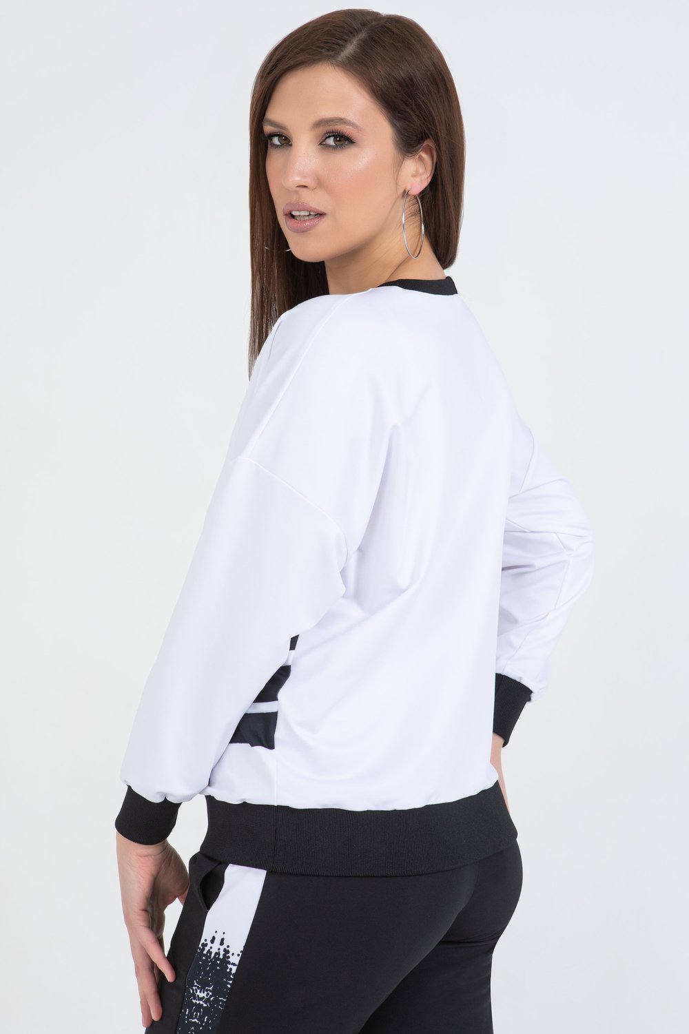 Блуза прямого силуэта. Передняя половинка с нанесением сублимационной печати. Рукав втачной, с манжетами по низу, на правом рукаве нанесение печати. Плечо спущено.Характеристики: