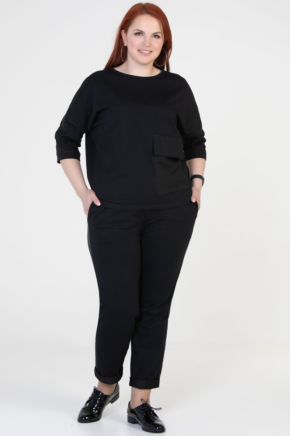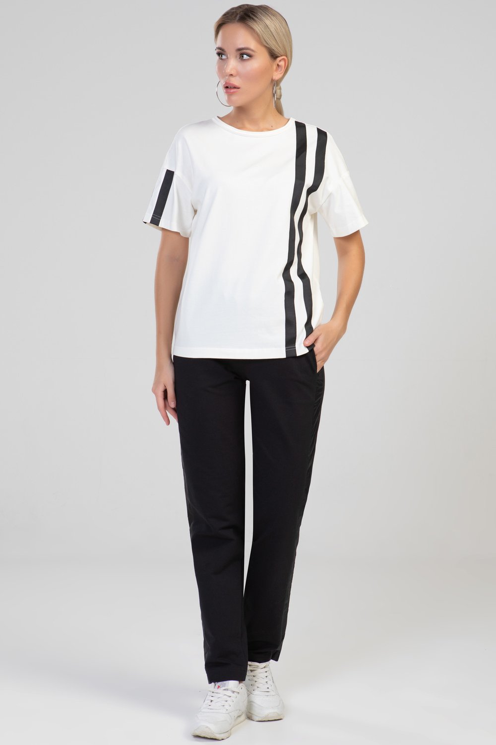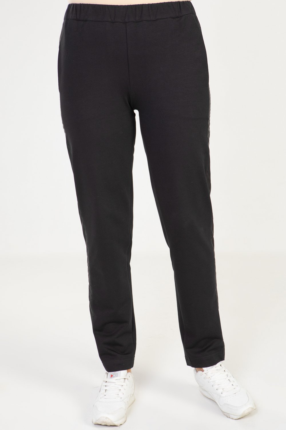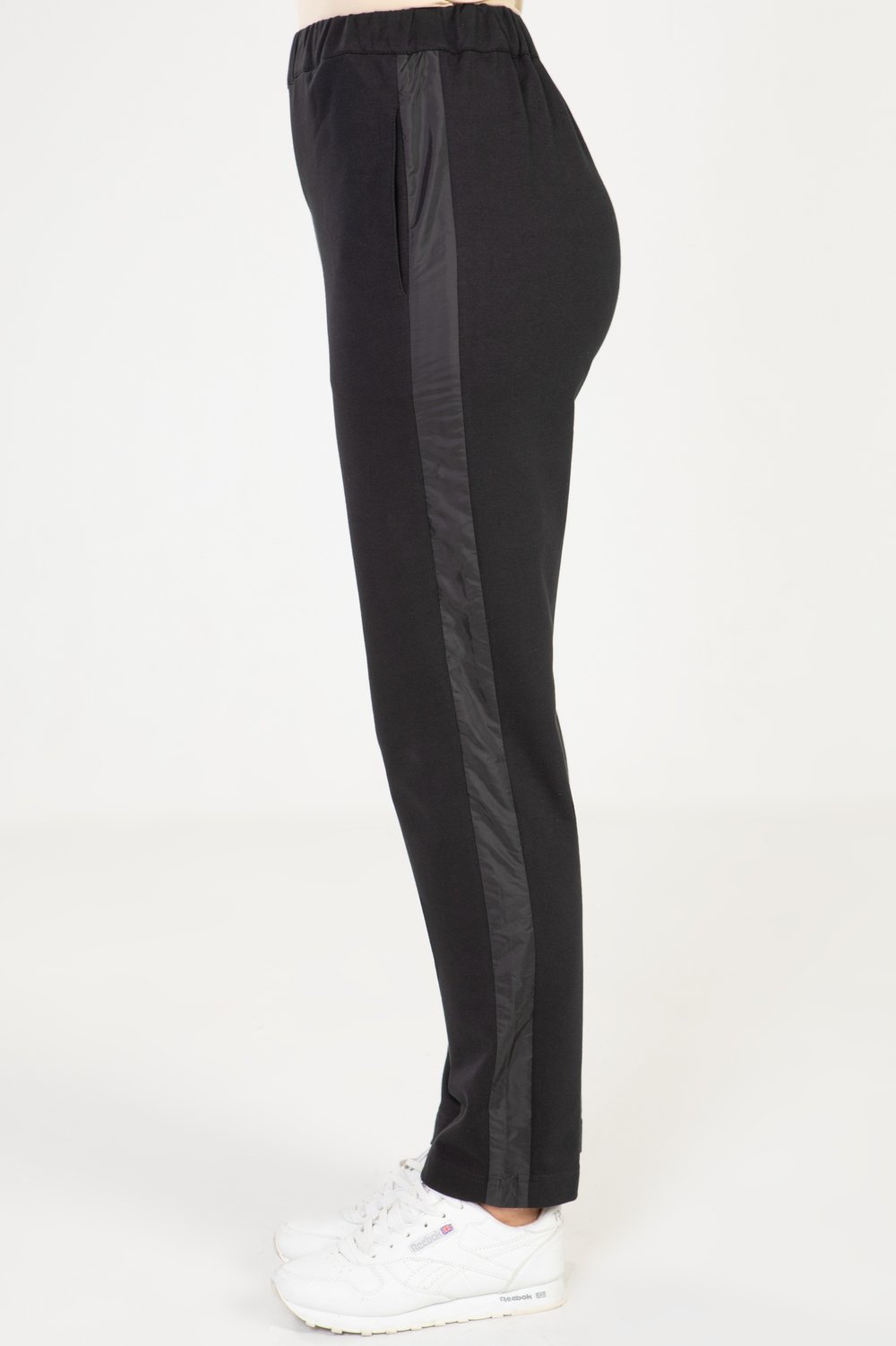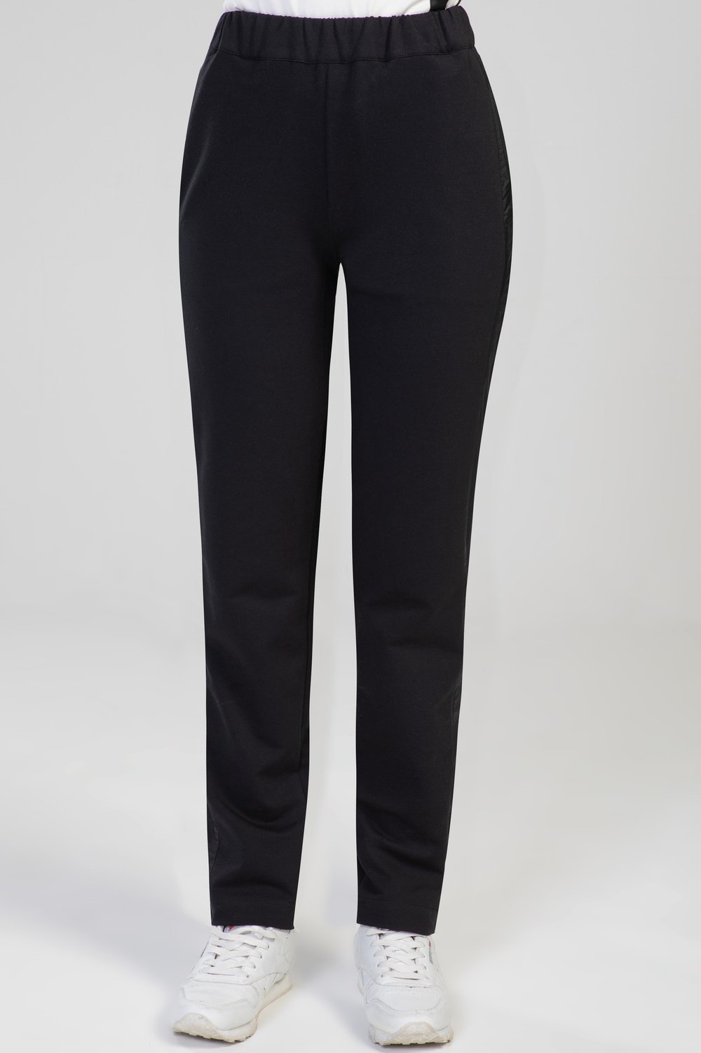 Брюки прямого силуэта с лампасами и карманами в боковом шве. Верх брюк на притачном поясе с эластичной тесьмой. Лампасы выполнены из тонкой плащевой ткани в тон основного сырья. Цвет черный.Характеристики: