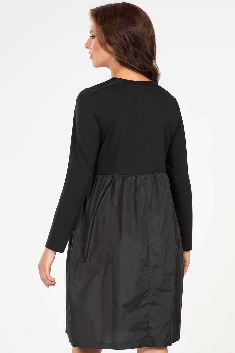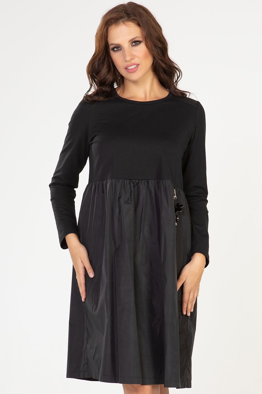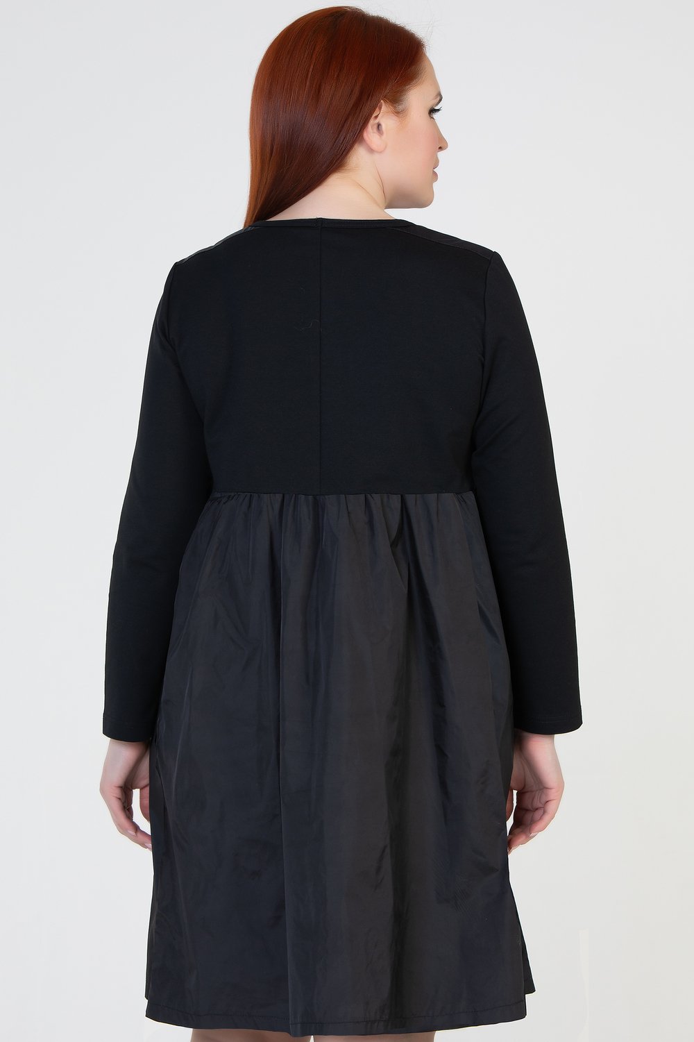 Платье трапециевидного силуэта, отрезное выше линии талии. Горловина круглая, рукав длинный, в боковых швах карманы. Нижняя часть переда и спинки собрана в сборку по шву притачивания. Платье выполнено из разного сырья : верхняя часть переда и спинки, рукав-из трикотажного полотна, футера двухниточного, нижняя часть переда и спинки и декоративная кокетка переда выполнены из тонкой плащевой ткани. С левой стороны в шве соединения верха с юбкой вшита шлевка из плащевой ткани, в шлевку вставлено декоративное украшение итальянской фабрики " Bottoni". Украшение входит в стоимость платья. Цвет черный.Характеристики: