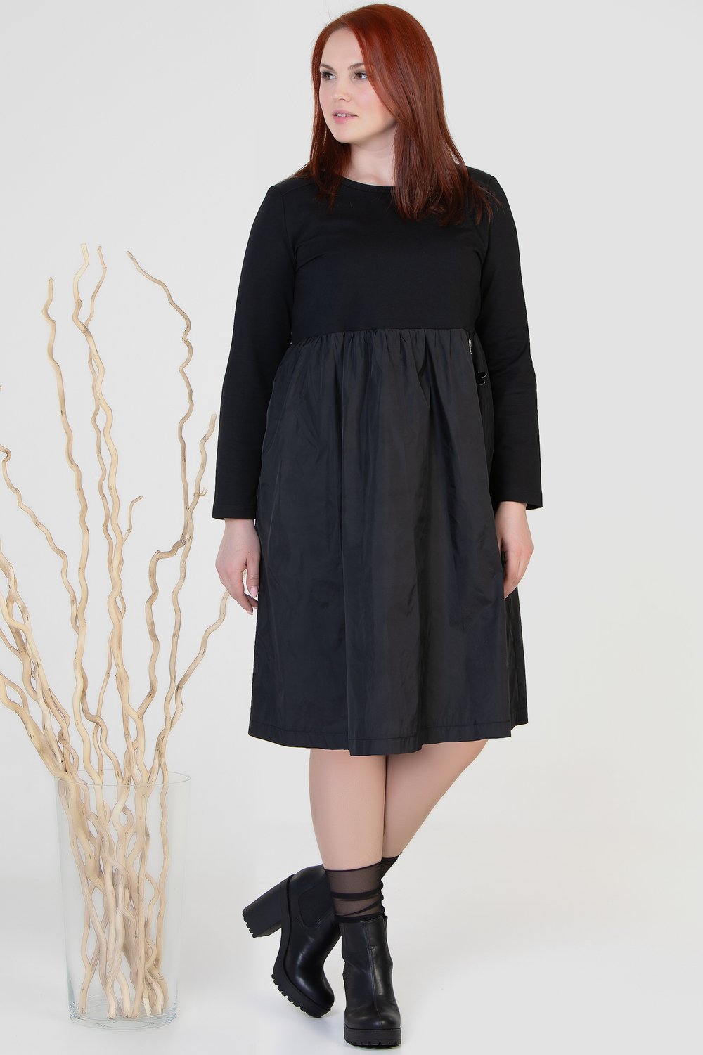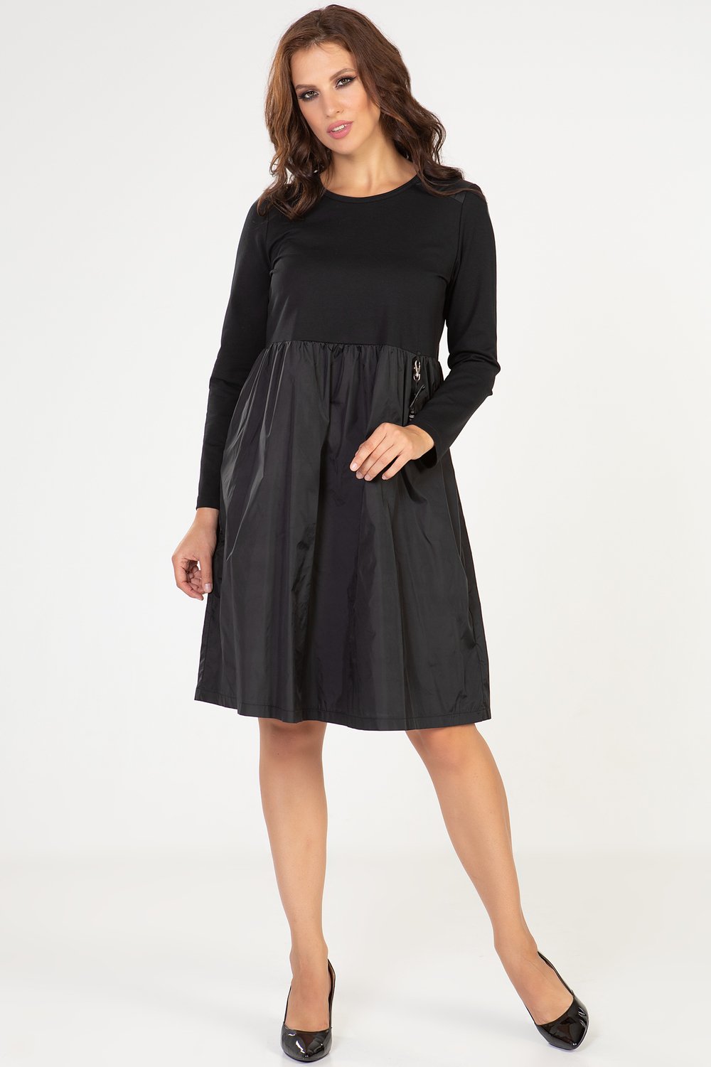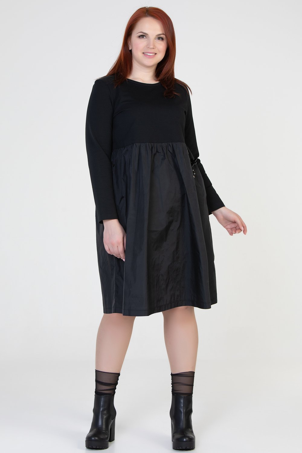Платье трапециевидного силуэта, отрезное выше линии талии. Горловина круглая, рукав длинный, в боковых швах карманы. Нижняя часть переда и спинки собрана в сборку по шву притачивания. Платье выполнено из разного сырья : верхняя часть переда и спинки, рукав-из трикотажного полотна, футера двухниточного, нижняя часть переда и спинки и декоративная кокетка переда выполнены из тонкой плащевой ткани. С левой стороны в шве соединения верха с юбкой вшита шлевка из плащевой ткани, в шлевку вставлено декоративное украшение итальянской фабрики " Bottoni". Украшение входит в стоимость платья. Цвет черный.Характеристики: