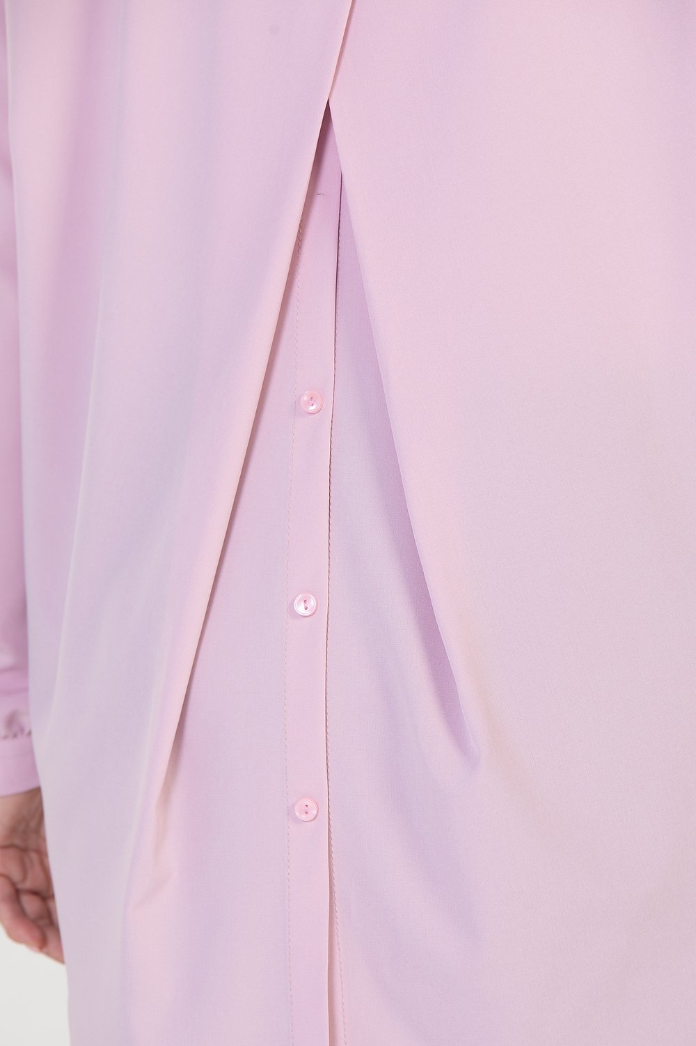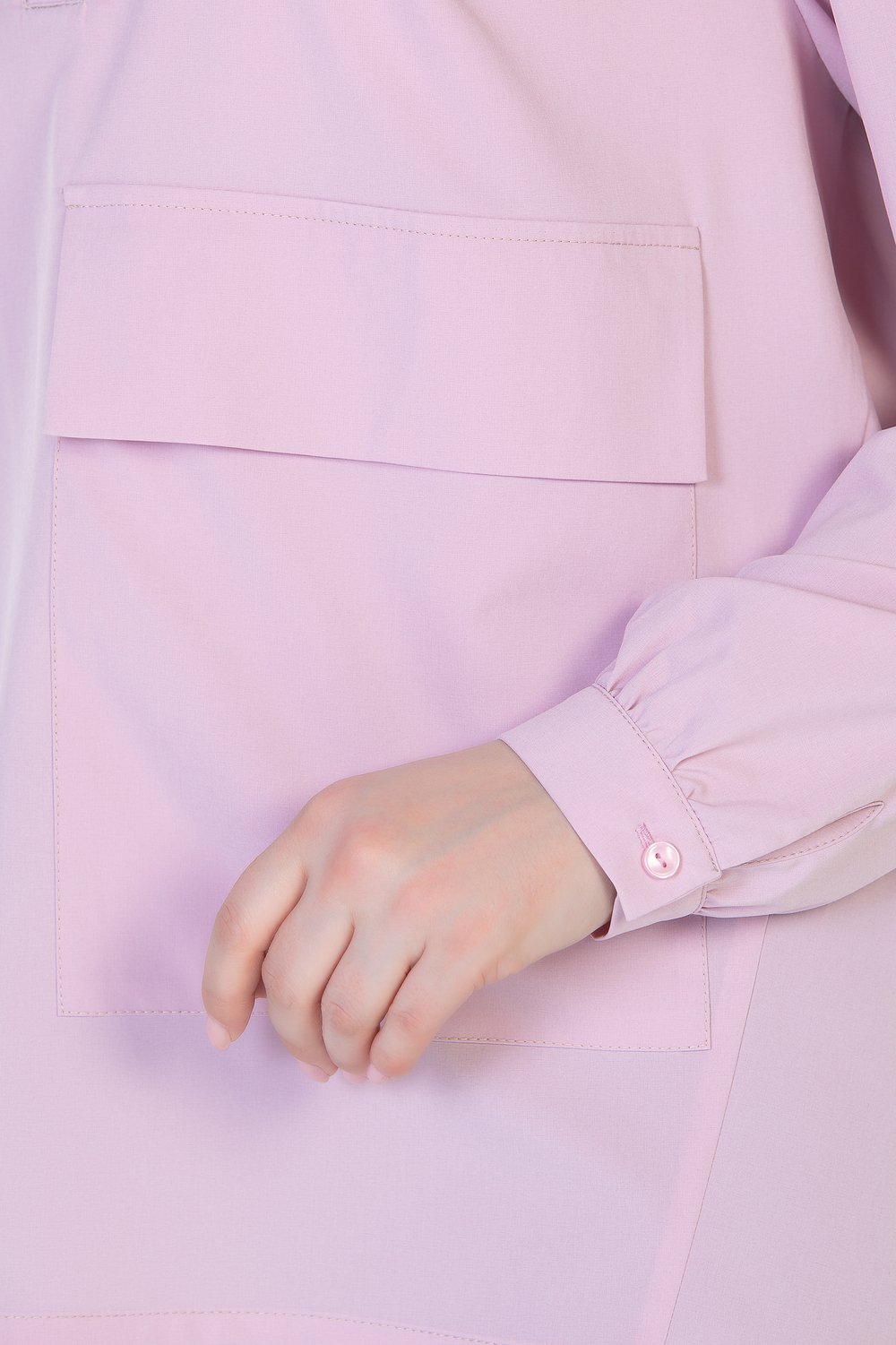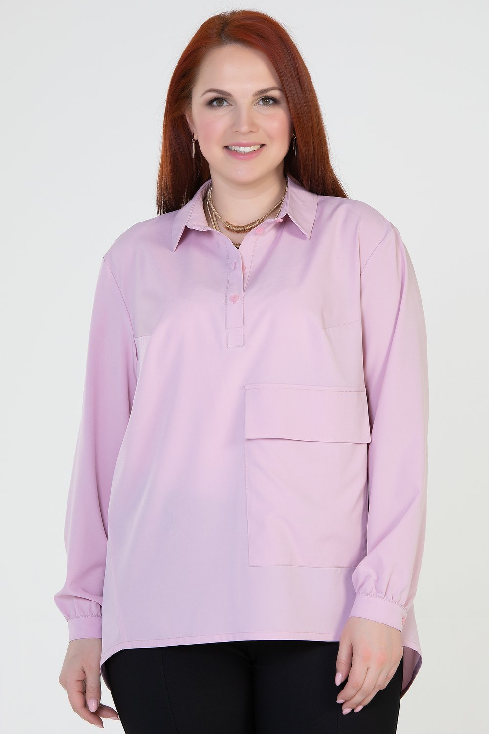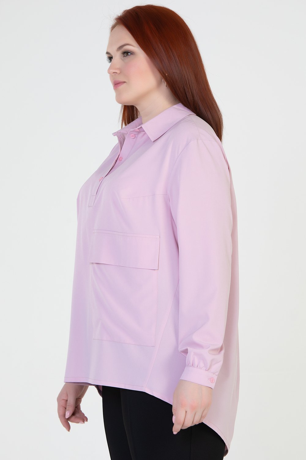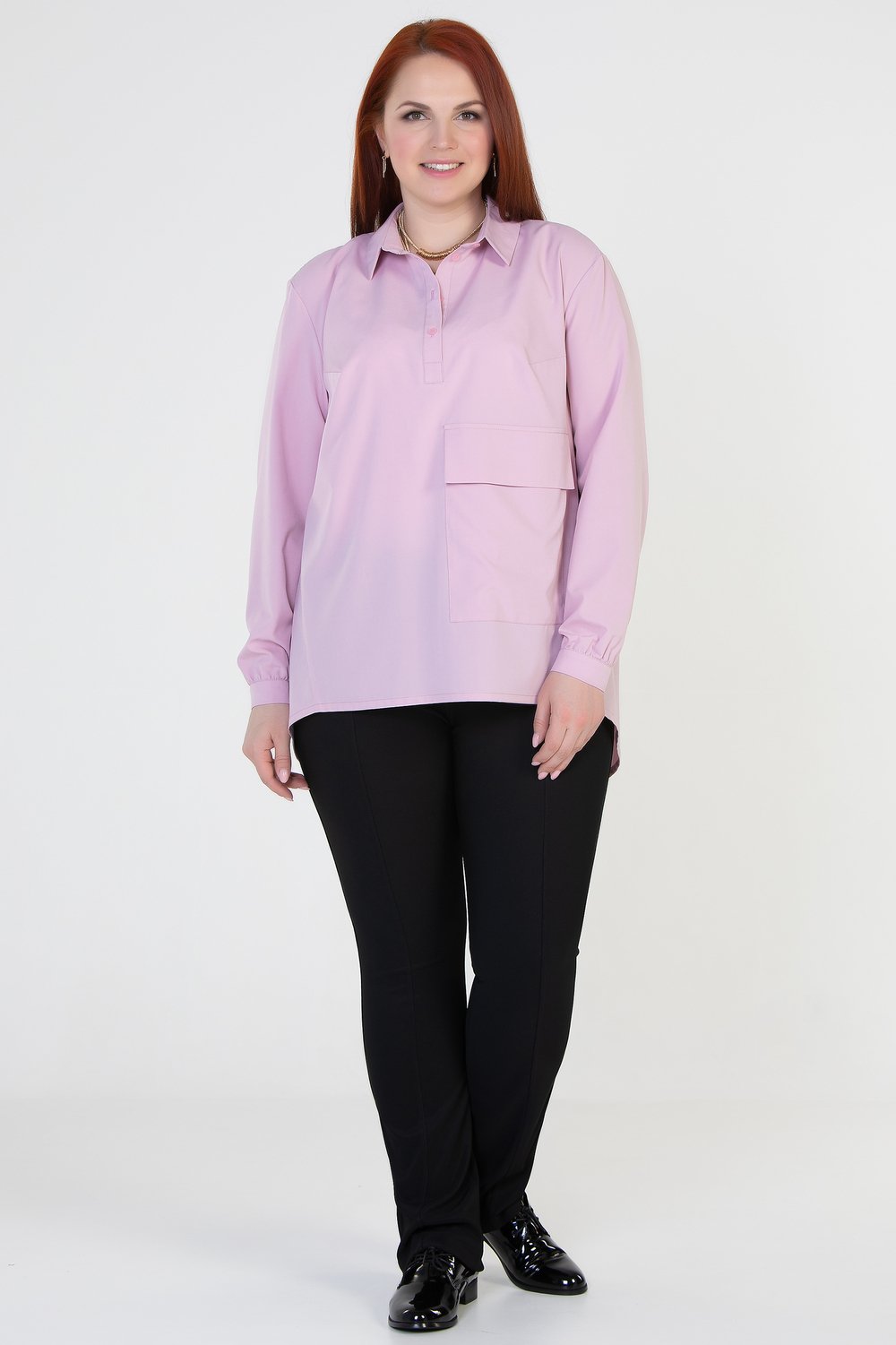 Блуза прямого силуэта, разноуровневая, плечо спущенное. Перед с короткой застежкой в рамку, застегивающейся на три петли и пуговицы, с накладным карманом и клапаном . Спинка с кокеткой. Нижняя часть спинки из двух деталей, с запахом одна на другую, с цельнокроеной планкой и тремя отделочными пуговицами, пришитыми насквозь планок. Рукав втачной, длинный, по низу на притачной манжете, застегивающейся на петлю и пуговицу. По шву притачивания манжеты сборка. Воротник на стойке, застегивающейся на петлю и пуговицу.Характеристики: