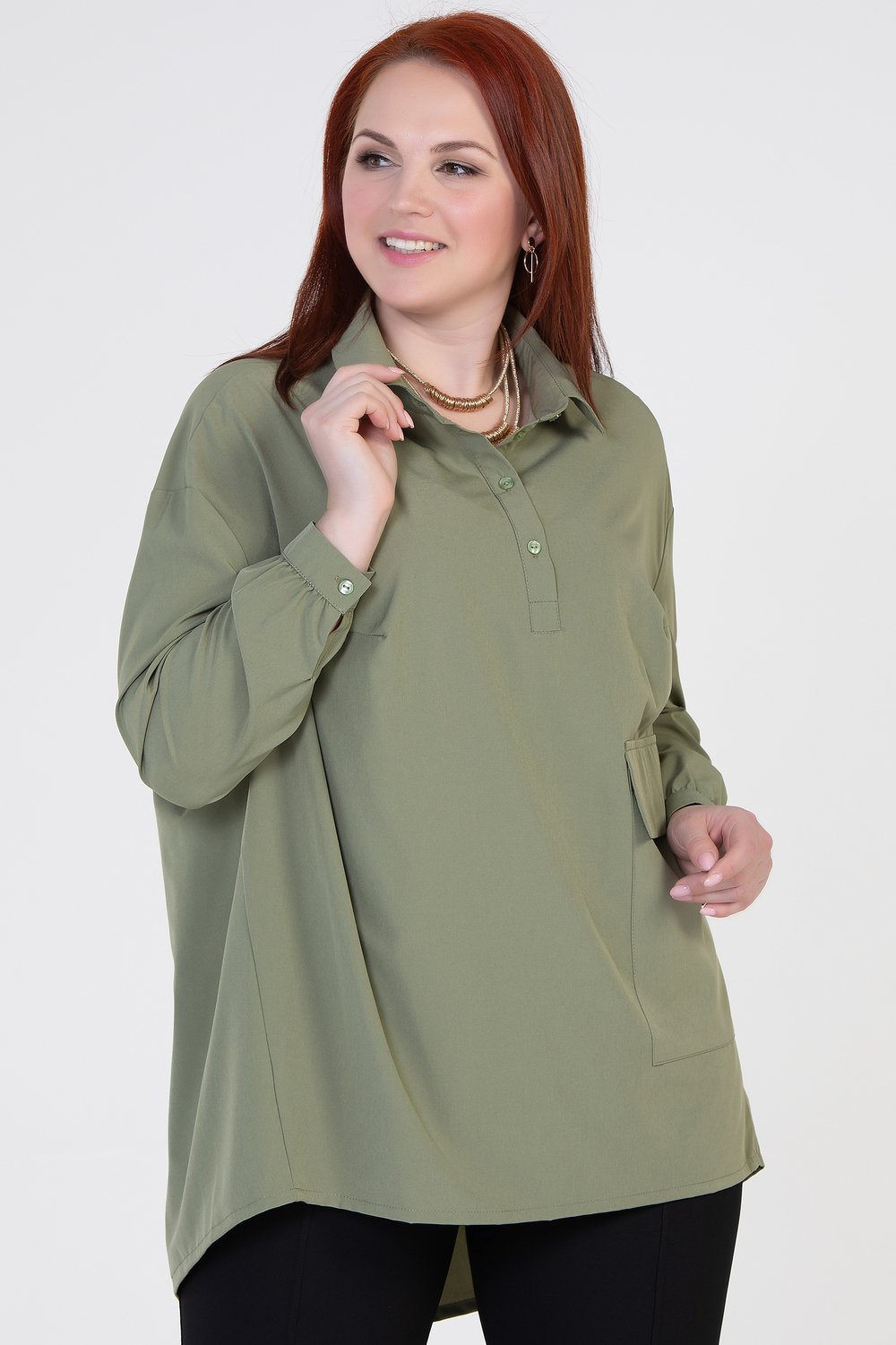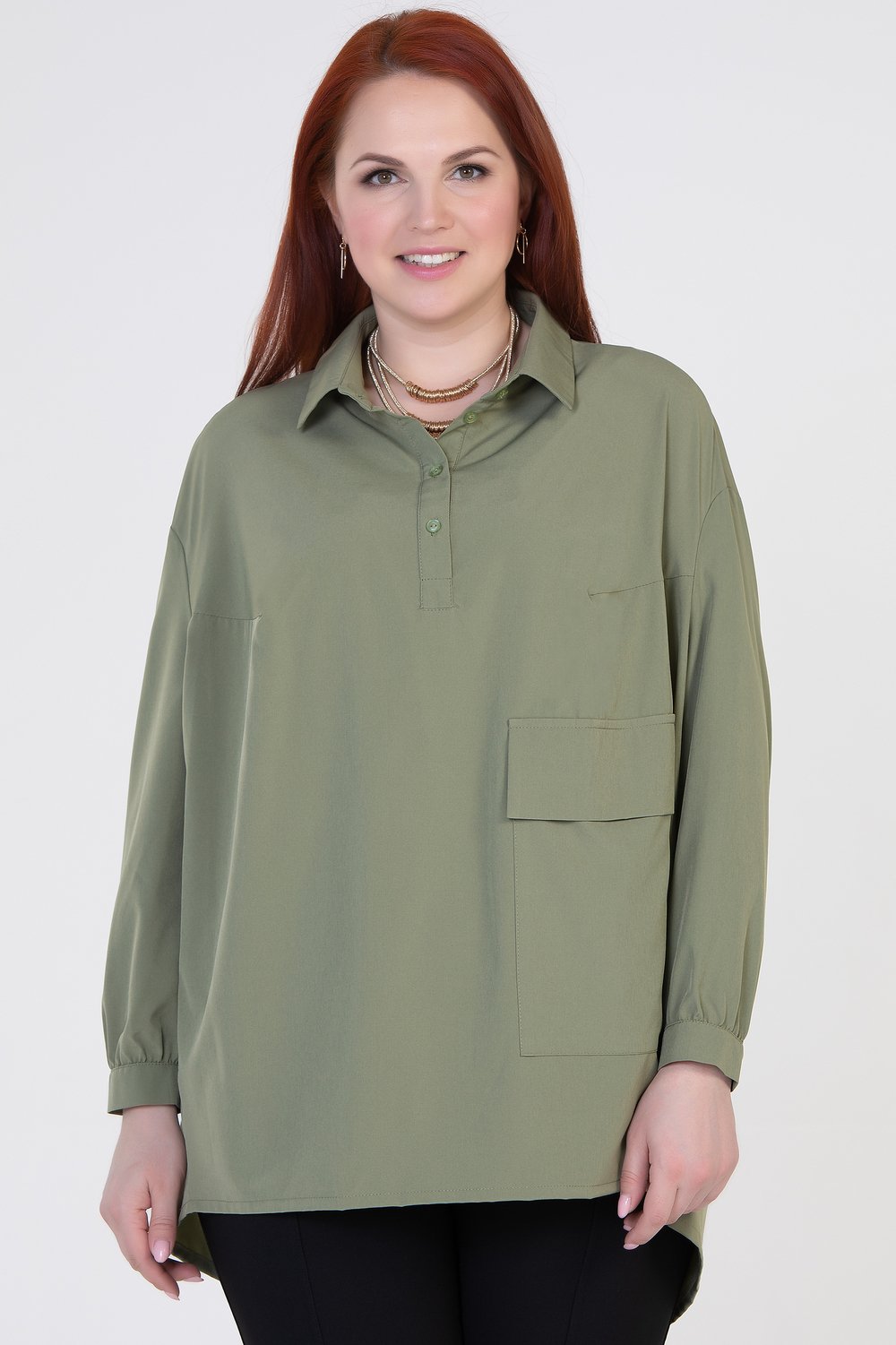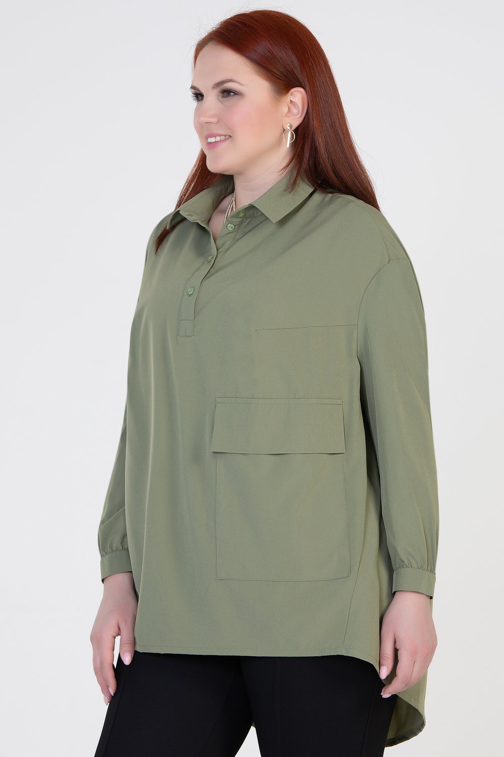 Блуза прямого силуэта, разноуровневая, плечо спущенное. Перед с короткой застежкой в рамку, застегивающейся на три петли и пуговицы, с накладным карманом и клапаном . Спинка с кокеткой. Нижняя часть спинки из двух деталей, с запахом одна на другую, с цельнокроеной планкой и тремя отделочными пуговицами, пришитыми насквозь планок. Рукав втачной, длинный, по низу на притачной манжете, застегивающейся на петлю и пуговицу. По шву притачивания манжеты сборка. Воротник на стойке, застегивающейся на петлю и пуговицу.Характеристики:
