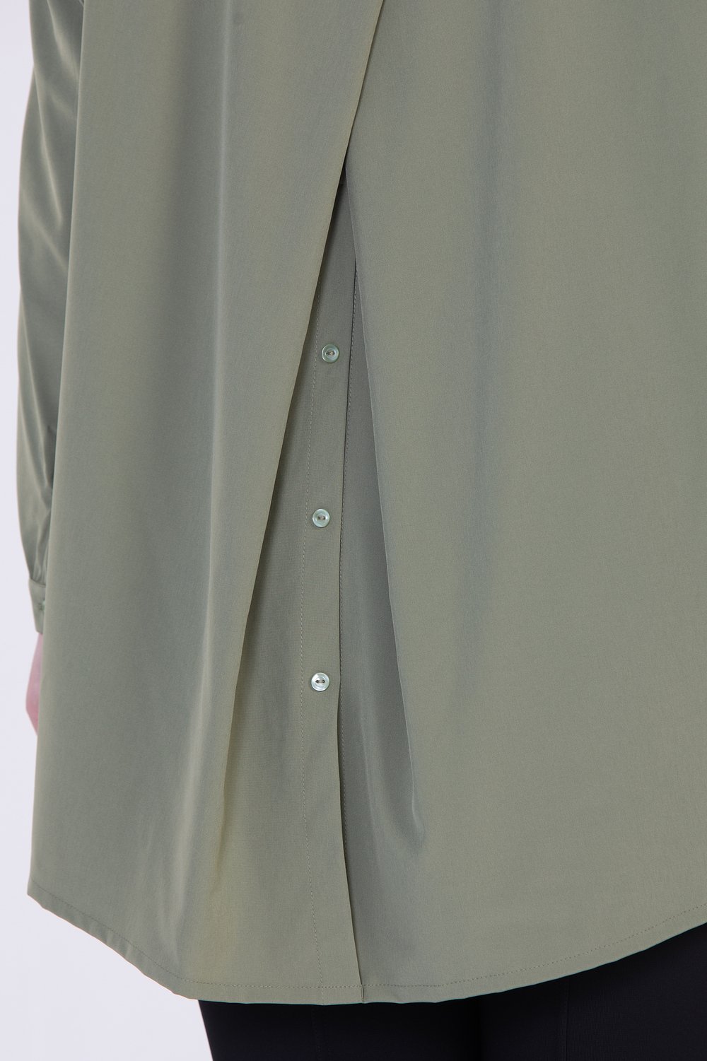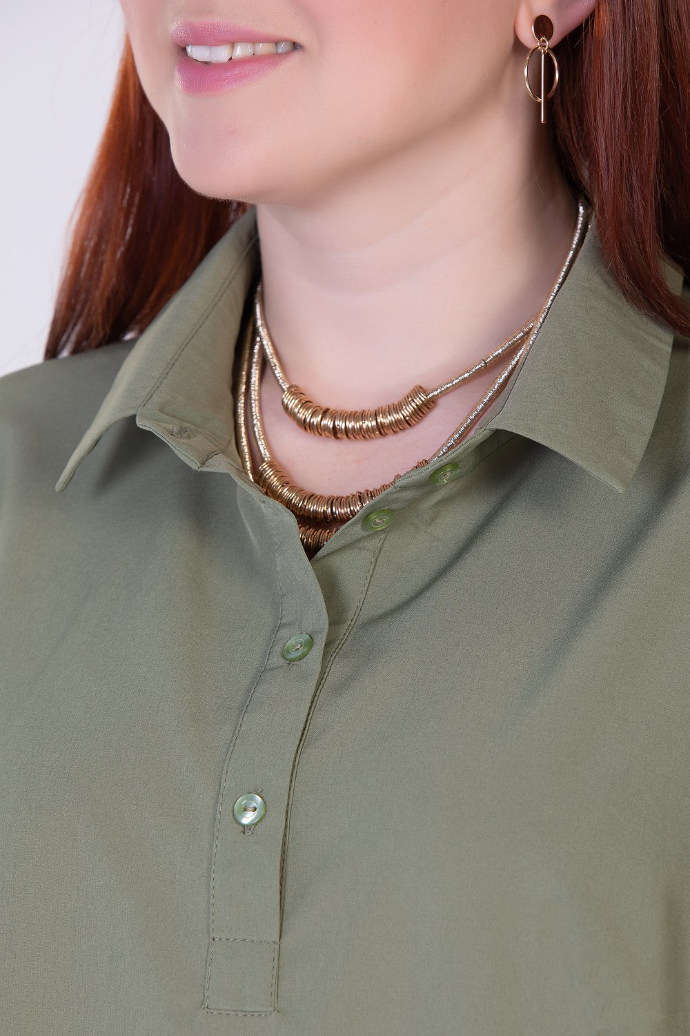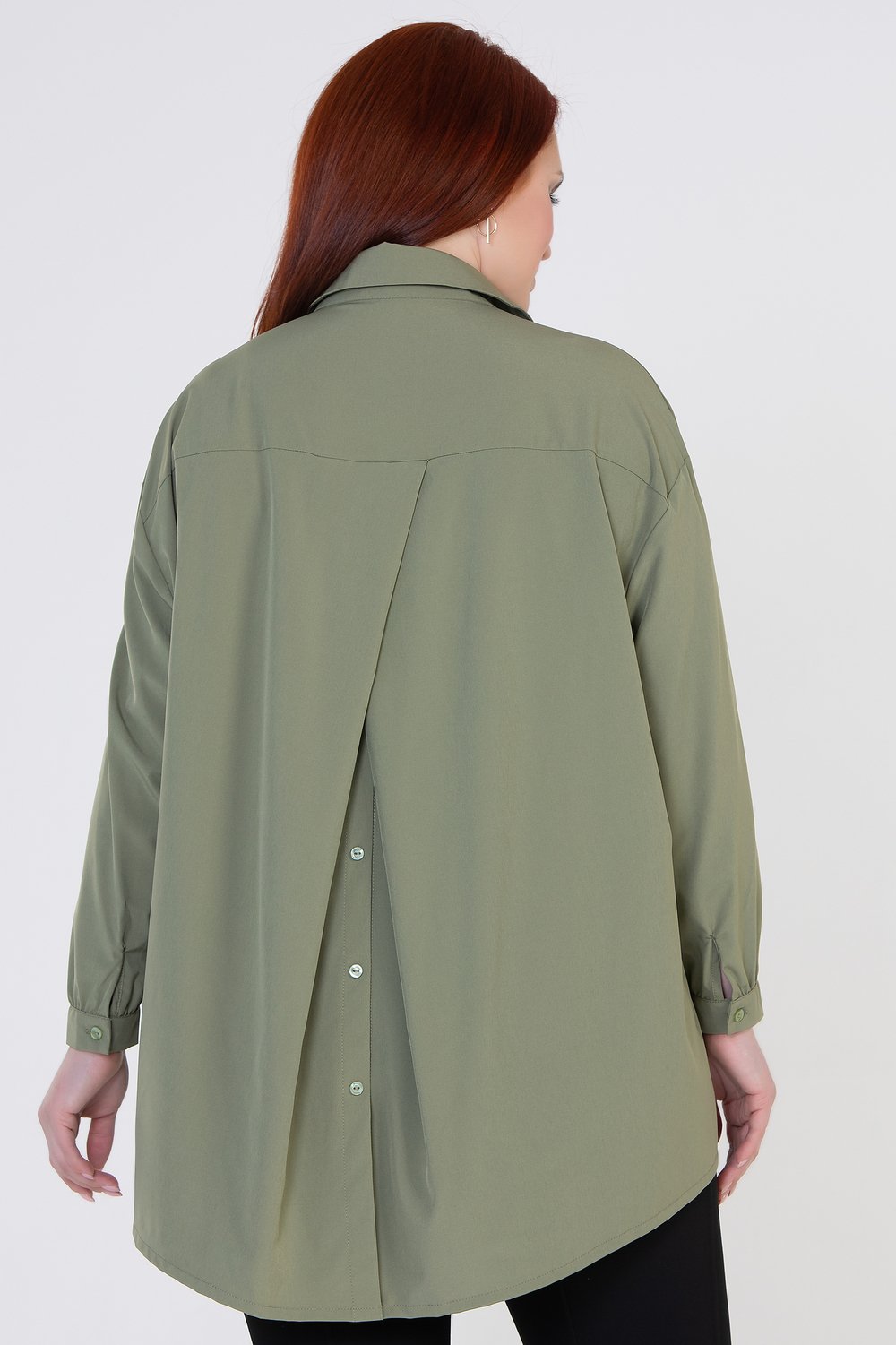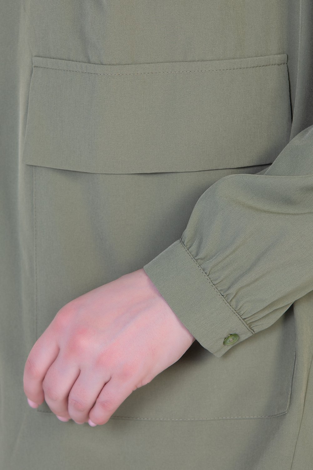 Блуза прямого силуэта, разноуровневая, плечо спущенное. Перед с короткой застежкой в рамку, застегивающейся на три петли и пуговицы, с накладным карманом и клапаном . Спинка с кокеткой. Нижняя часть спинки из двух деталей, с запахом одна на другую, с цельнокроеной планкой и тремя отделочными пуговицами, пришитыми насквозь планок. Рукав втачной, длинный, по низу на притачной манжете, застегивающейся на петлю и пуговицу. По шву притачивания манжеты сборка. Воротник на стойке, застегивающейся на петлю и пуговицу.Характеристики: