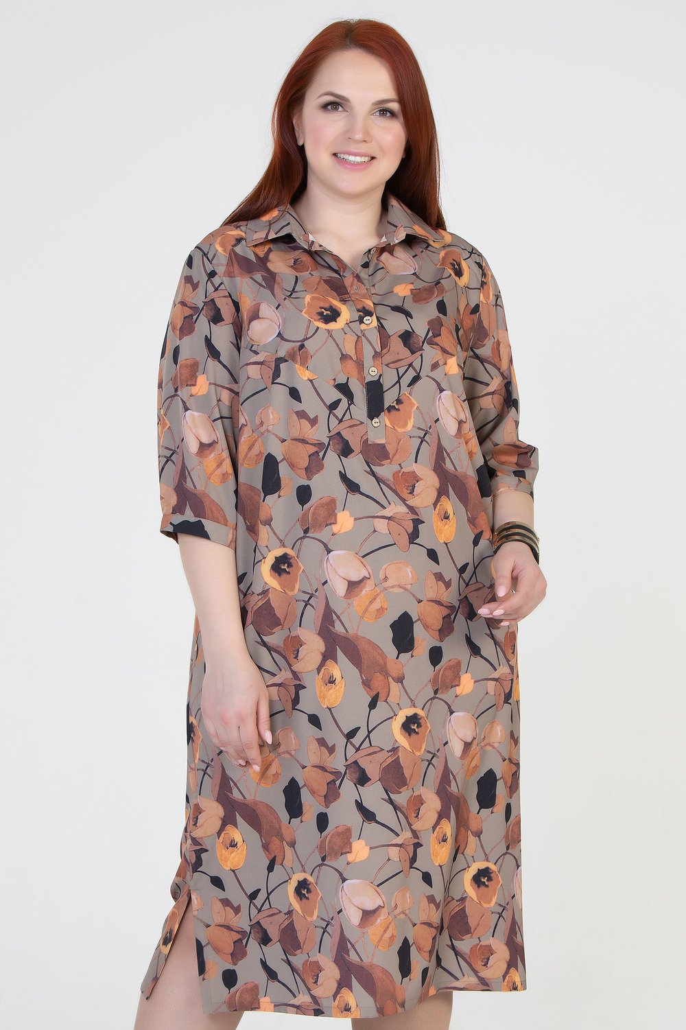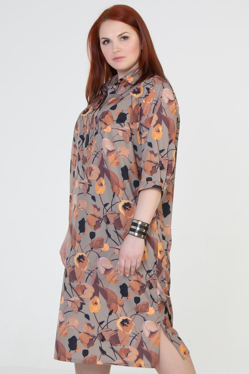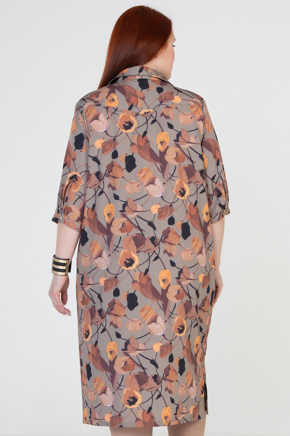 Платье прямого силуэта из плотной плательной ткани с оригинальным принтом. Изюминкой платья является рубашечный воротник и планка, застегивающаяся на пуговицы. Рукав втачной, длиной 3/4, на манжете и пуговице. В боковых швах карманы, а внизу платья разрезы.Характеристики: