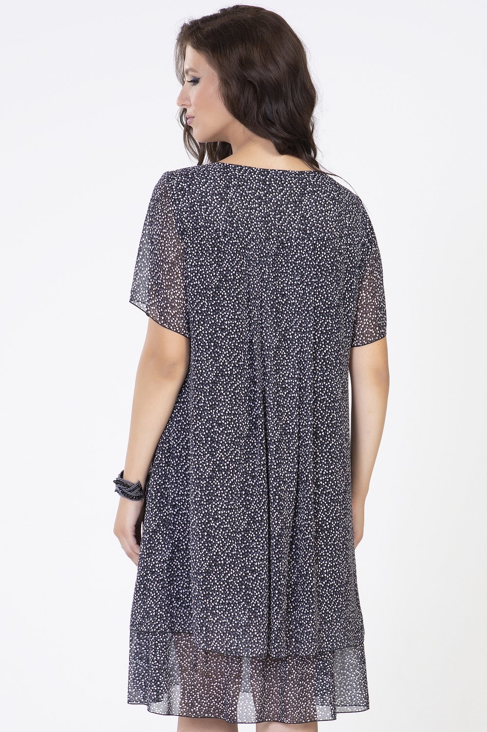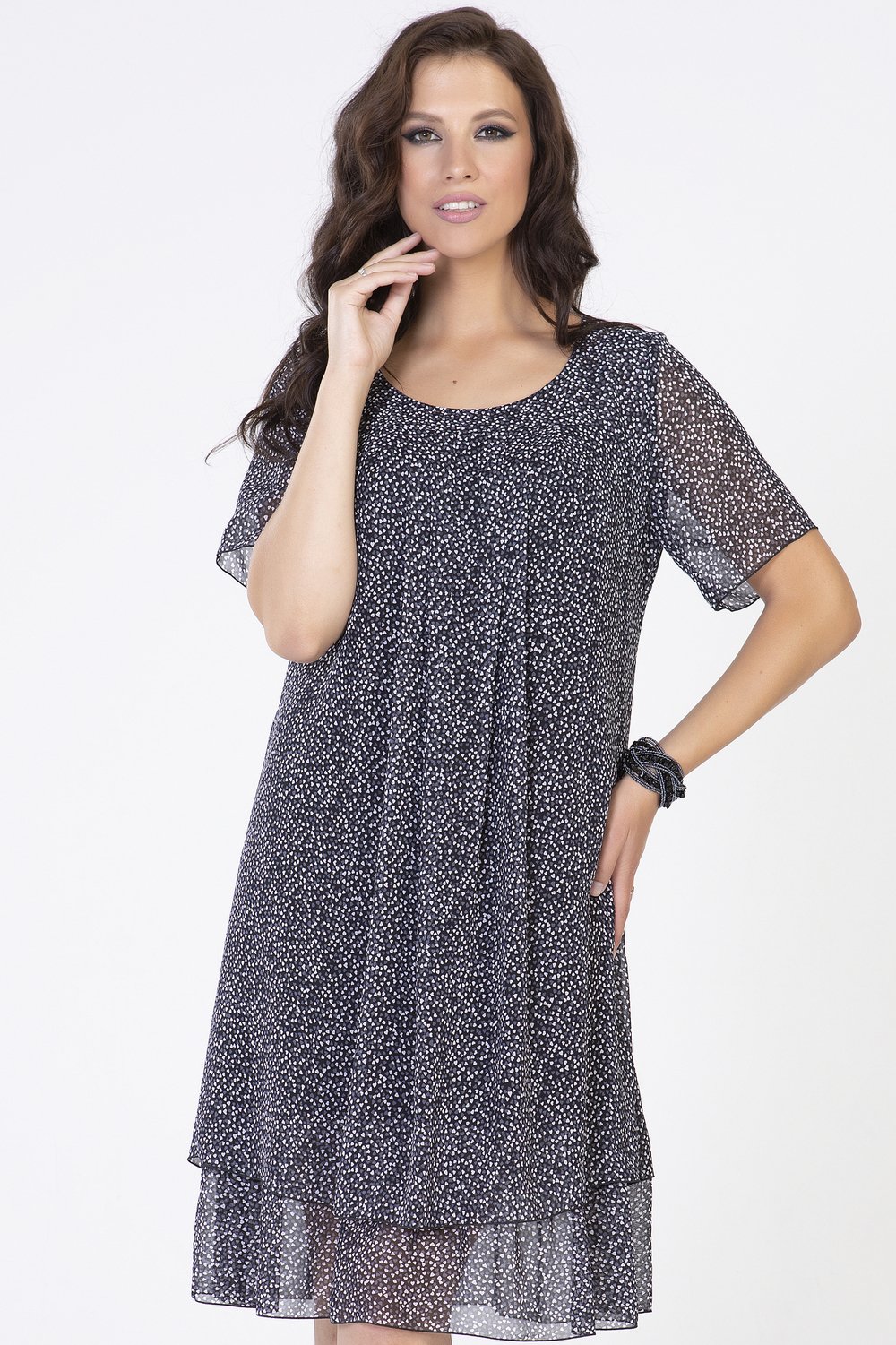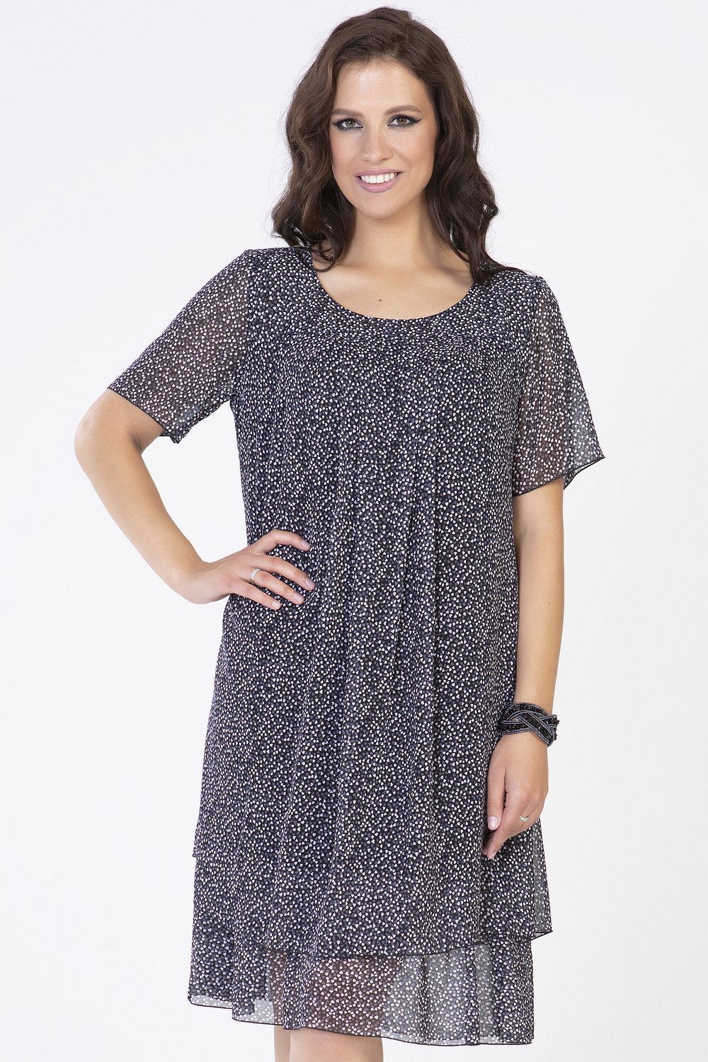 Платье трапециевидного силуэта, с кокеткой по переду и спинке. Горловина круглая, рукав втачной, короткий. Нижняя часть переда и спинки с застроченными складками, на подкладке. По низу подкладки-притачная оборка из основной ткани, собранная в сборку.Характеристики: