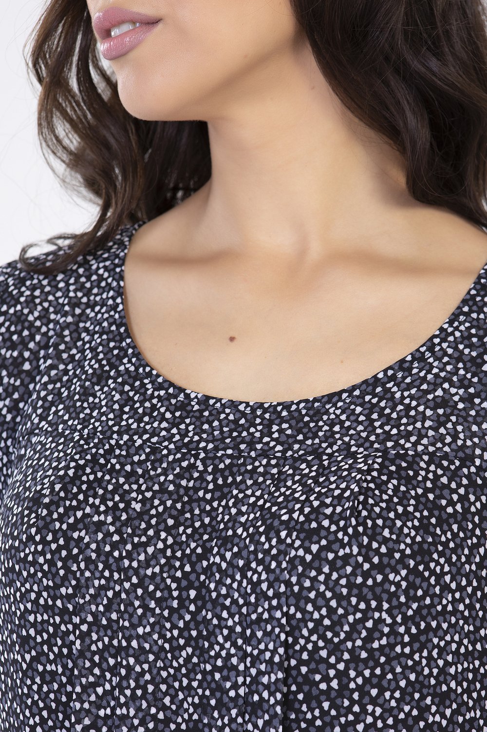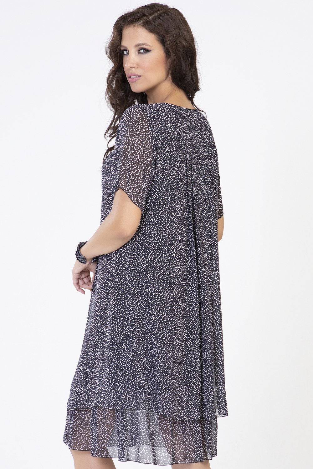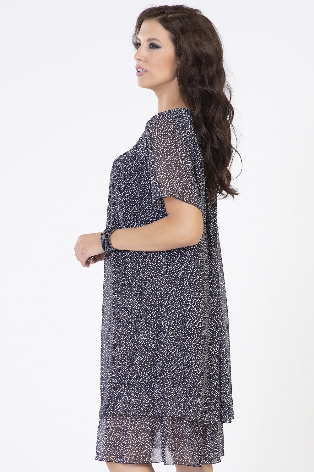 Платье трапециевидного силуэта, с кокеткой по переду и спинке. Горловина круглая, рукав втачной, короткий. Нижняя часть переда и спинки с застроченными складками, на подкладке. По низу подкладки-притачная оборка из основной ткани, собранная в сборку.Характеристики: