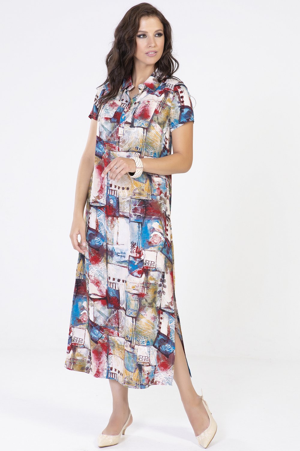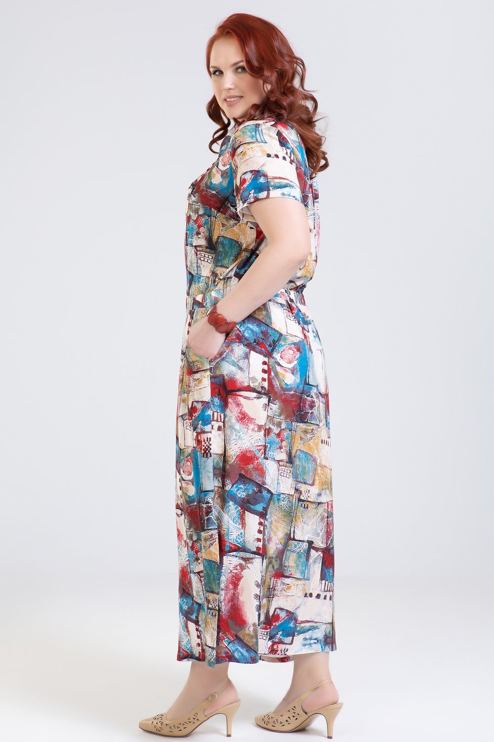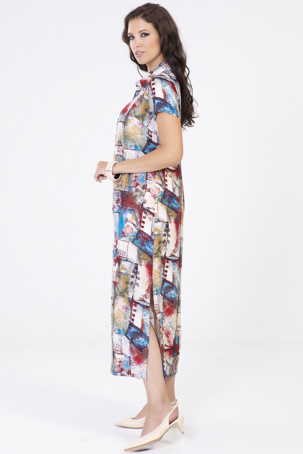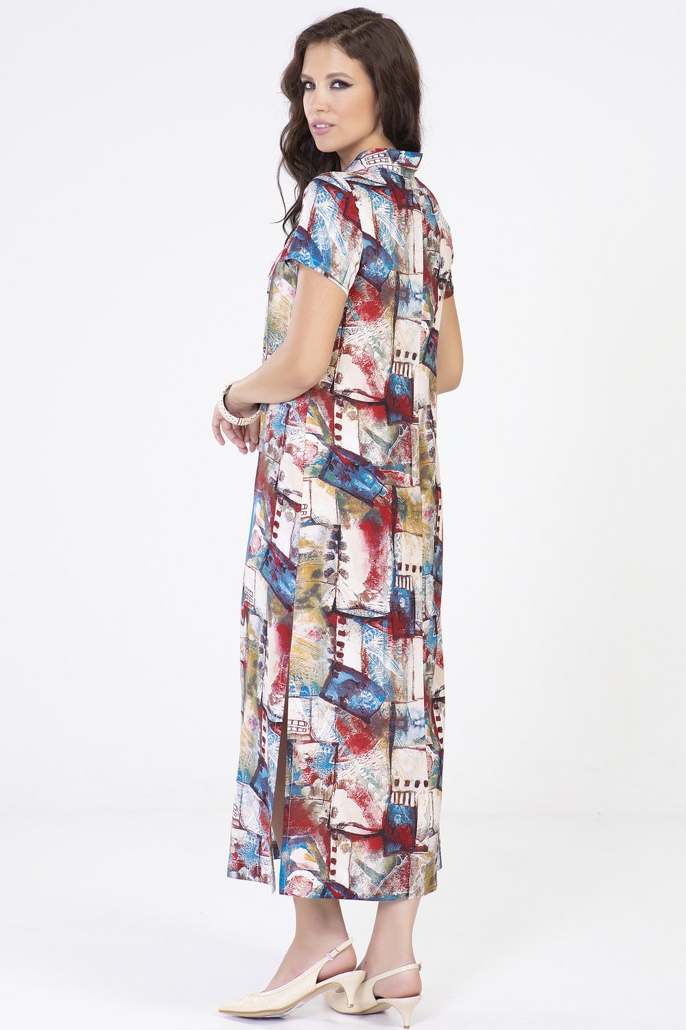 Платье прямого силуэта, с кокеткой по переду и спинке, с втачной кулисой ниже линии талии, с боковыми разрезами и карманами. Перед с планкой, застегивающейся на петли и пуговицы. Воротник на стойке. Рукав втачной, короткий. Кулиса с эластичной тесьмой по спинке.Характеристики: