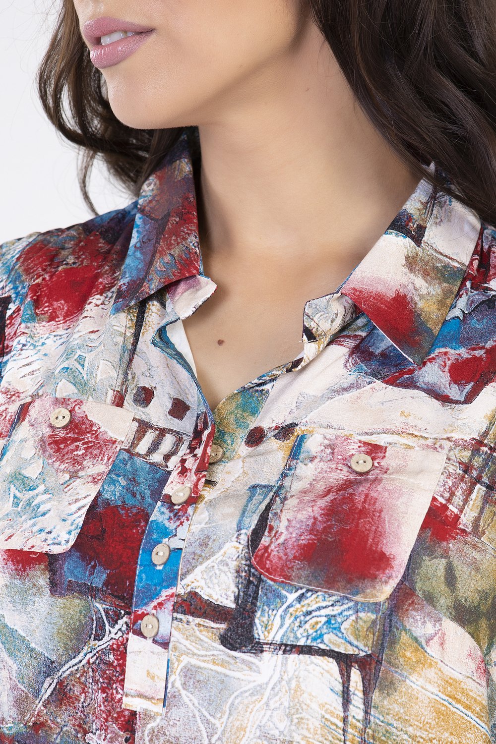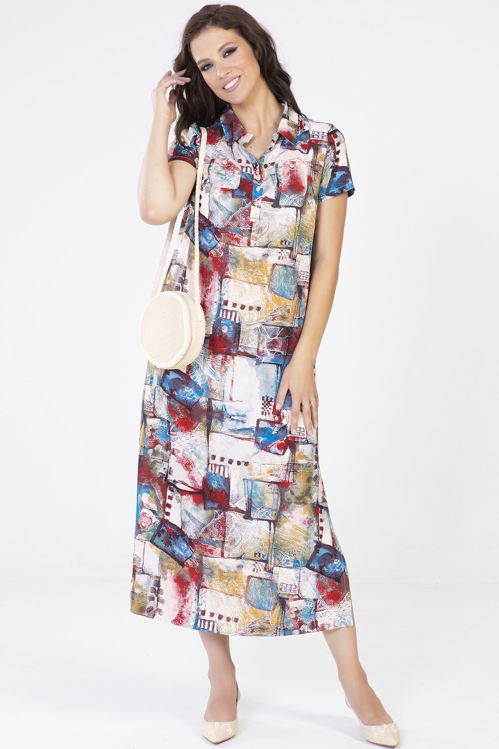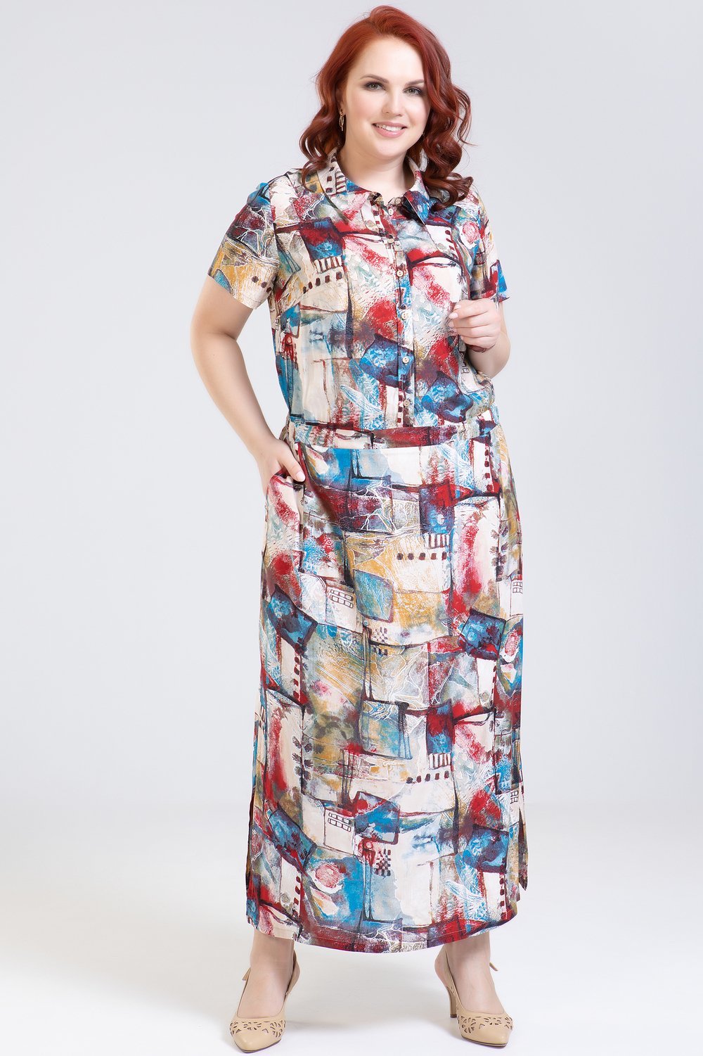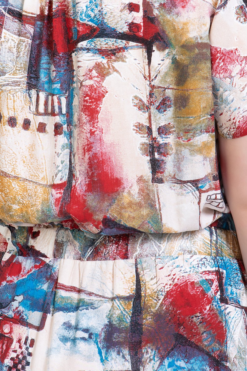 Платье прямого силуэта, с кокеткой по переду и спинке, с втачной кулисой ниже линии талии, с боковыми разрезами и карманами. Перед с планкой, застегивающейся на петли и пуговицы. Воротник на стойке. Рукав втачной, короткий. Кулиса с эластичной тесьмой по спинке.Характеристики: