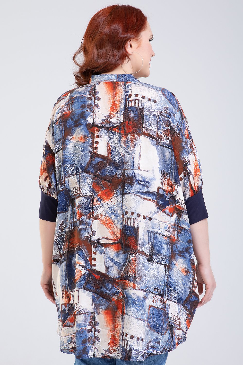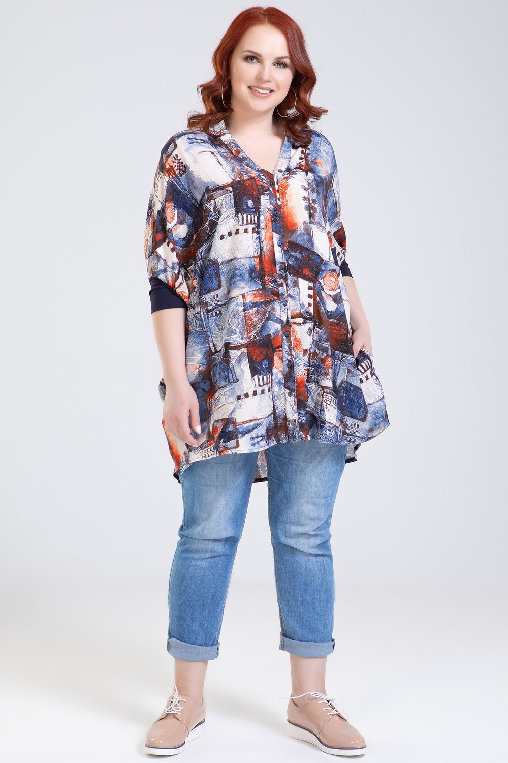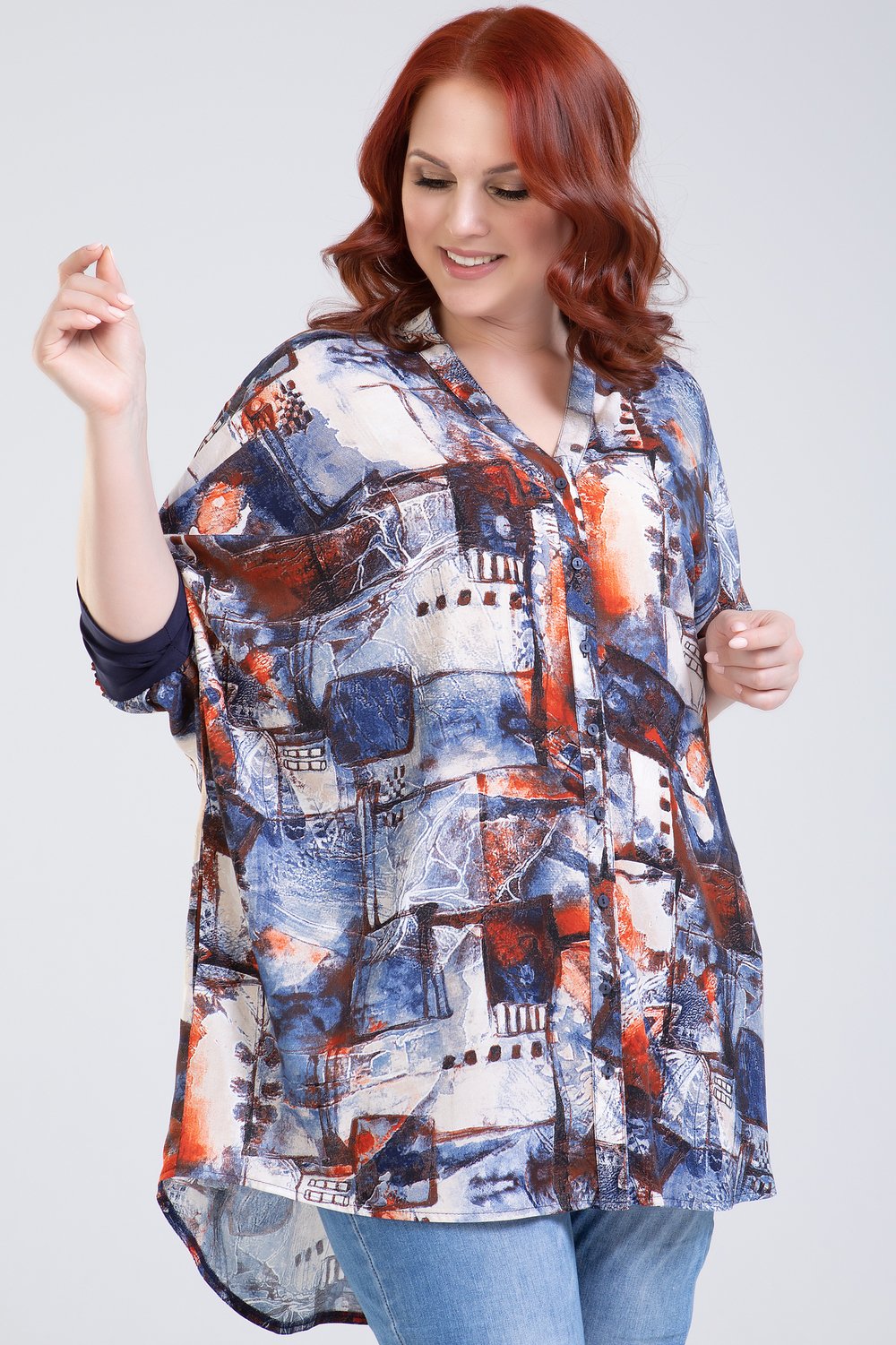 Блуза прямого силуэта, разноуровневая, с карманами в боковых швах. Рукав цельнокроеный, с притачной манжетой из трикотажного полотна. Перед с фигурной планкой, застегивающейся на петли и пуговицы. Стойка притачная.Характеристики: