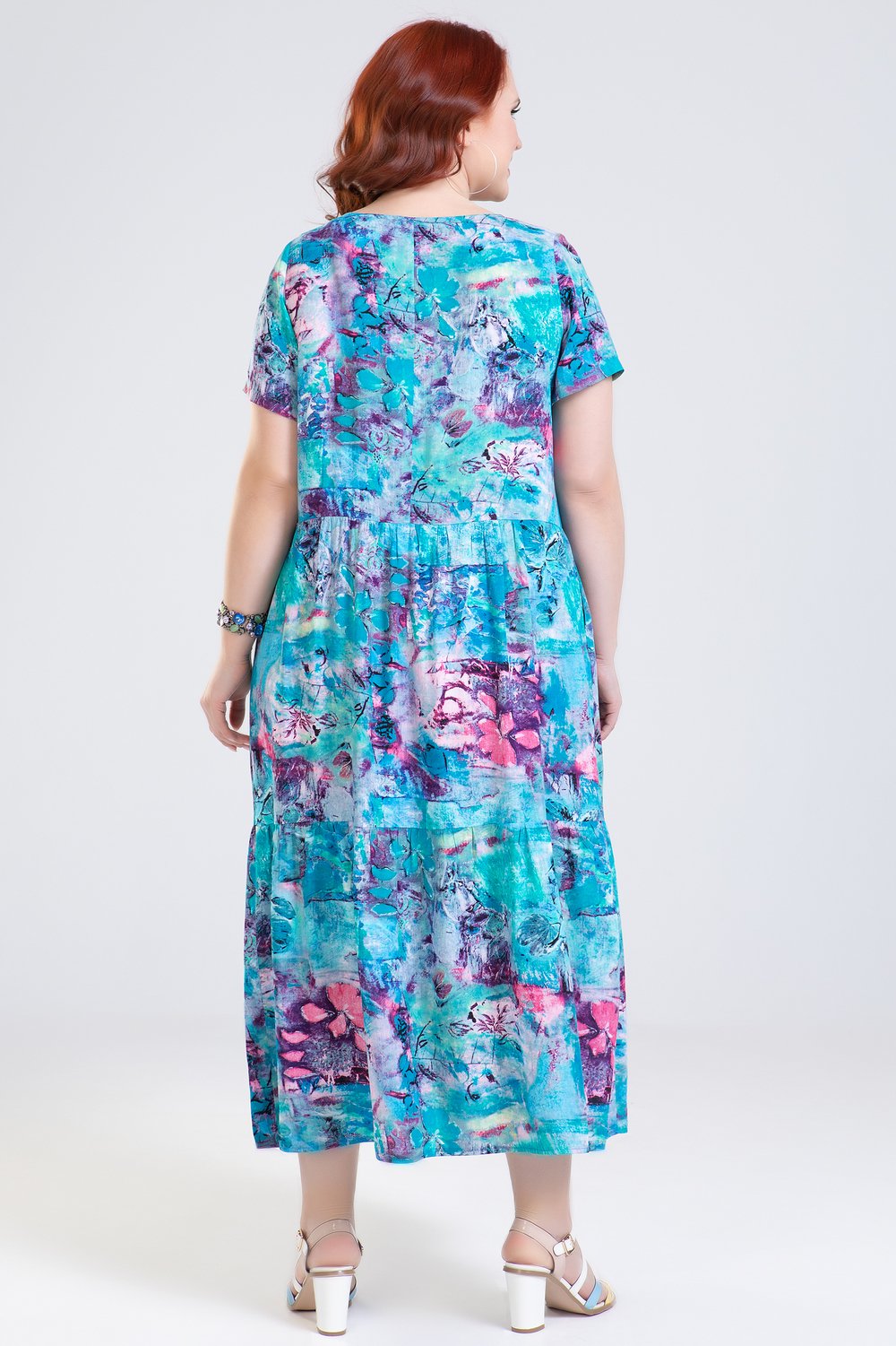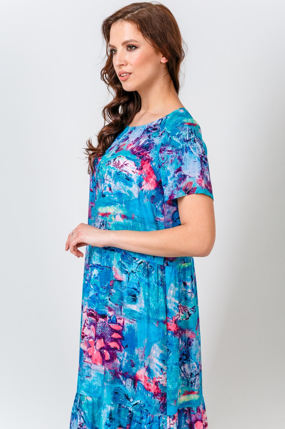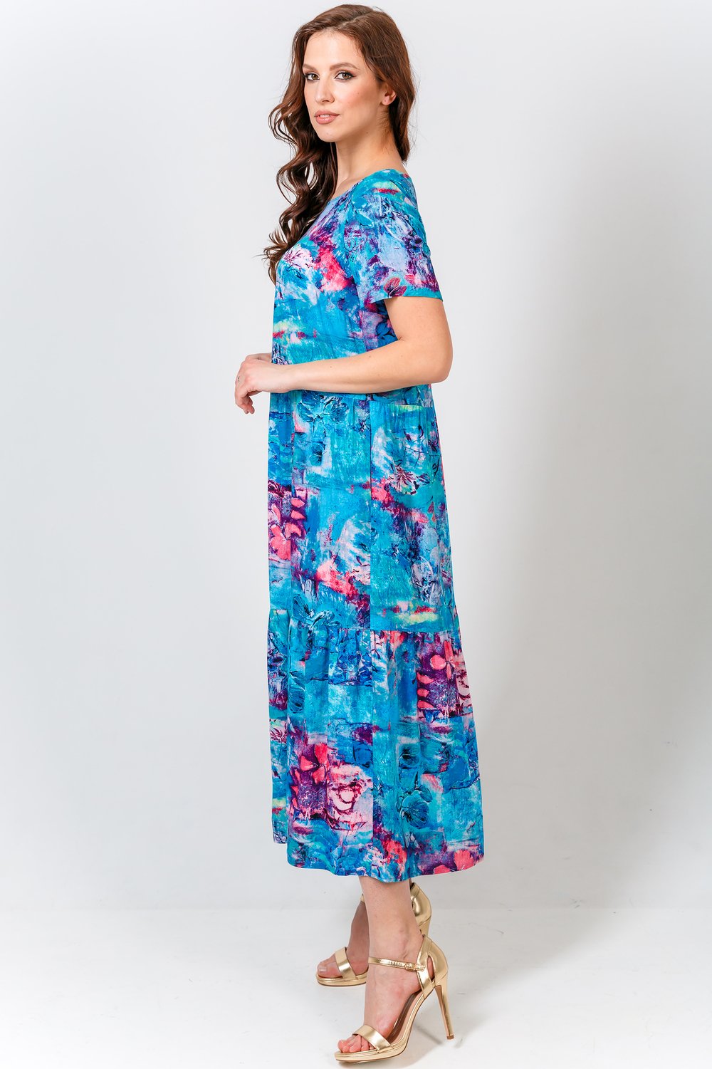 Платье трапециевидного силуэта, отрезное выше линии талии, с карманами в боковых швах. Нижняя часть переда и спинки из двух воланов, собранных в сборку.