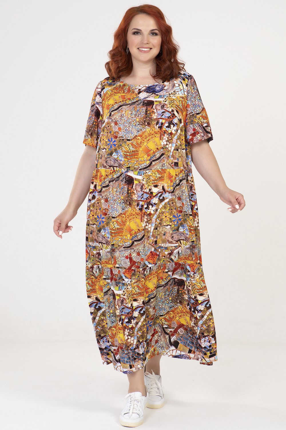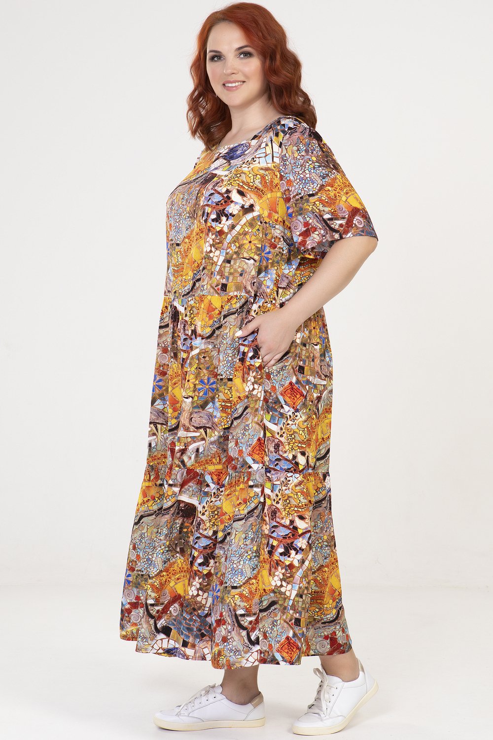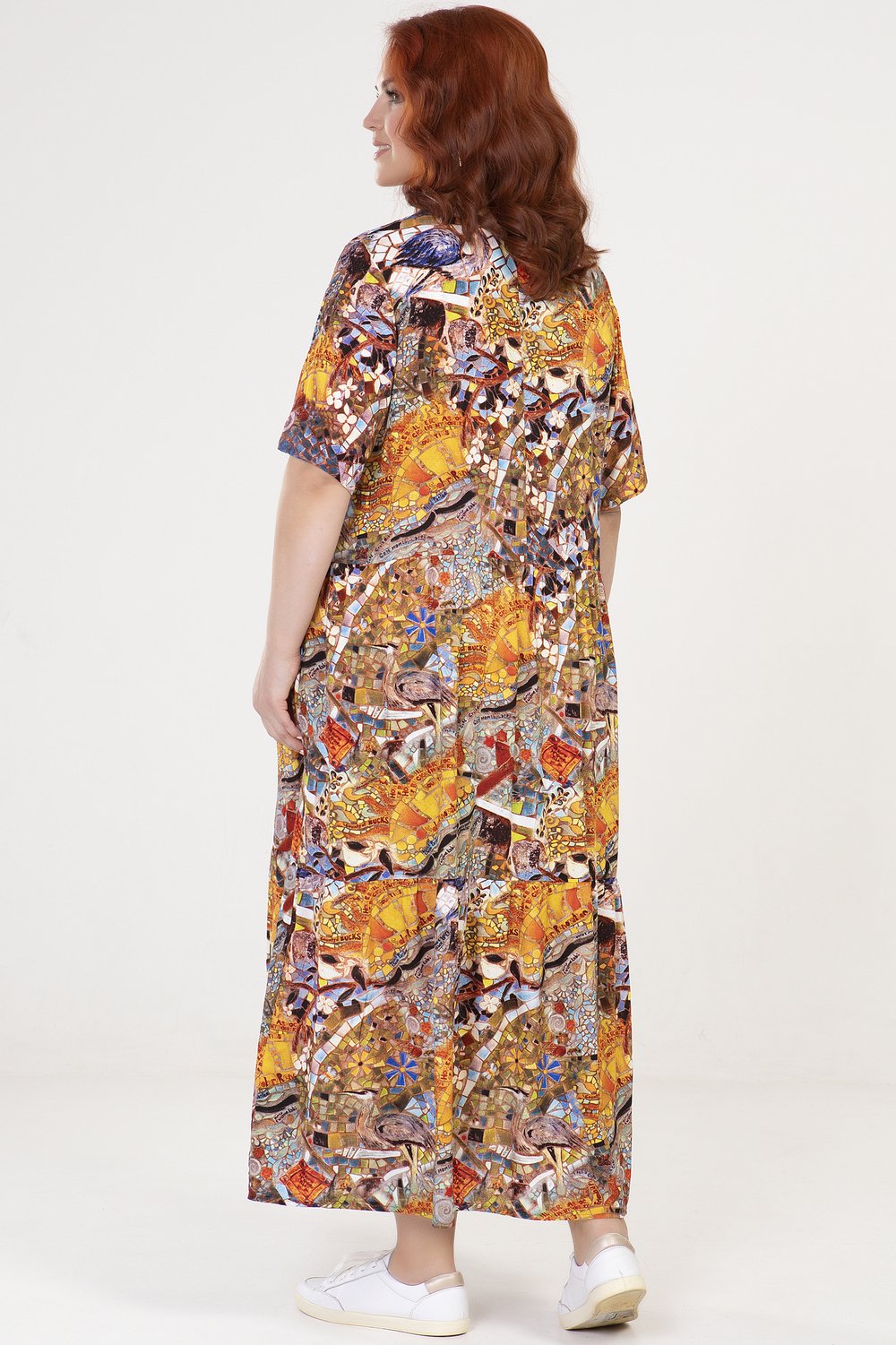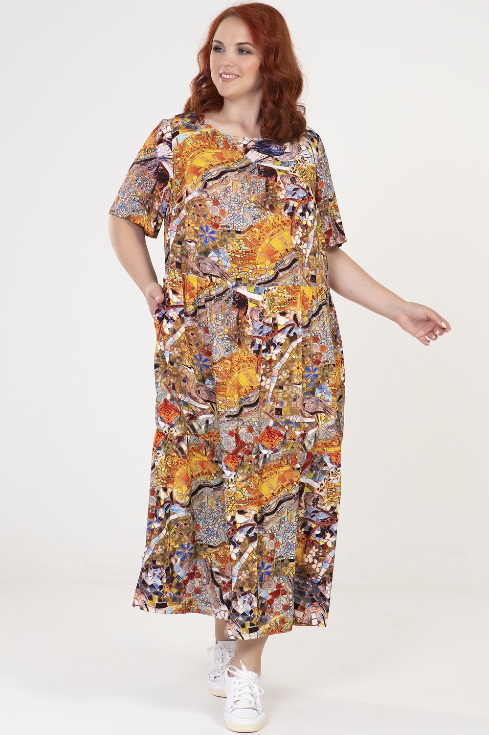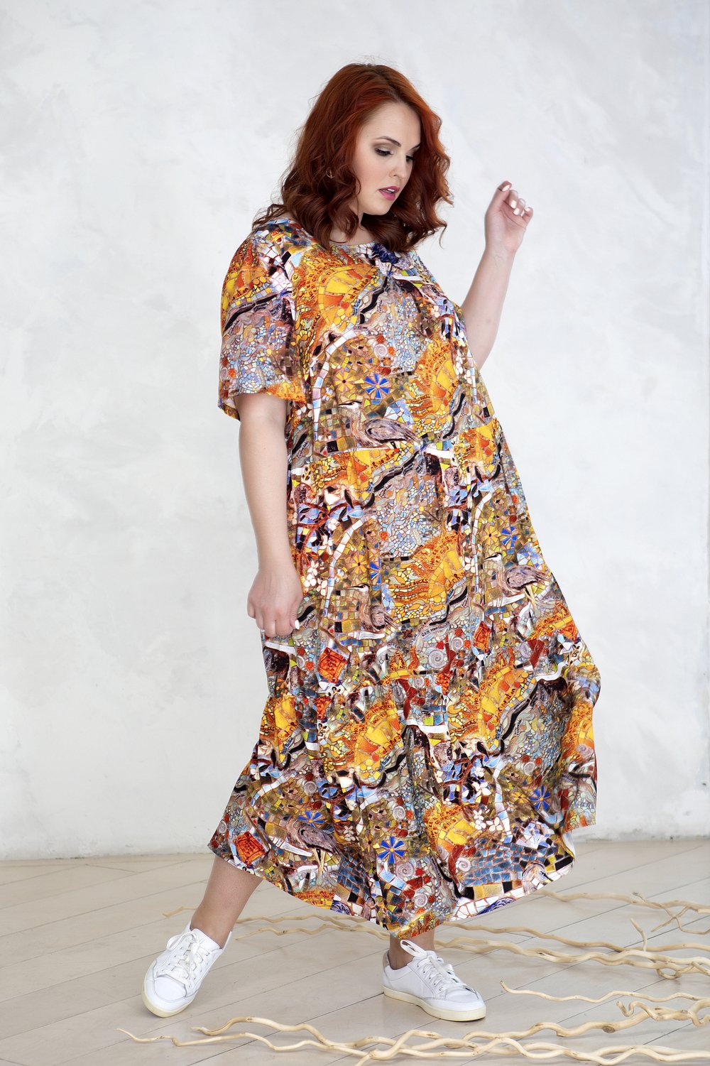 Платье трапециевидного силуэта, отрезное выше линии талии, с карманами в боковых швах. Нижняя часть переда и спинки из двух воланов, собранных в сборку.