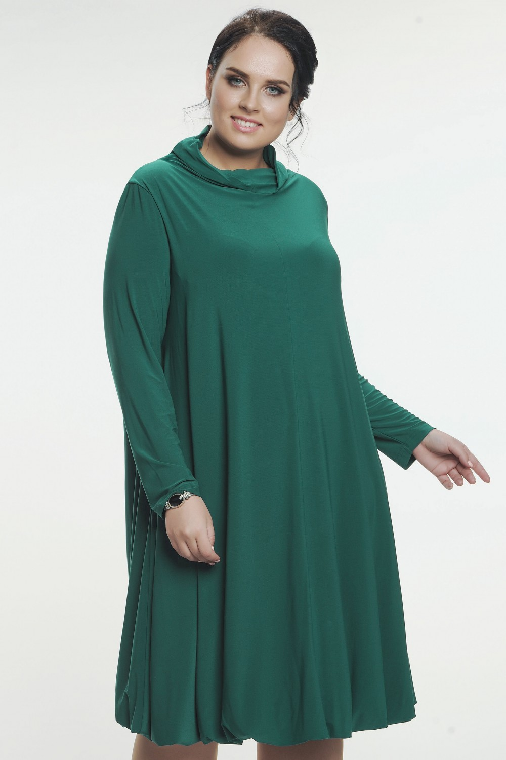 Платье-баллон трапециевидного силуэта, на подкладе, с цельно кроенным воротником-хомутиком. Длинный, втачной рукав. Эффект баллона создан за счет сборки ткани верха платья. Мягкое тонкое трикотажное полотно.