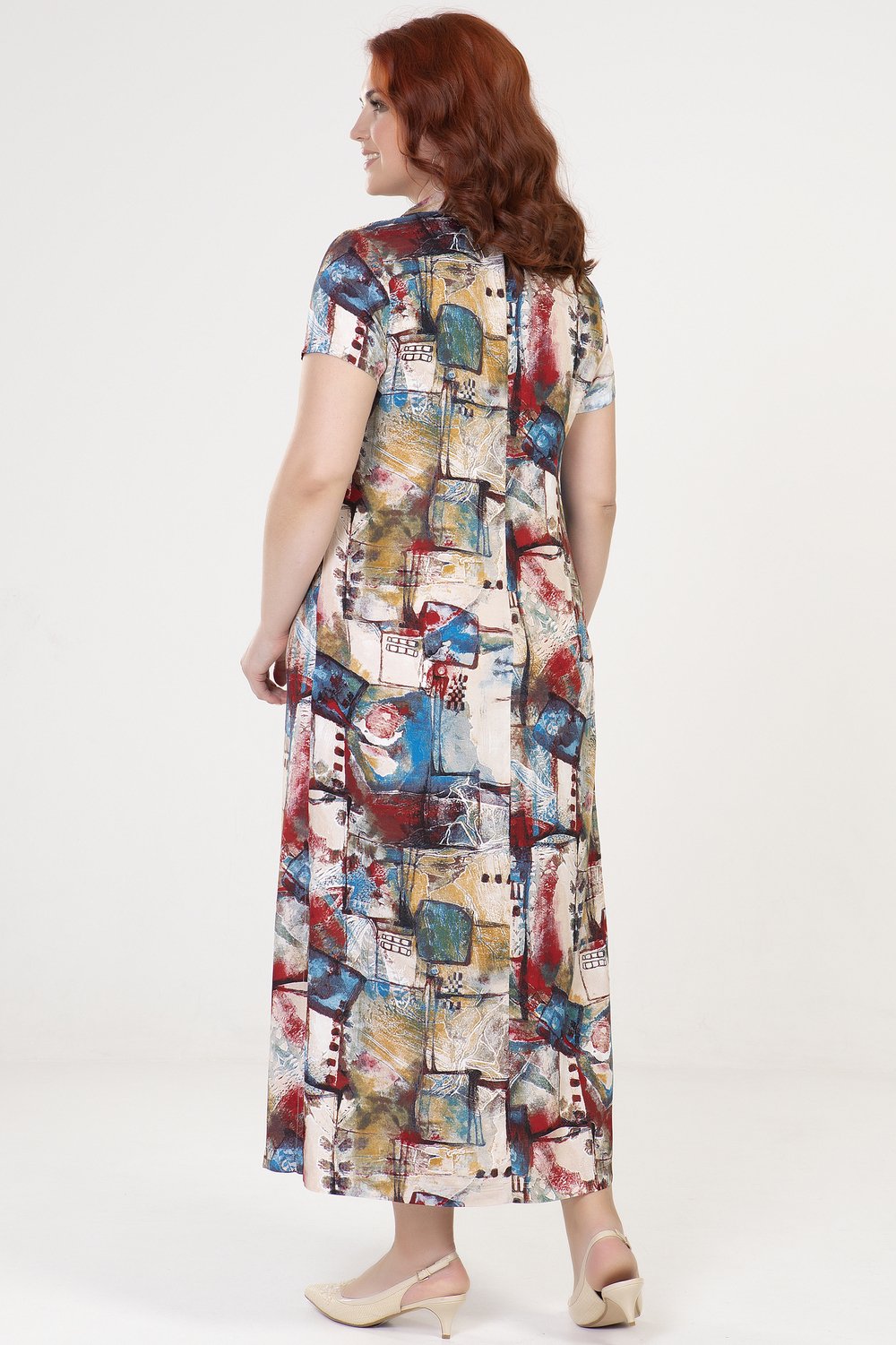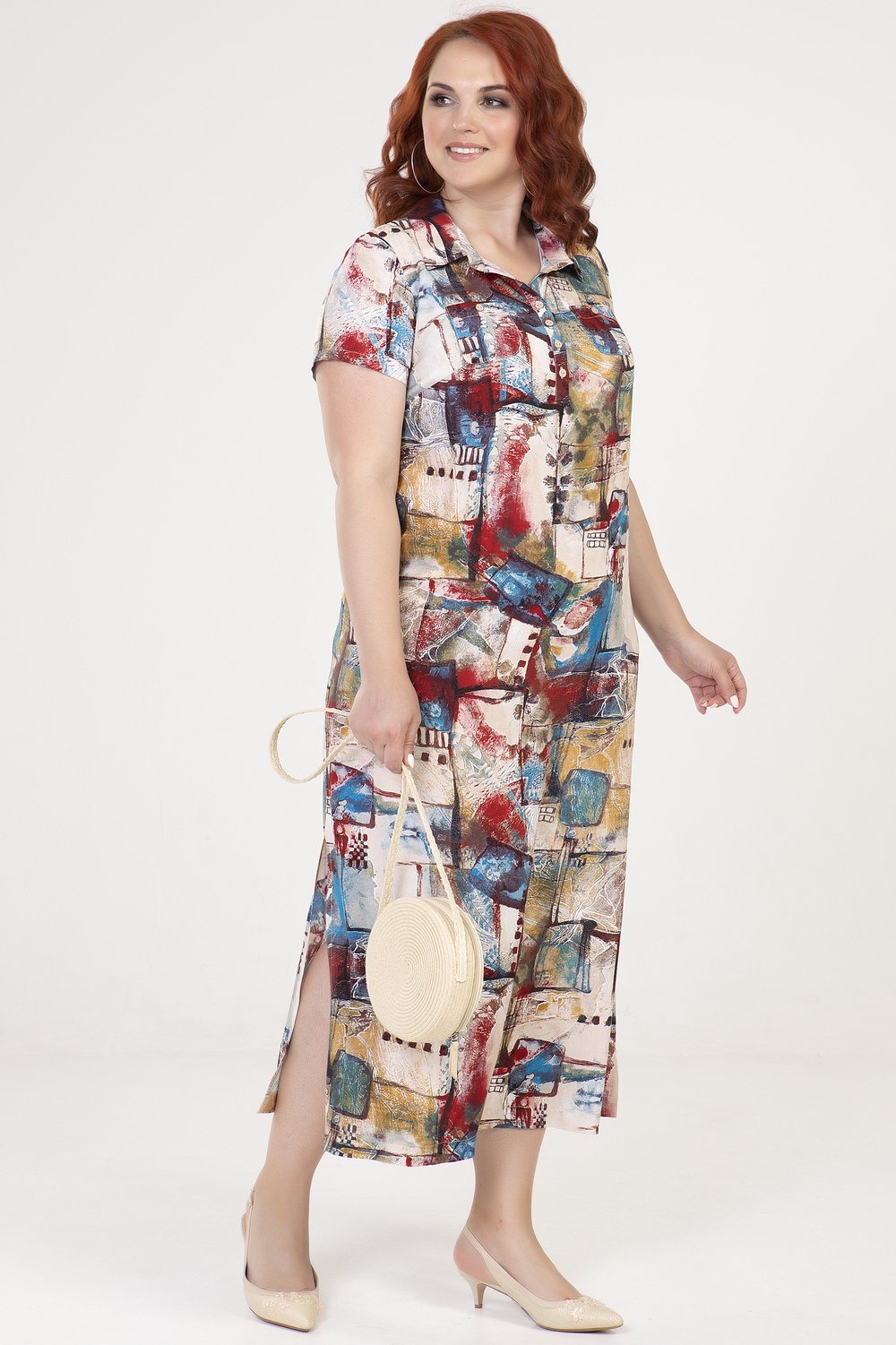 Платье полуприлегающего силуэта, с разрезами в боковых швах. Рукав короткий. Перед с накладными карманами и планкой, застегивающейся на петли и пуговицы. Воротник отложной на стойке.