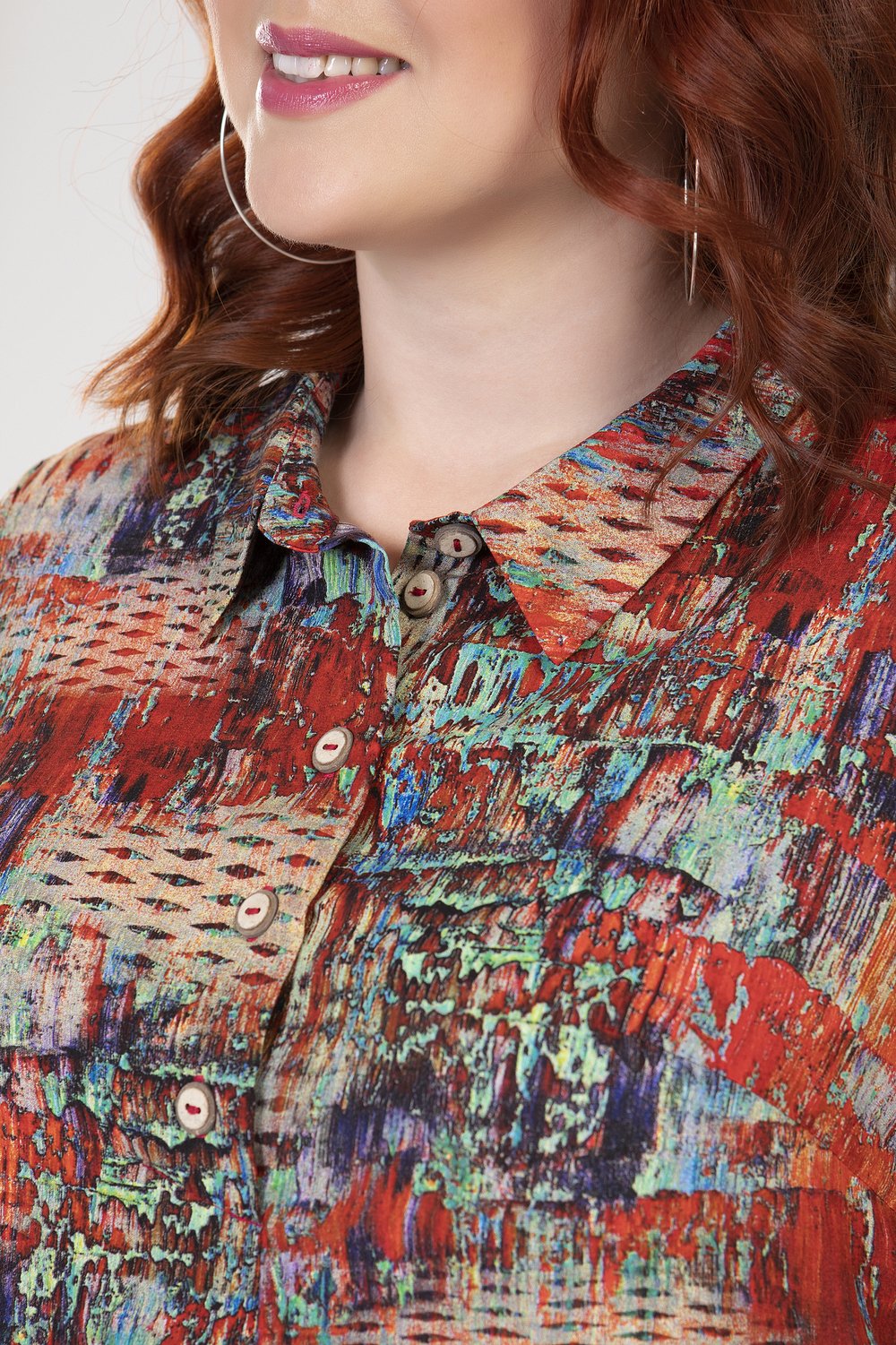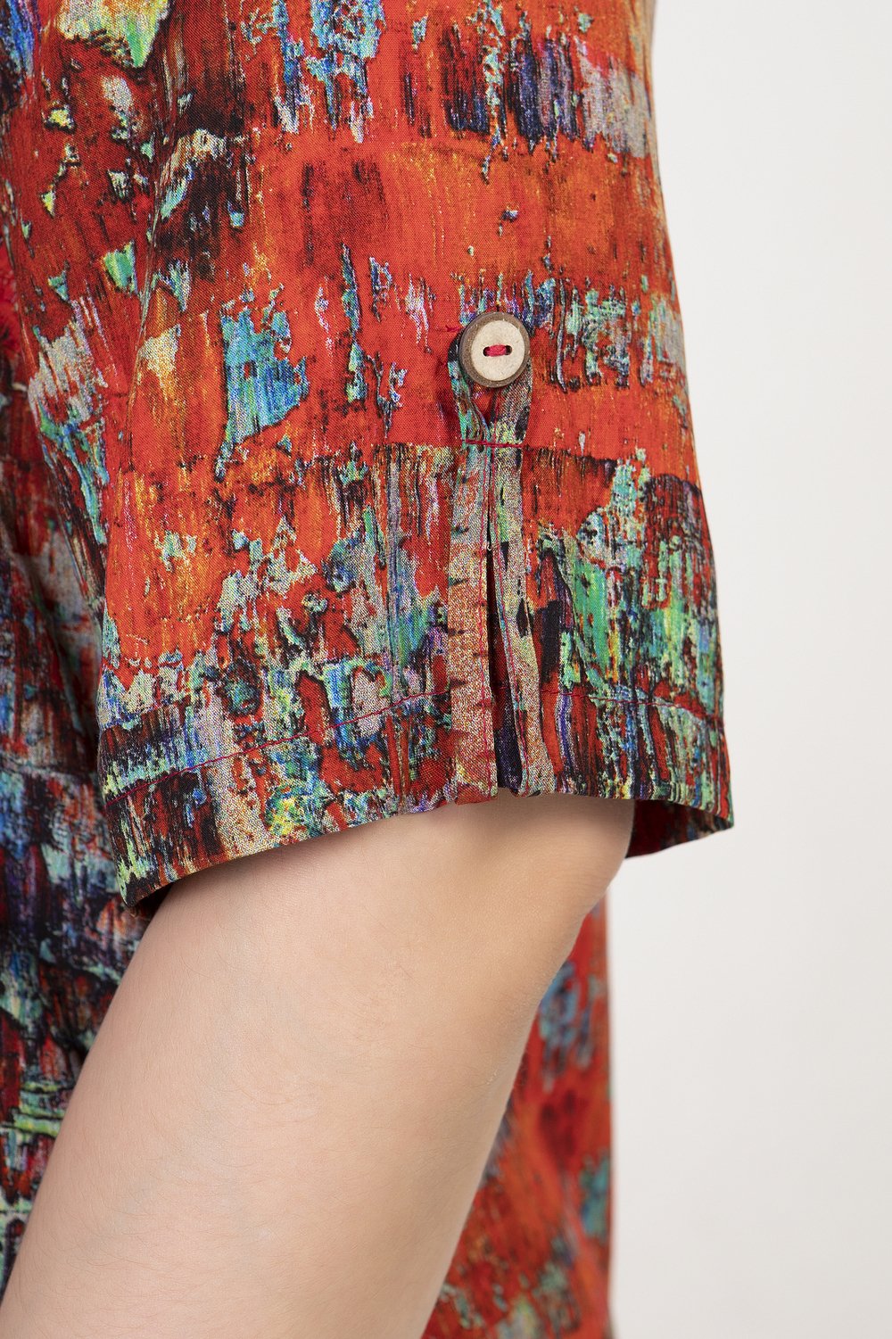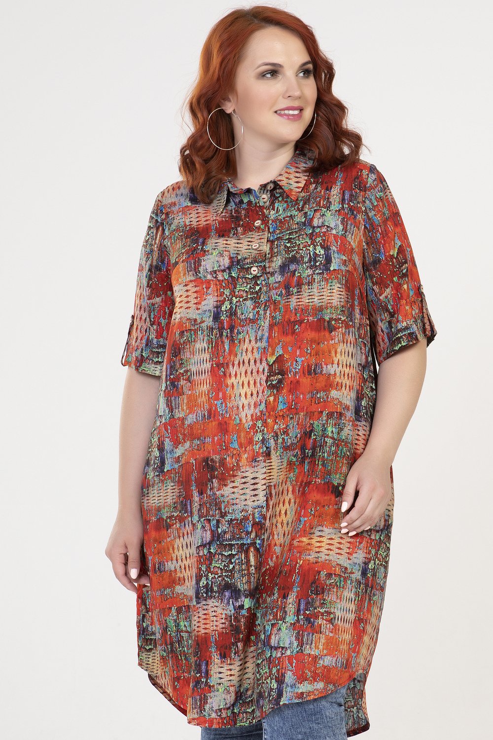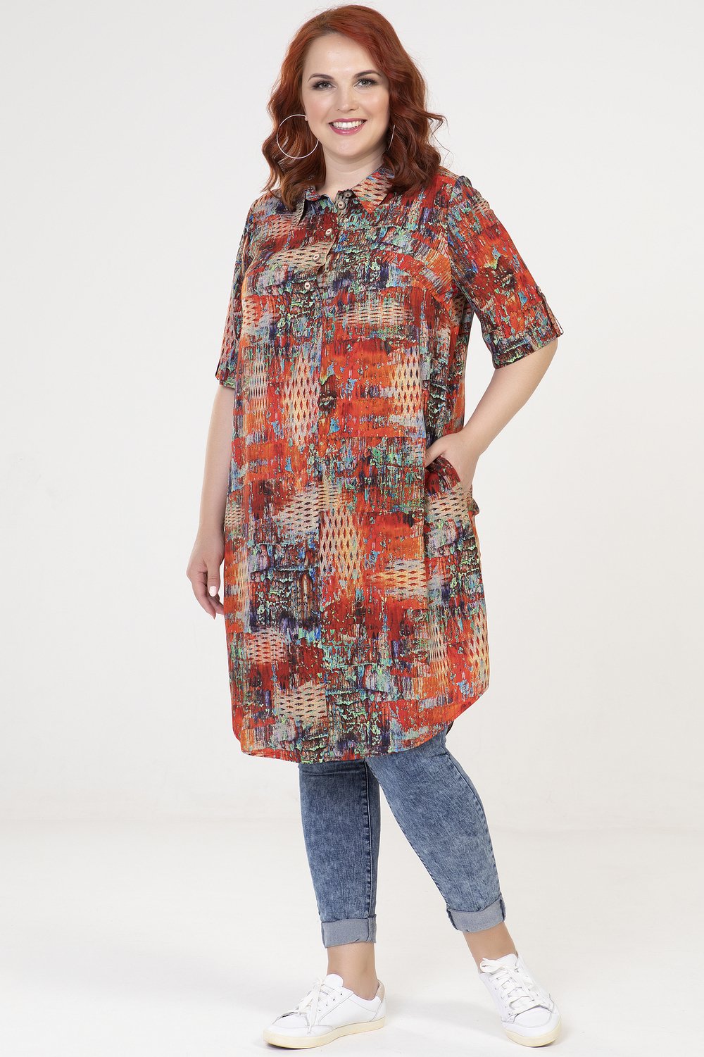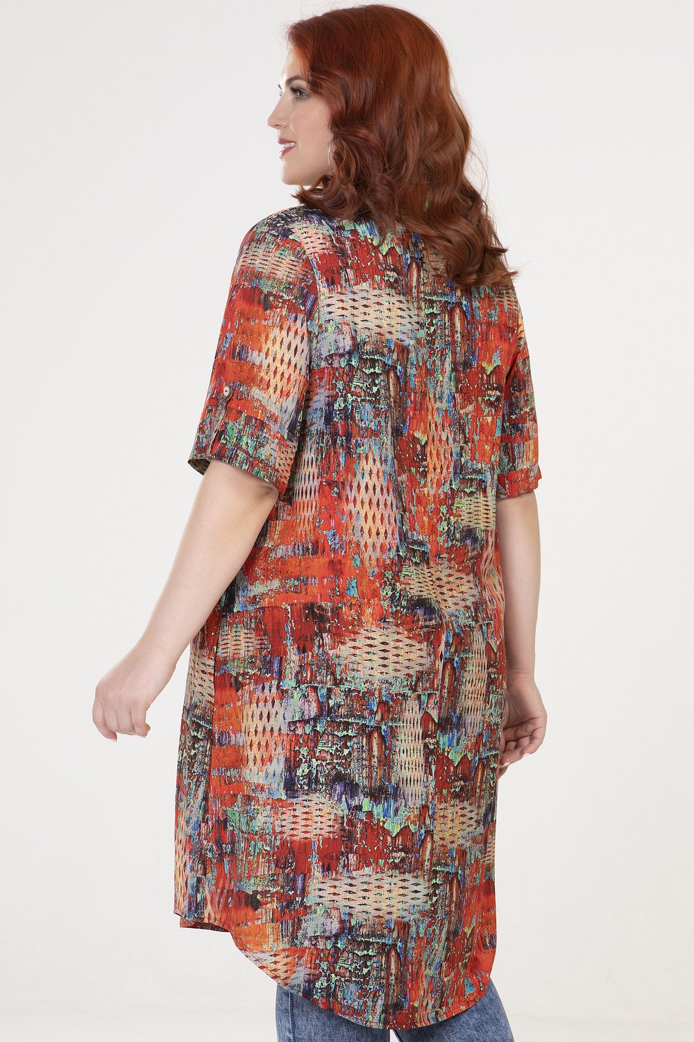 Туника прямого силуэта, с карманами в боковых швах. Перед с короткой застежкой в среднем шве на петли и пуговицы. Рукав втачной, короткий, посередине с патой из окантовочной бейки, застегивающейся на пуговицу. Воротник на стойке.Характеристики: