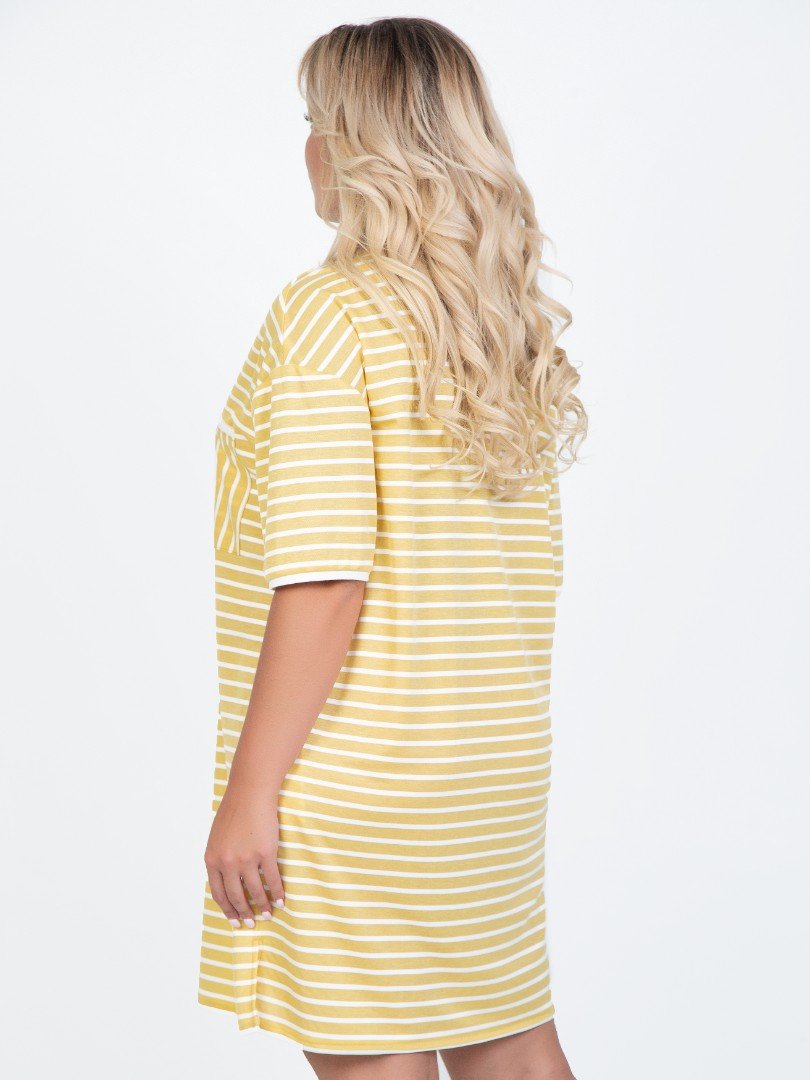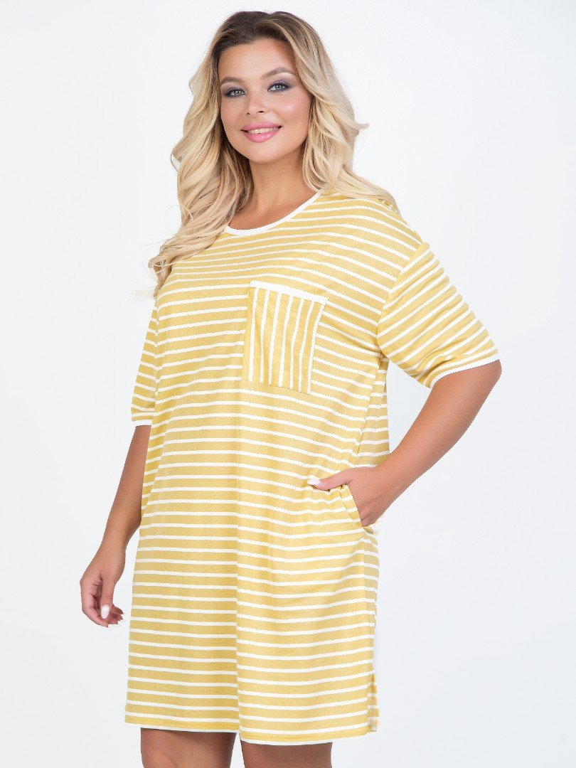 Платье прямого силуэта , выполнено из приятной вискозного трикотажа. -принт “полоска“ -круглая горловина с контрастной бейкой -в боковых швах внутренние карманы -рукава втачные, короткие на манжете из подвяза -спереди накладной карман -низ ровный, с разрезами по бокам -без подклада и застежекХарактеристики: