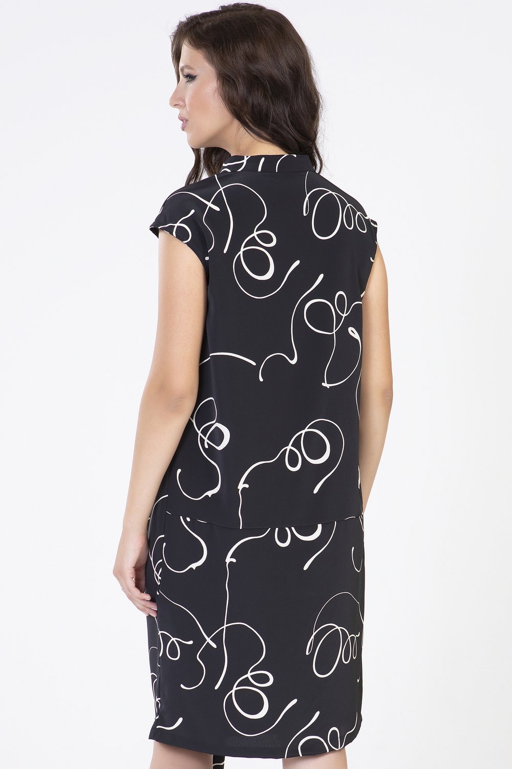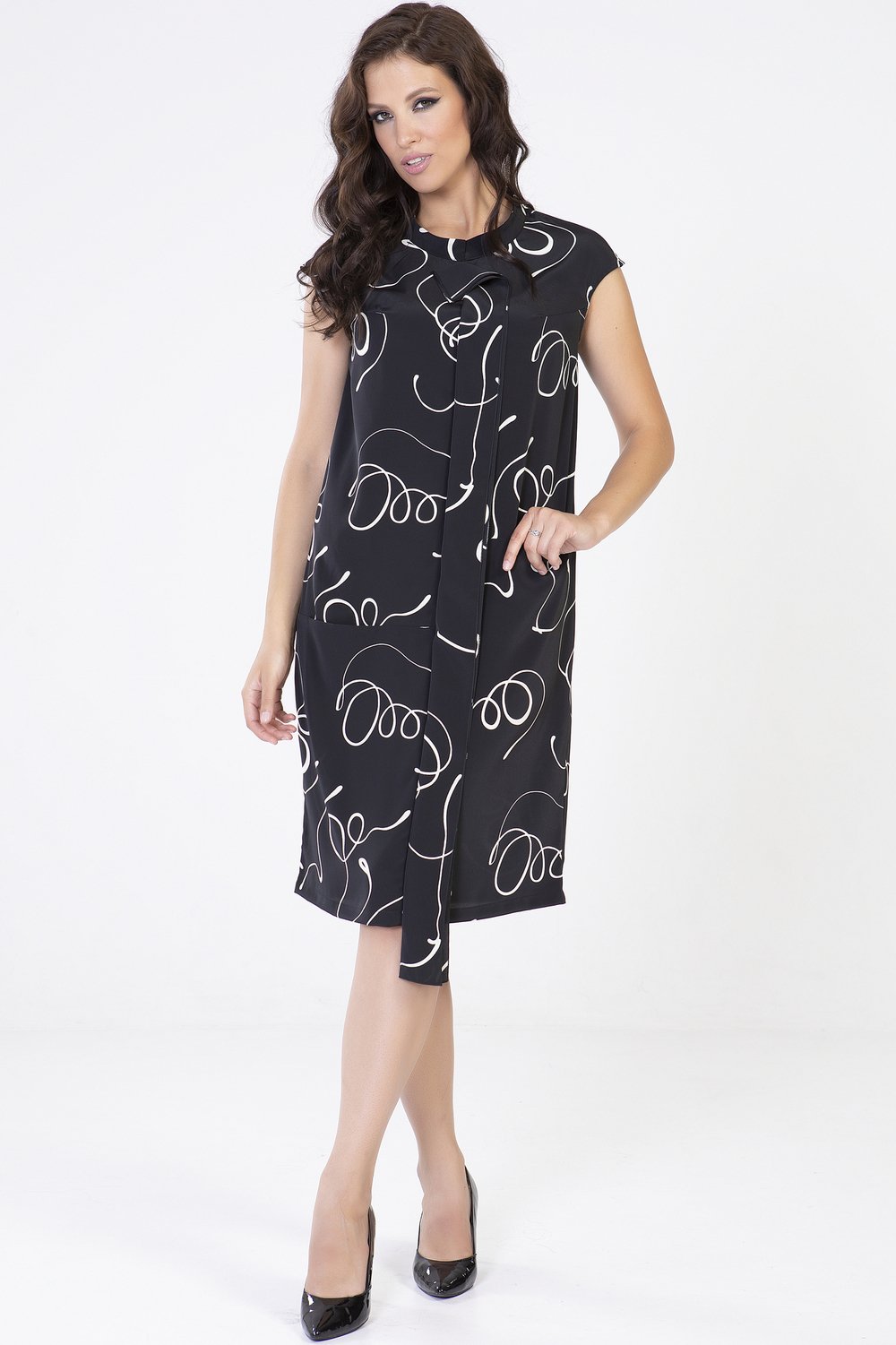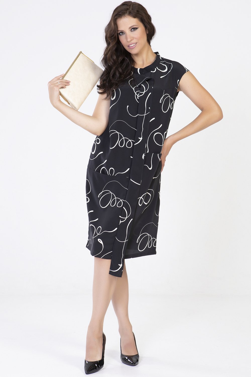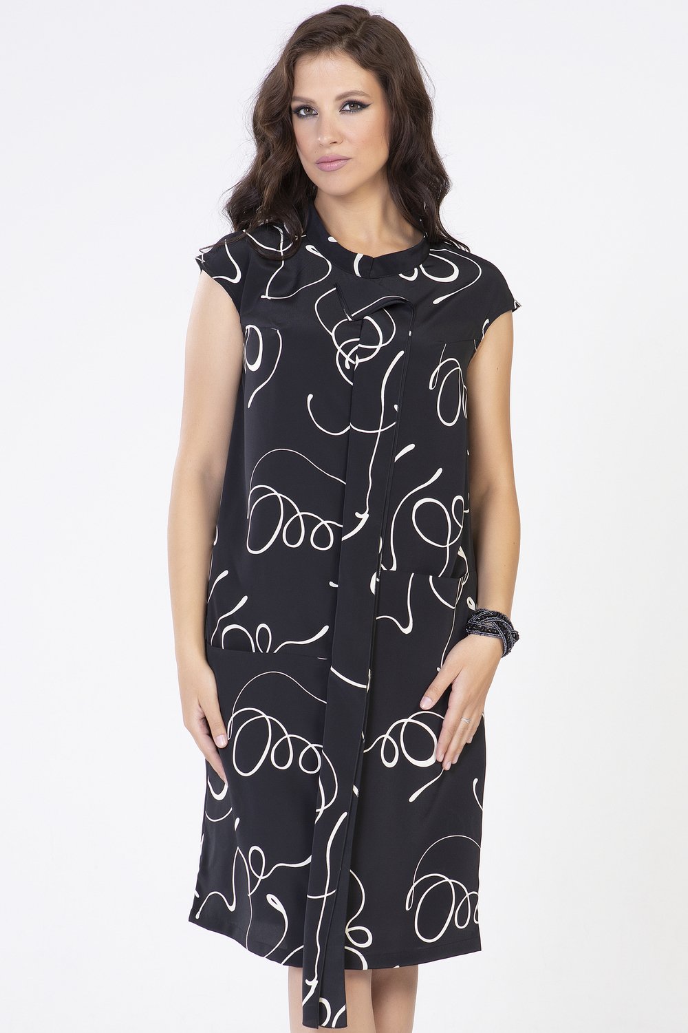 Платье прямого силуэта, со спущенным плечом. Перед со средним швом, с поперечными рельефными швами, с карманами. По среднему шву переда настрочен волан прямоугольной формы. Воротник-стойка.