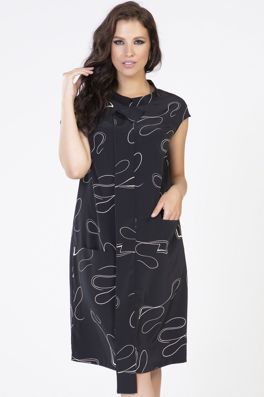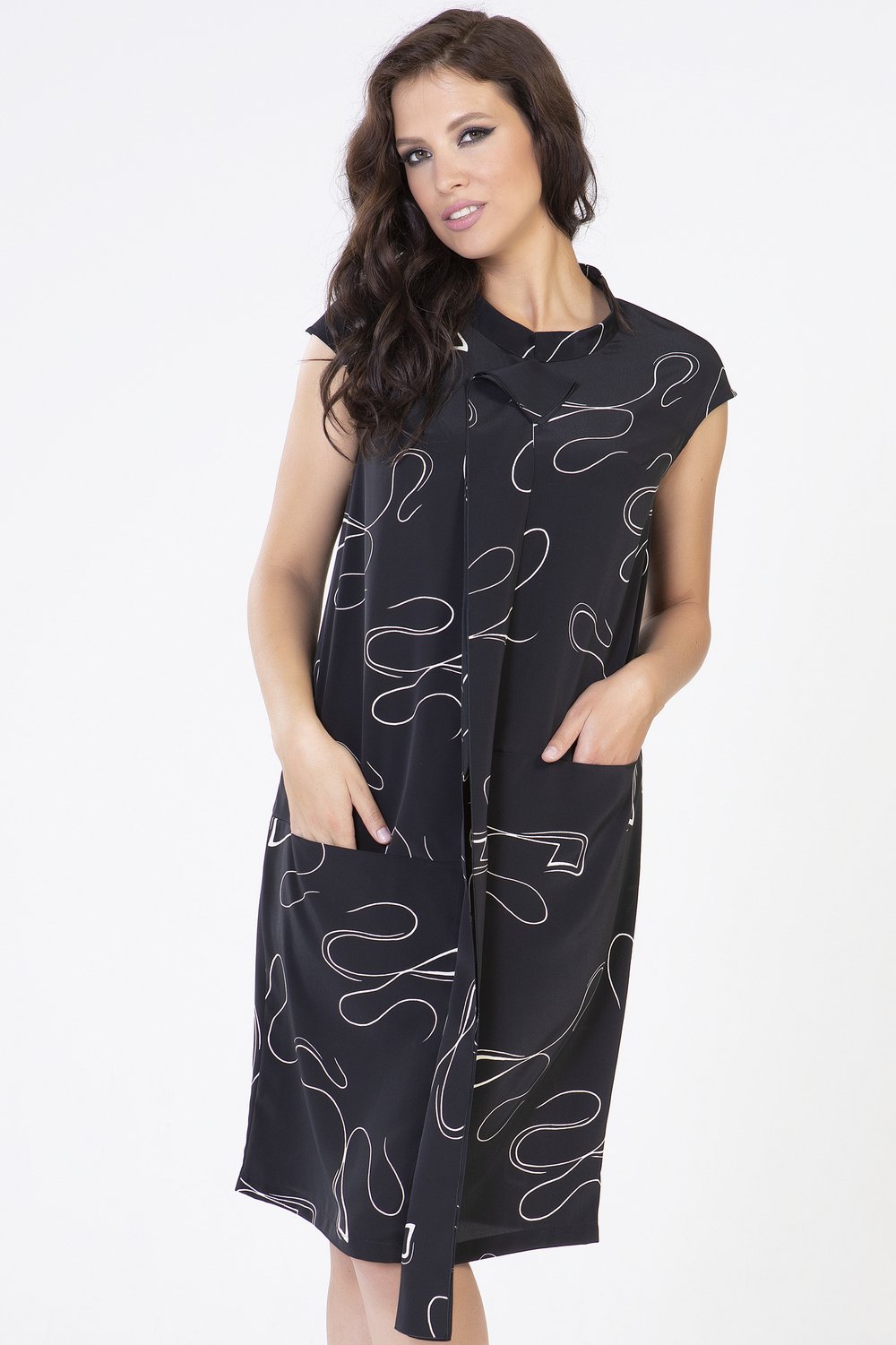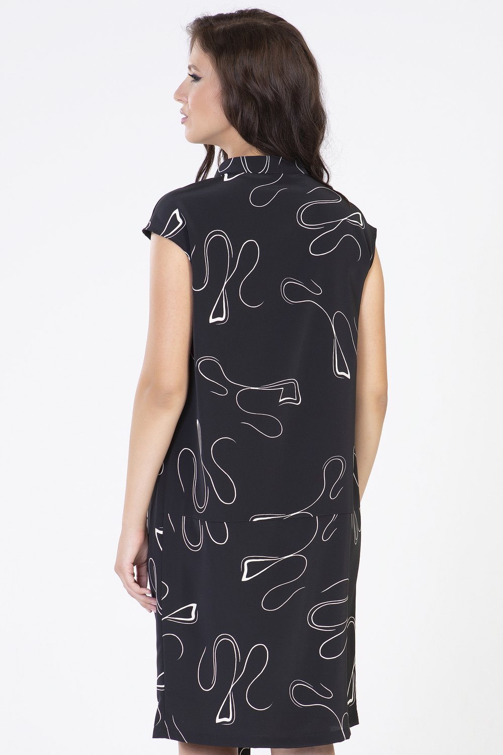 Платье прямого силуэта, со спущенным плечом. Перед со средним швом, с поперечными рельефными швами, с карманами. По среднему шву переда настрочен волан прямоугольной формы. Воротник-стойка.Характеристики: