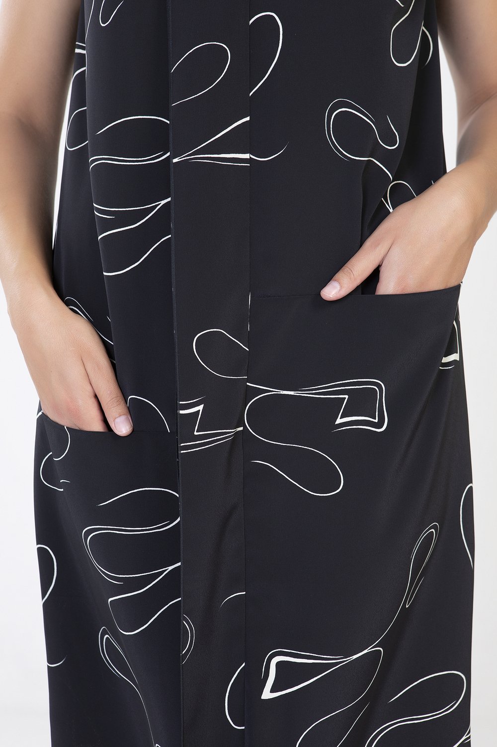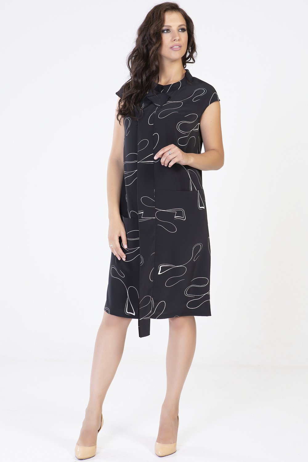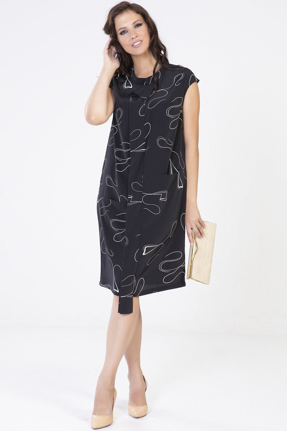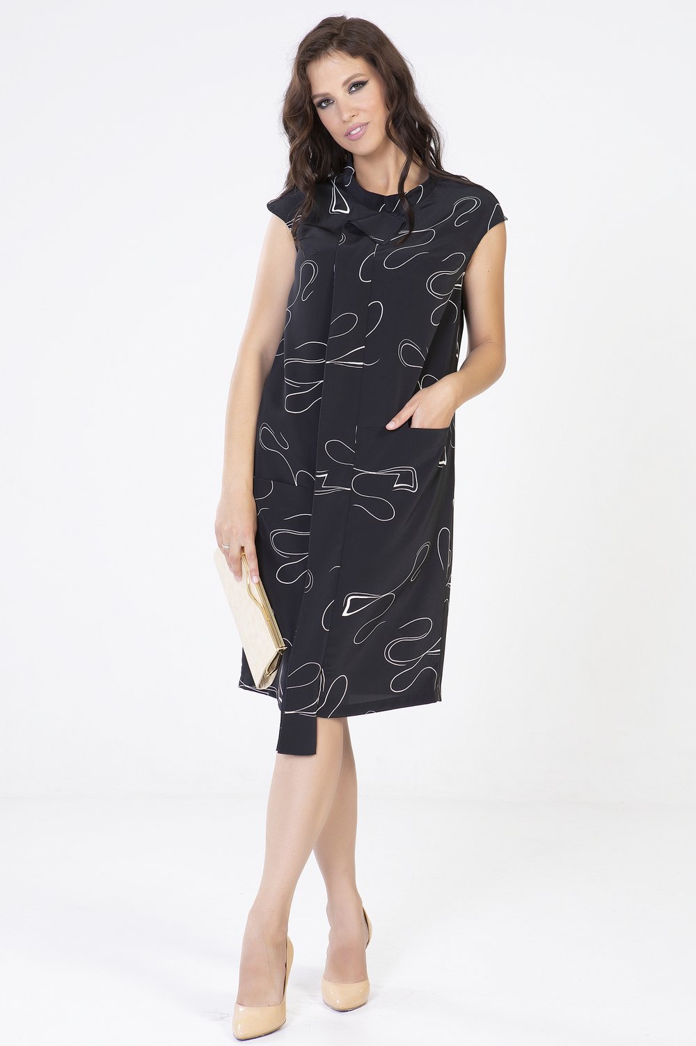 Платье прямого силуэта, со спущенным плечом. Перед со средним швом, с поперечными рельефными швами, с карманами. По среднему шву переда настрочен волан прямоугольной формы. Воротник-стойка.Характеристики: