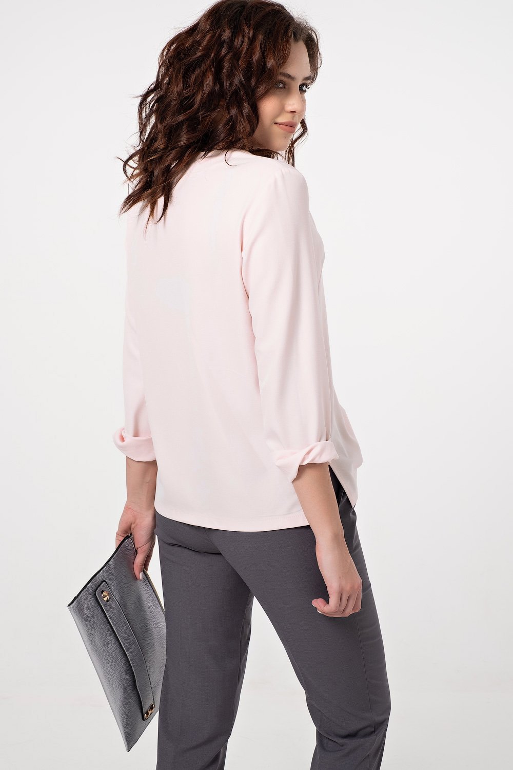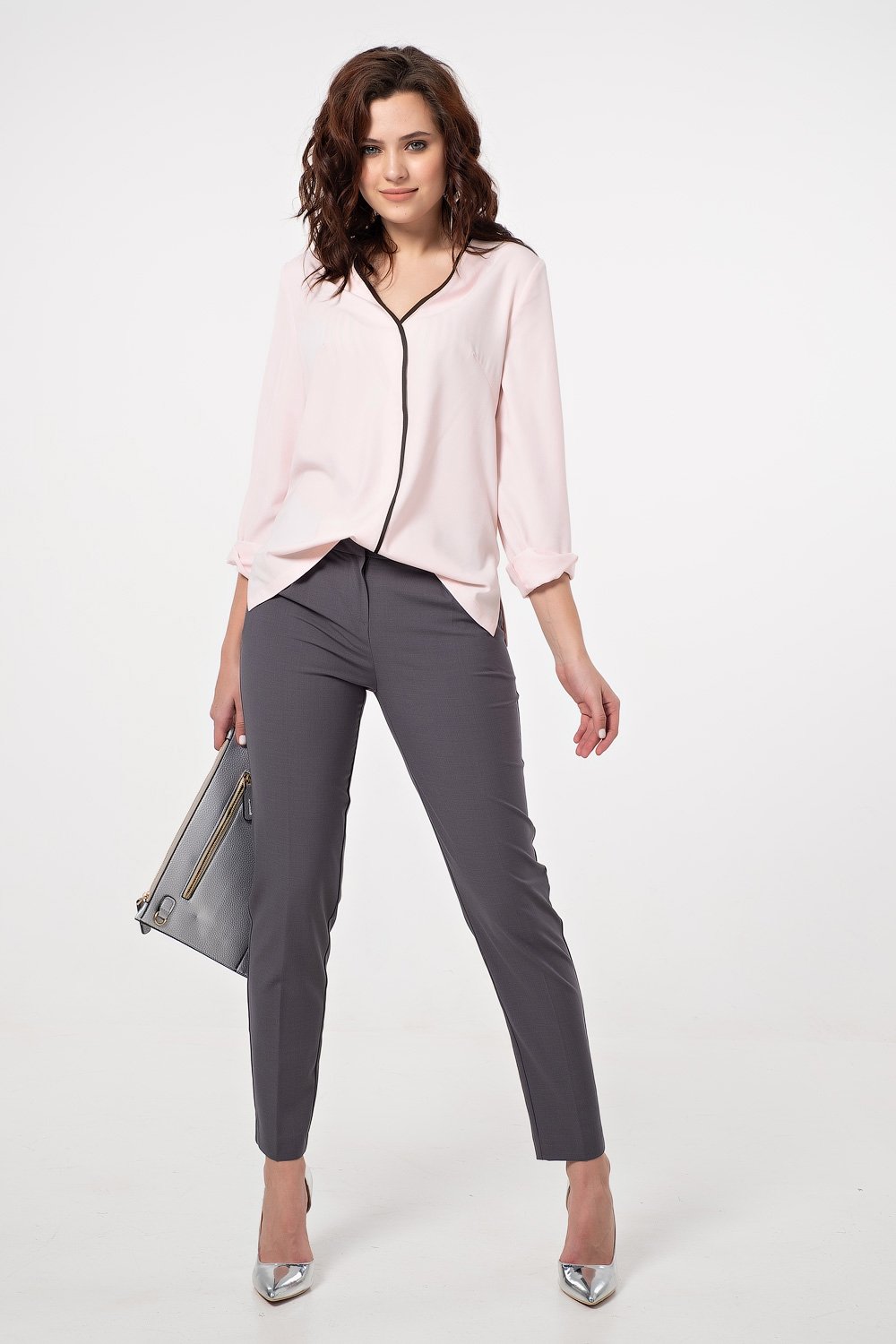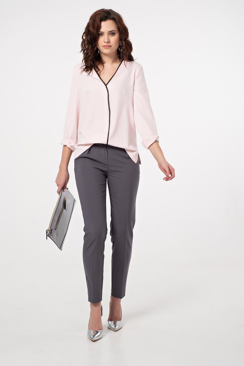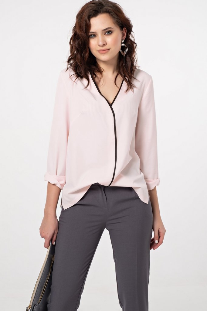 • Особенности: Блуза из креповой ткани с контрастным кантом. Детали: V-образный вырез с отделкой втачной длинный рукав с цельнокроенной манжетой по низу; разрезы по низу блузки.