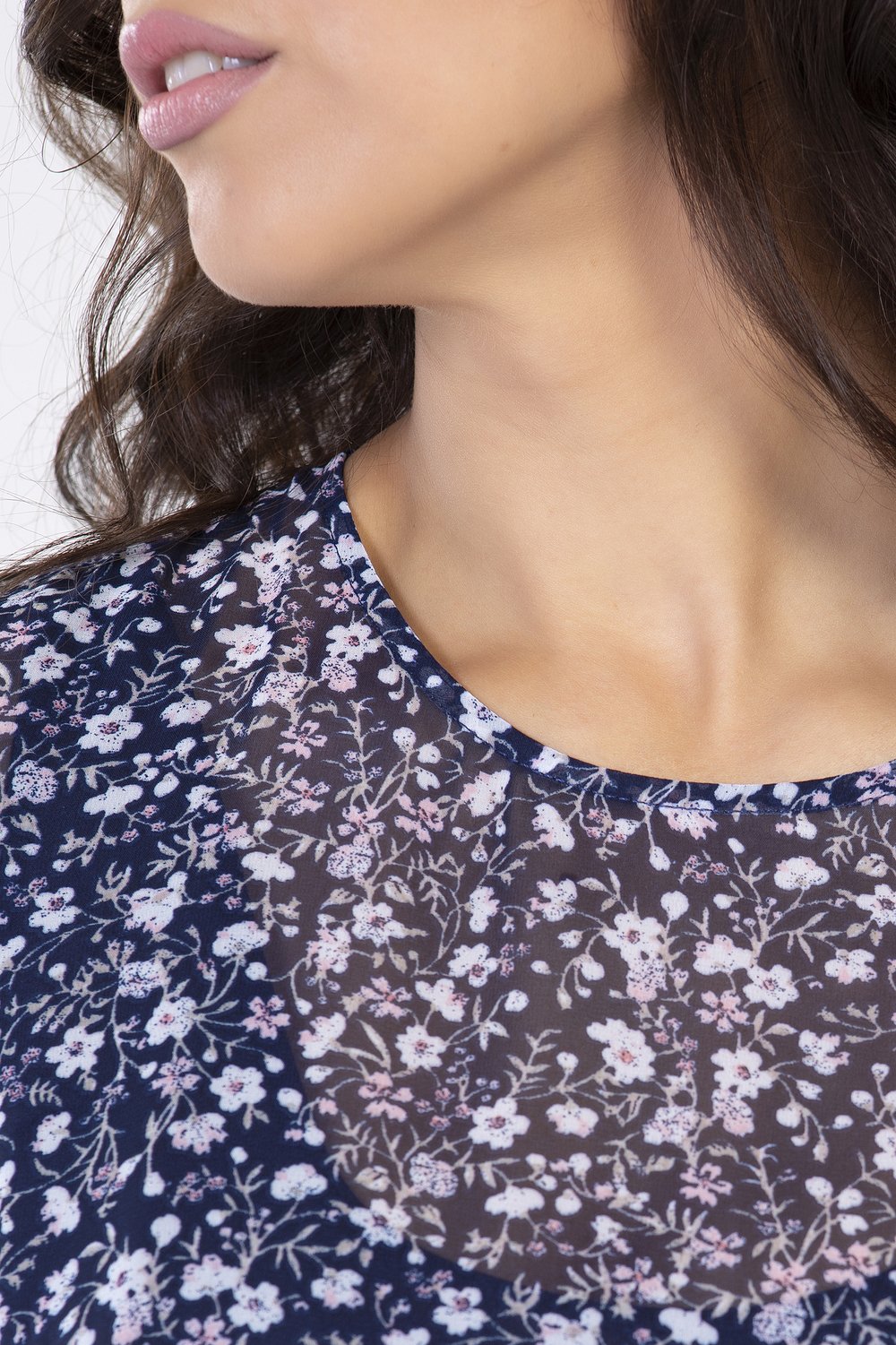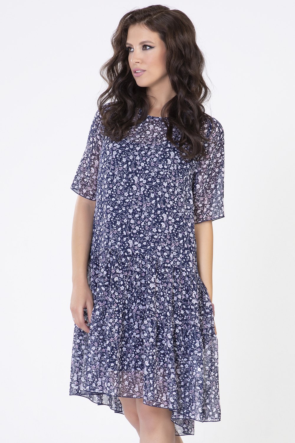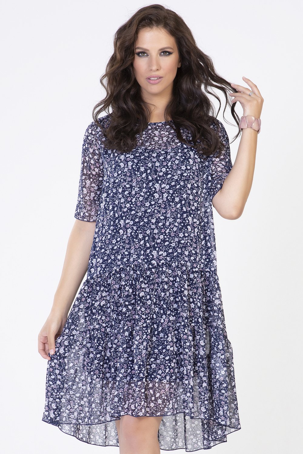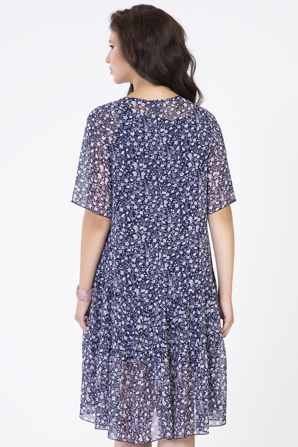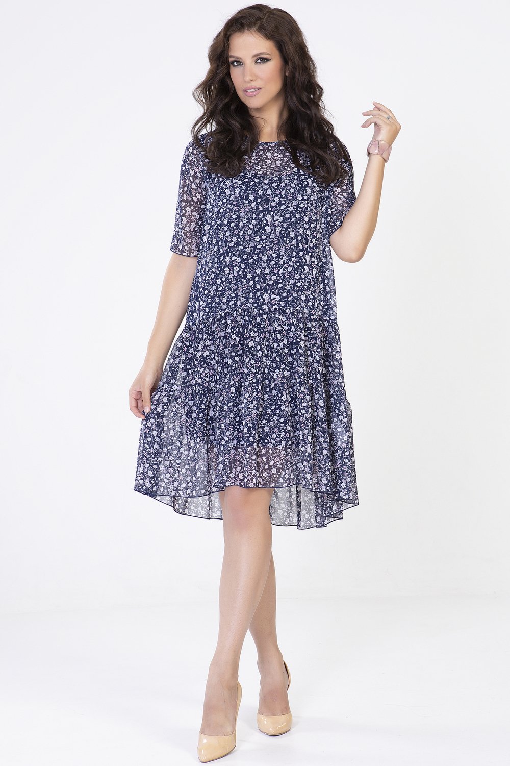 Платье трапециевидного силуэта, отрезное по линии бедер.Горловина круглая, рукав втачной, короткий. Спинка с застежкой в среднем шве на короткую потайную тесьму молнию. Нижняя часть переда и спинки с воланами в два ряда, собранными в сборку. К платью прилагается съемный чехол из трикотажного полотна.