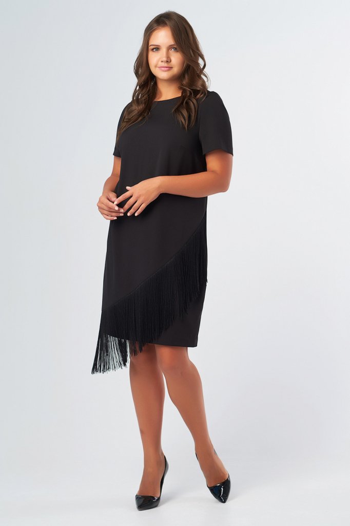 • Особенности: Платье прямого силуэта. Горловина округлой формы рукав втачной короткий нагрудные вытачки по спинке - потайная застежка-молния по низу асимметричное членение с декором-бахромой.