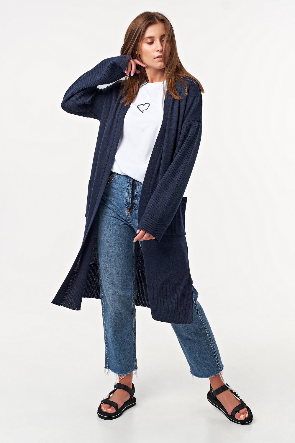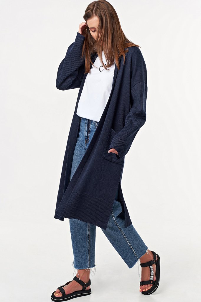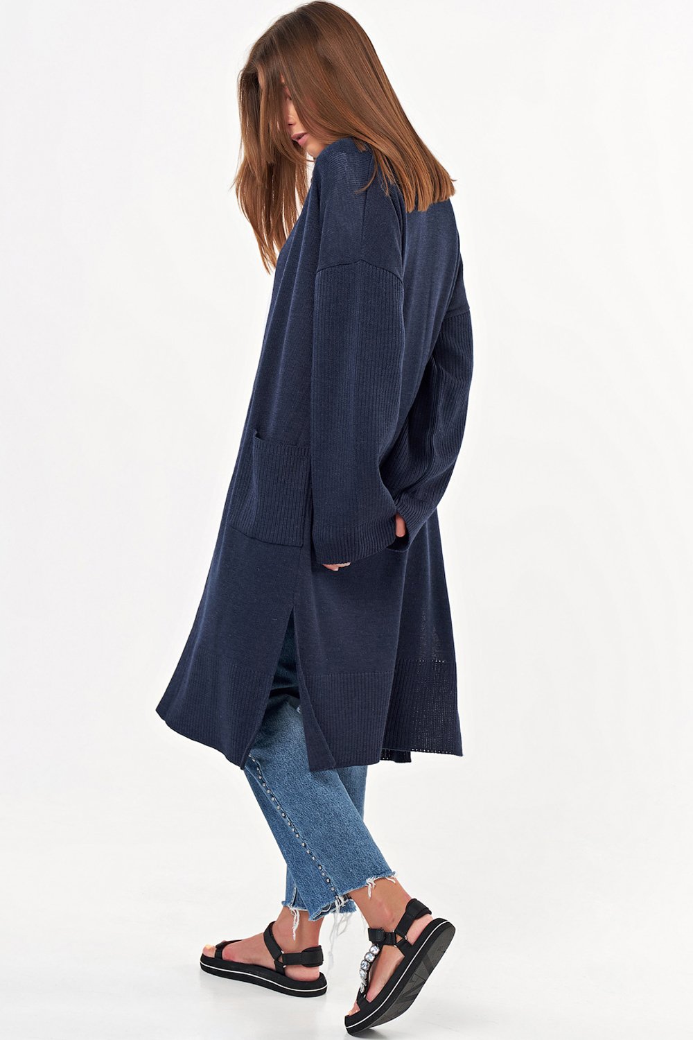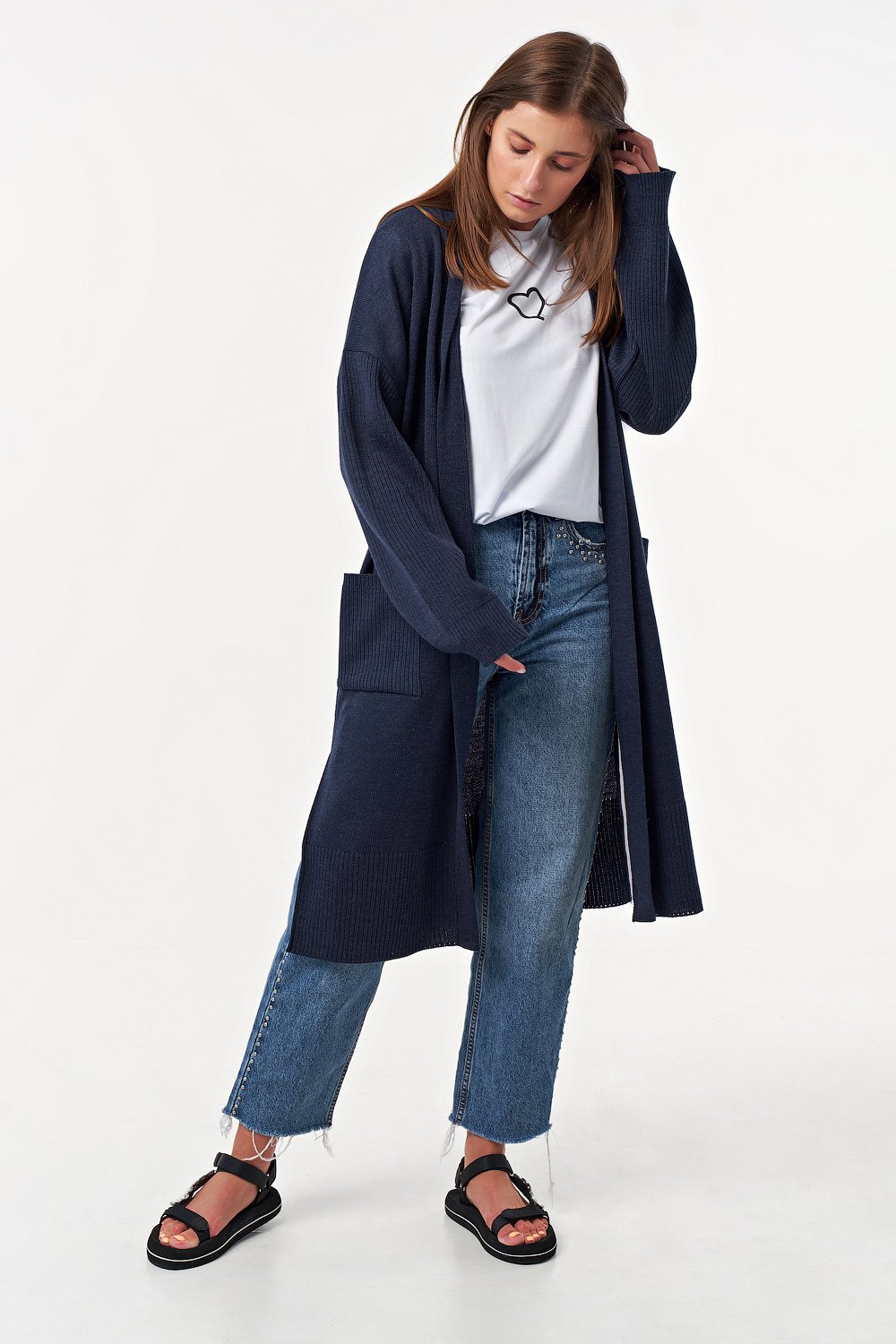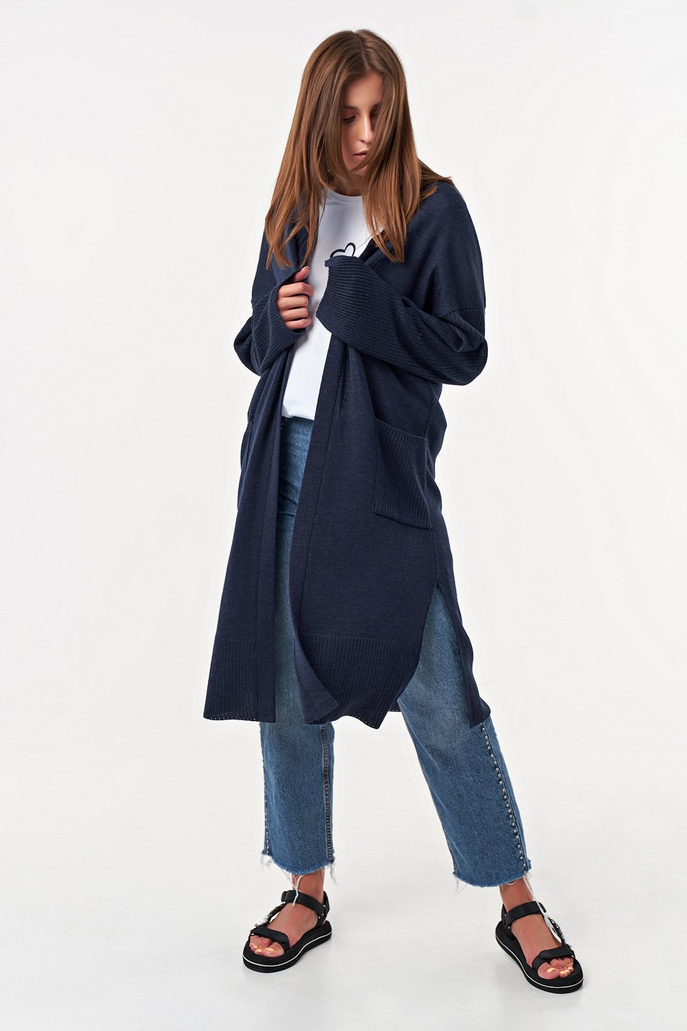 • Длина изделия: по спинке 105см (44-46 р) 107см (48-50 р). Особенности: Вязаный кардиган прямого длинного силуэта выполнен из полушерстяной пряжи с длинными разрезами по бокам. Кардиган оформлен обтачкой по переду. Широкие рукава оформлены резинкой.