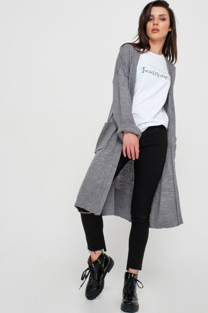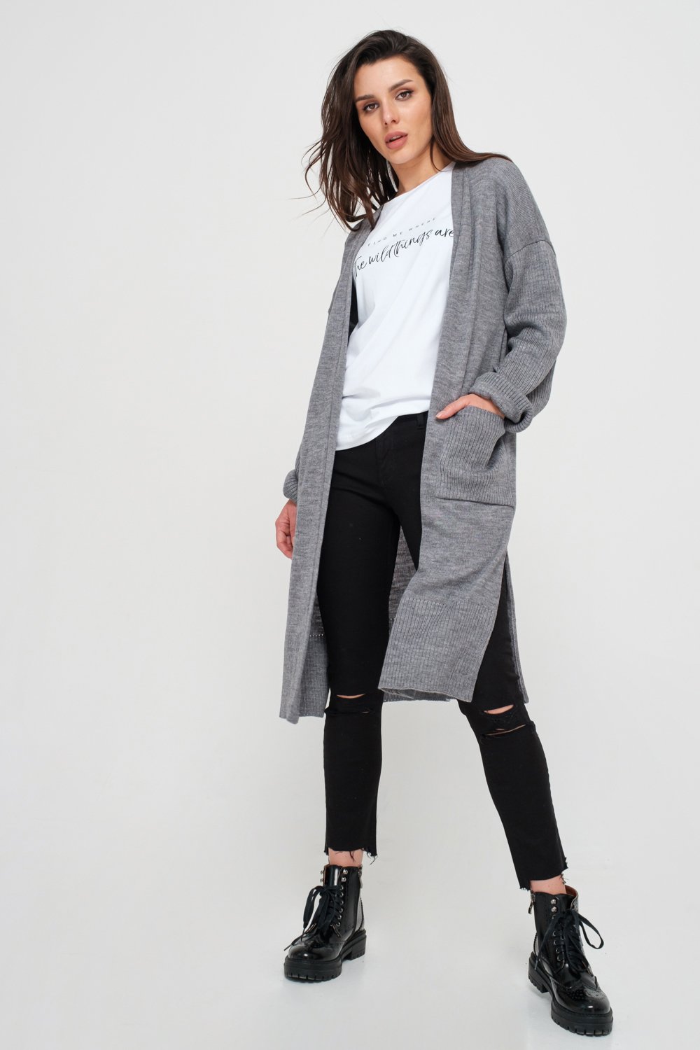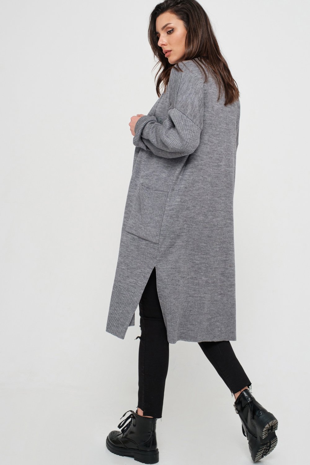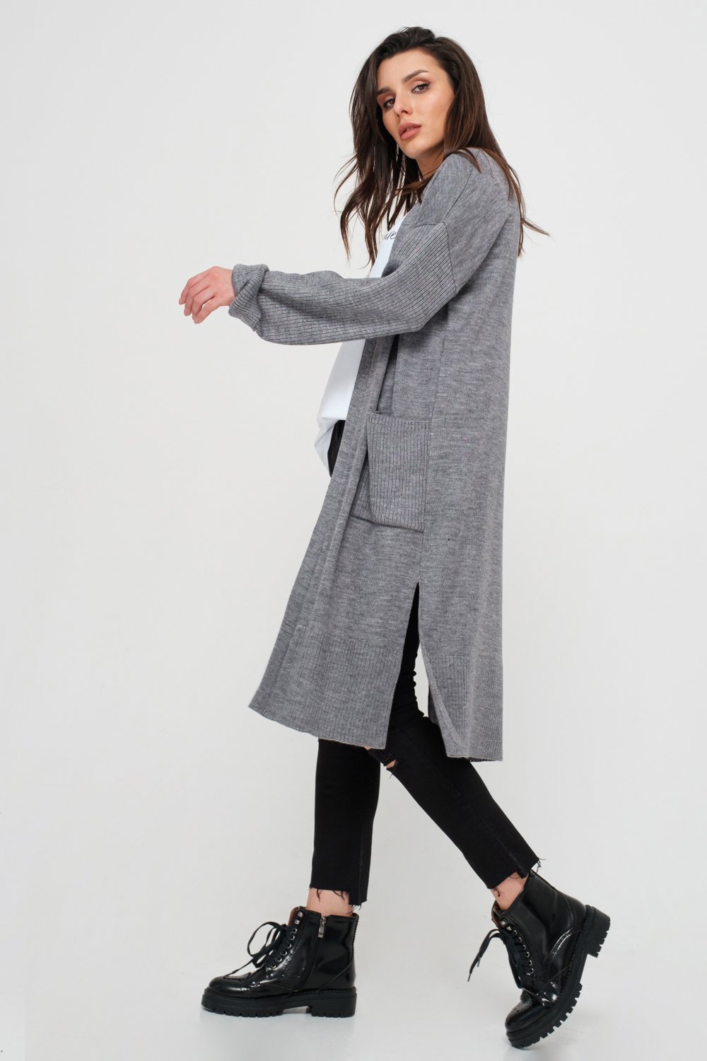 • Длина изделия: по спинке 105см (44-46 р) 107см (48-50 р). Особенности: Вязаный кардиган прямого длинного силуэта выполнен из полушерстяной пряжи с длинными разрезами по бокам. Кардиган оформлен обтачкой по переду. Широкие рукава оформлены резинкой.