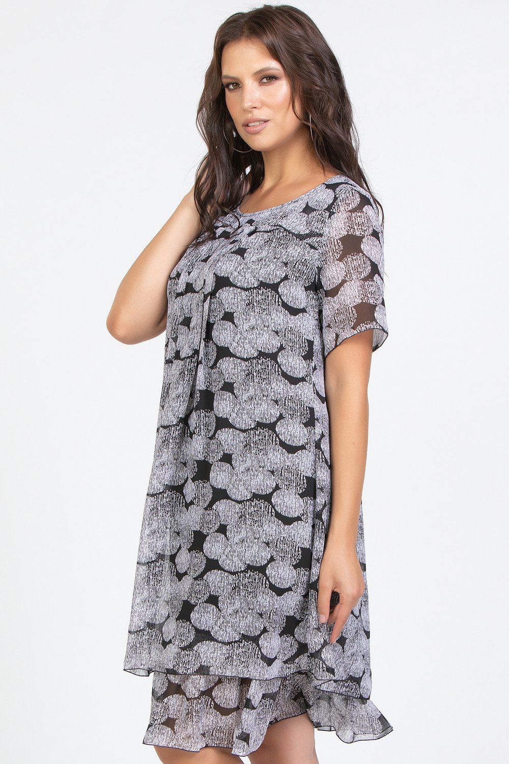 Платье трапециевидного силуэта, с кокеткой по переду и спинке. Горловина круглая, рукав втачной, короткий. Нижняя часть переда и спинки с застроченными складками, на подкладке. По низу подкладки - притачная оборка из основной ткани, собранная в сборку.Характеристики: