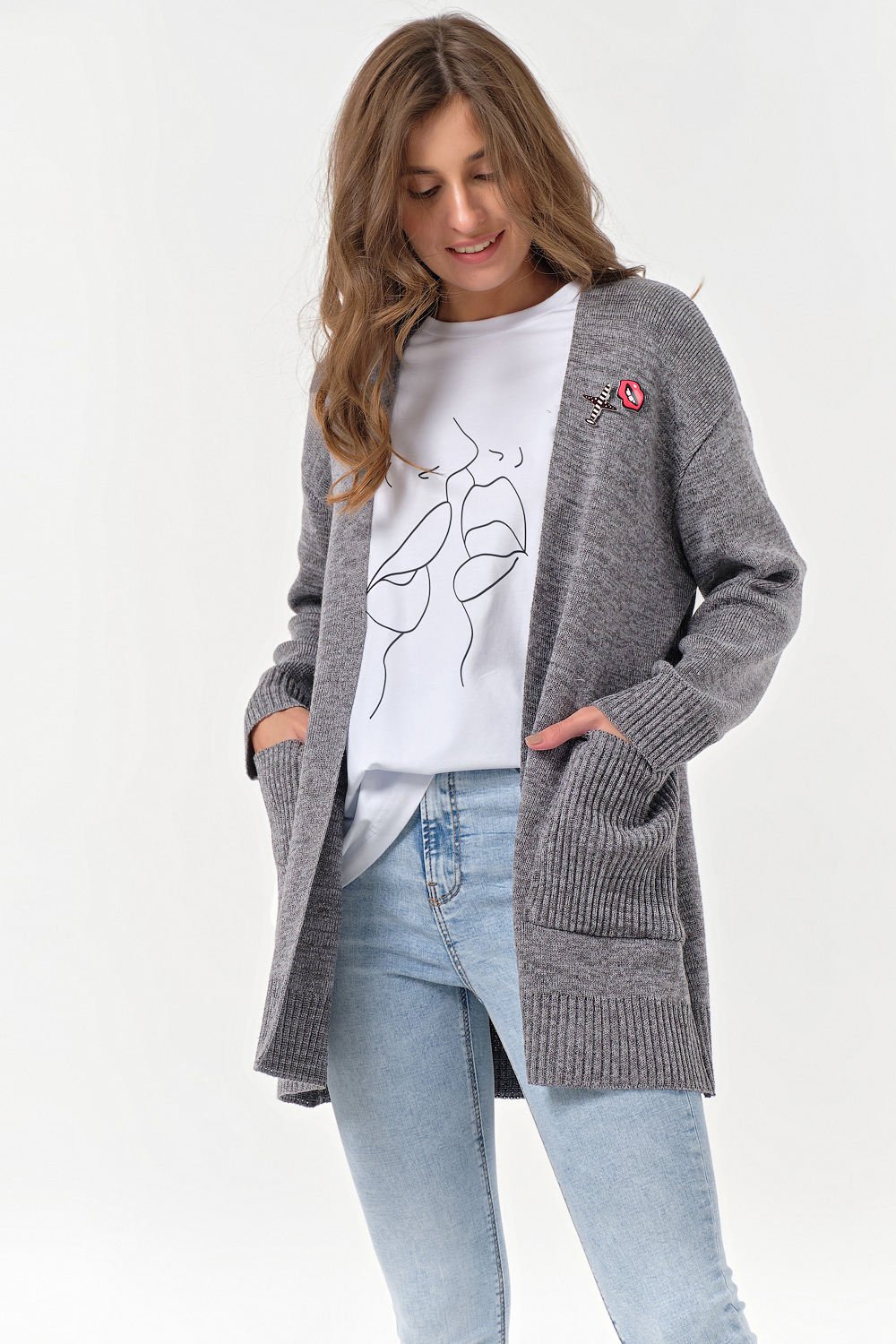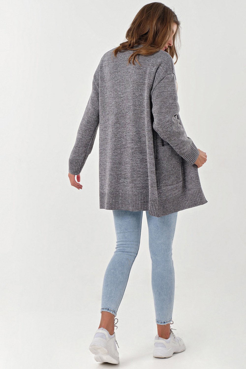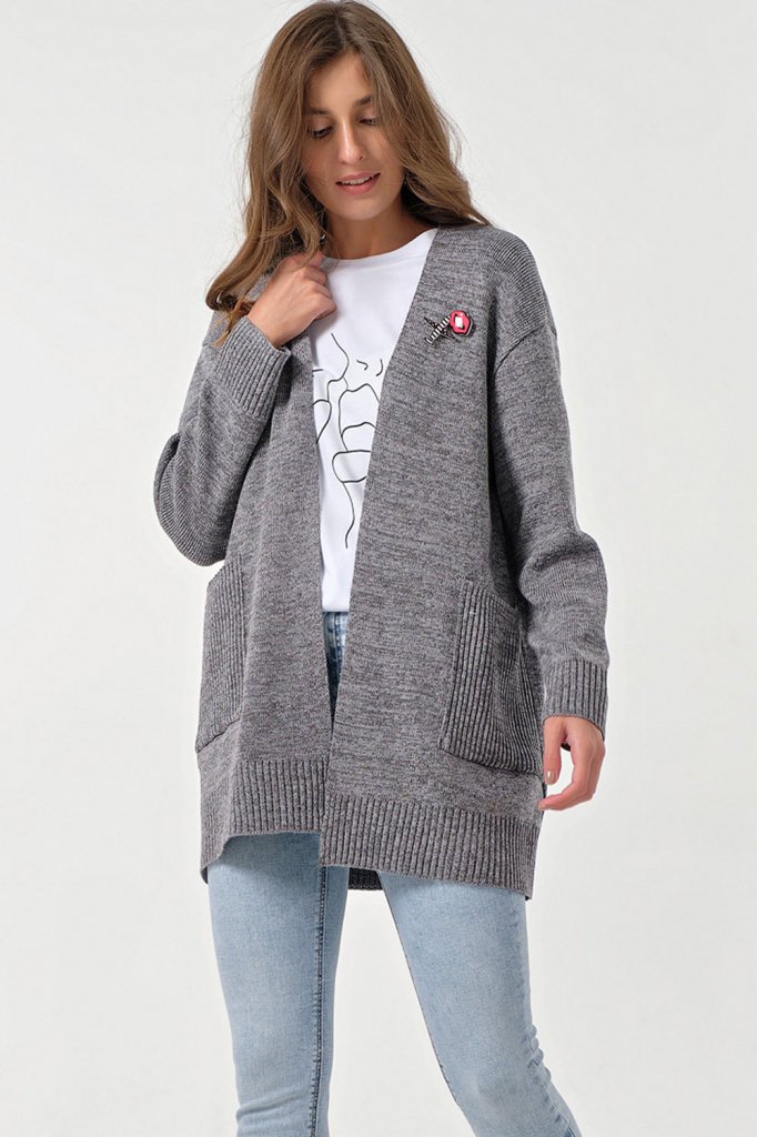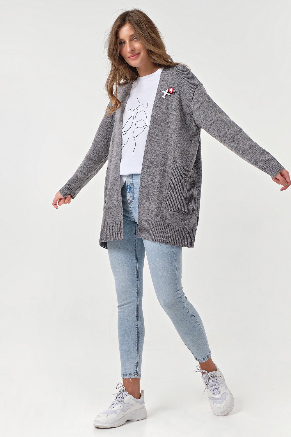 • Длина изделия: 80 см. Особенности: Мягкий кардиган из смесовой пряжи с деликатным меланжем. Низ изделия рукава и карманы оформлены фактурной резинкой. По переду декоративные съемные элементы.