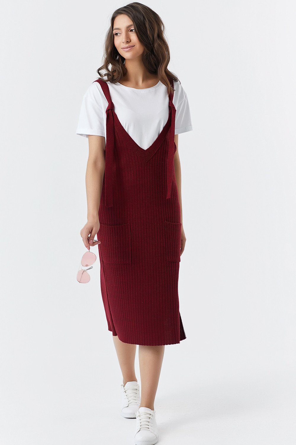 Удлиненный вязаный сарафан выполнен фактурной вязкой из смесовой пряжи с содержанием шерсти и хлопка. Сарафан имеет V- образные вырезы по спинке и полочке и один боковой разрез (справа). На полочке изделия имеются 2 накладных кармана. Бретели сарафана регулируются узлом. Длина изделия по спинке 88 см (44-48 р) длина бретелей 12-17 см.Характеристики: