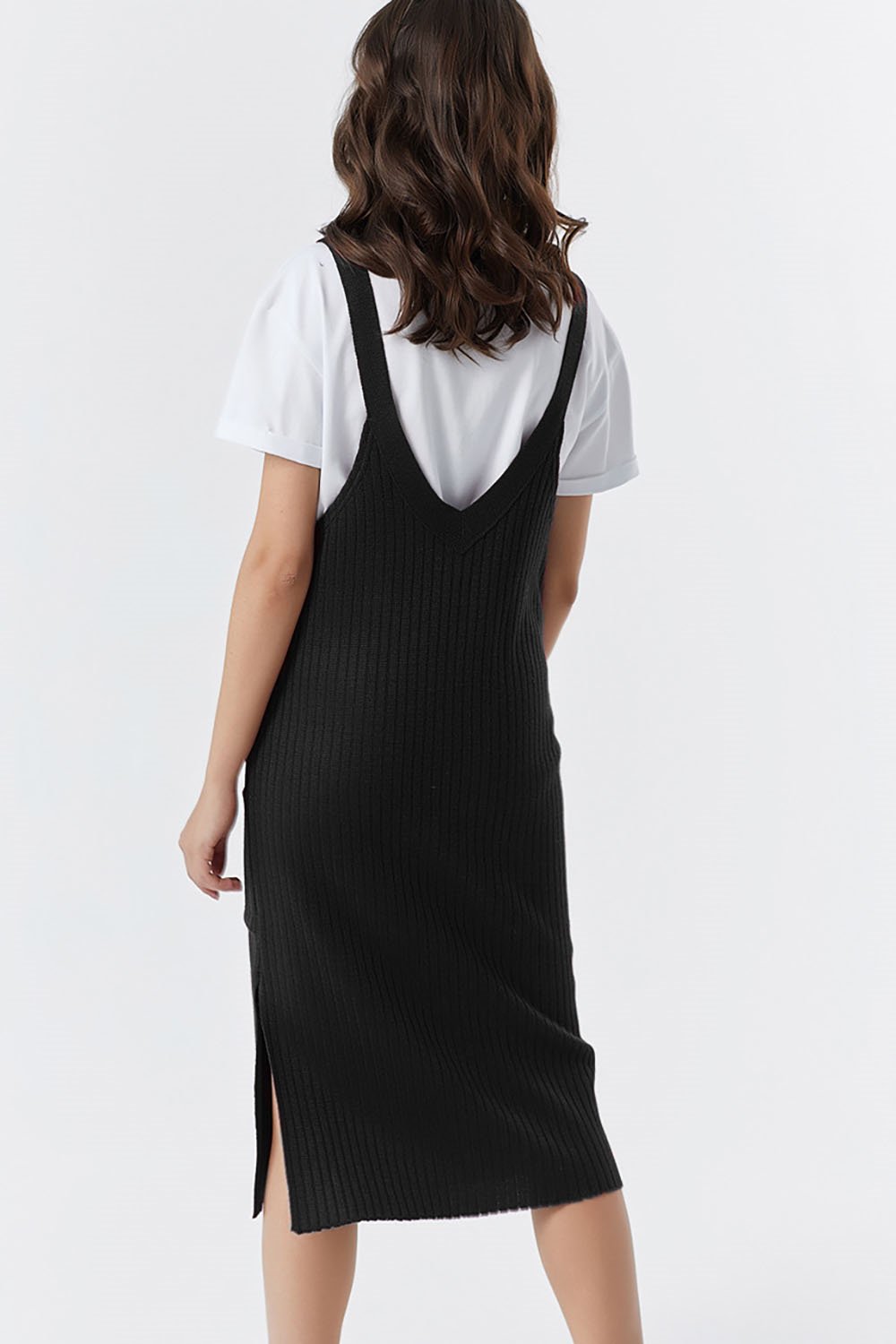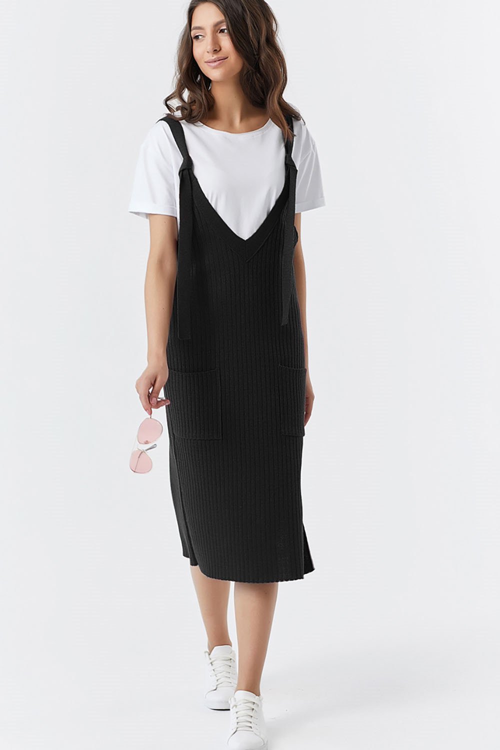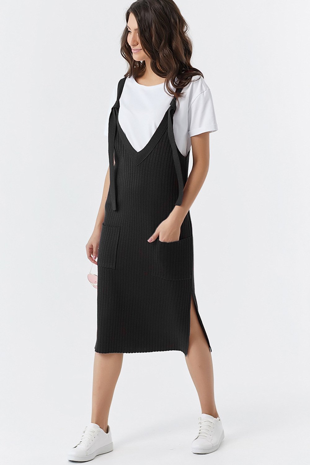 Удлиненный вязаный сарафан выполнен фактурной вязкой из смесовой пряжи с содержанием шерсти и хлопка. Сарафан имеет V- образные вырезы по спинке и полочке и один боковой разрез (справа). На полочке изделия имеются 2 накладных кармана. Бретели сарафана регулируются узлом. Длина изделия по спинке 88 см (44-48 р) длина бретелей 12-17 см.Характеристики: