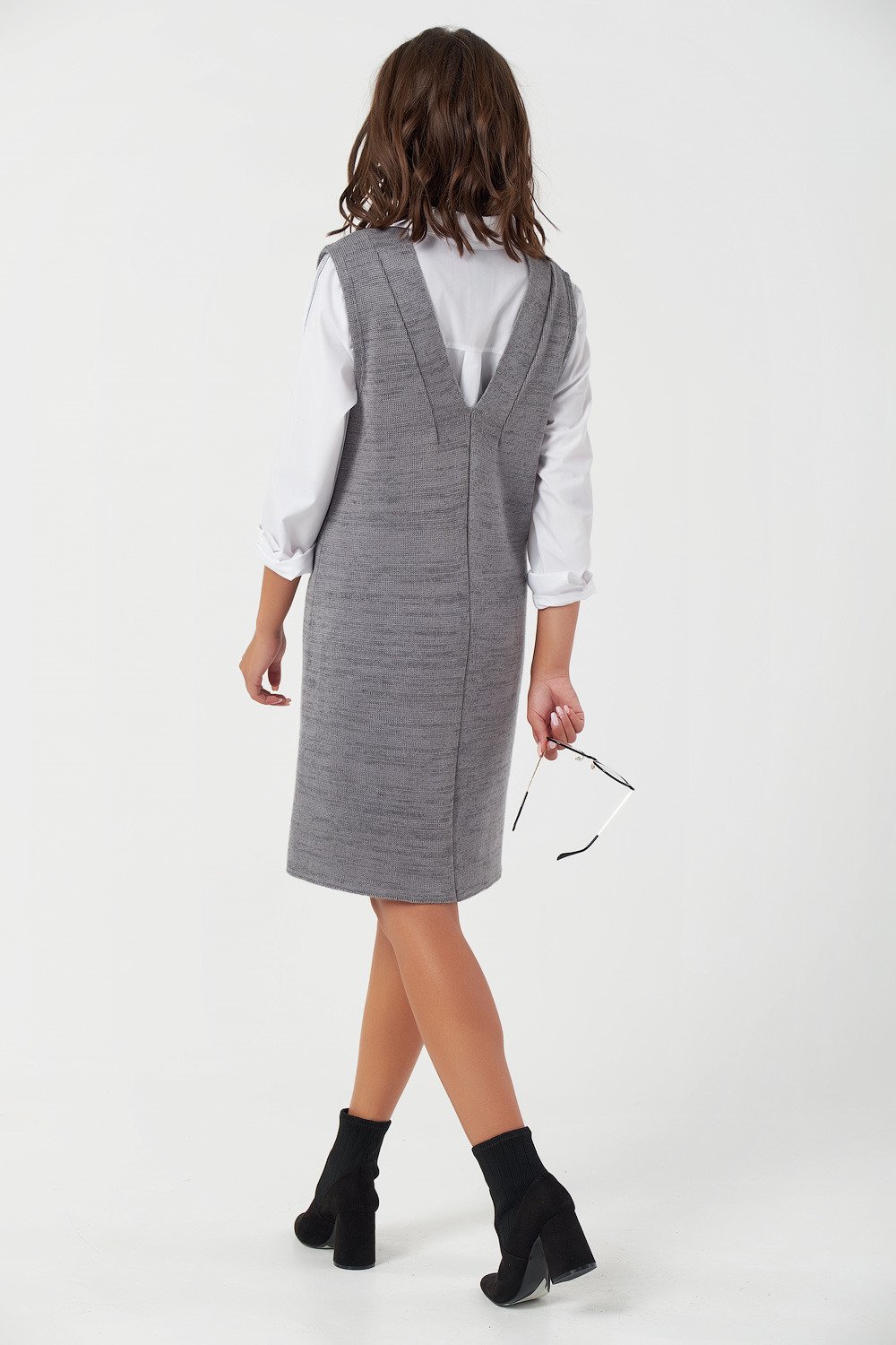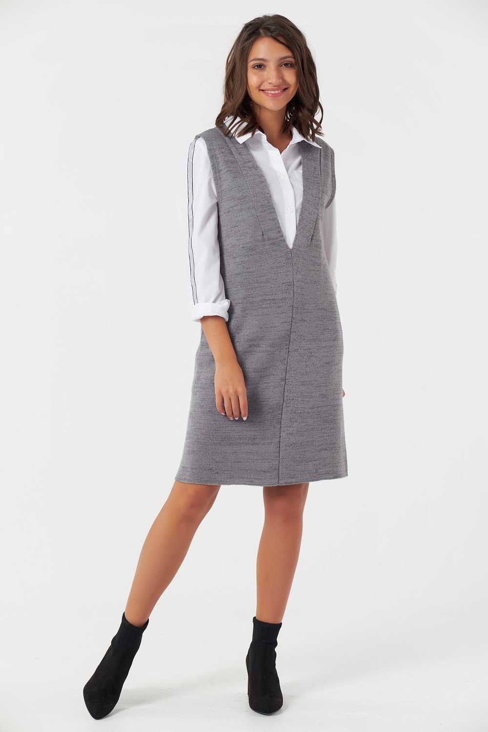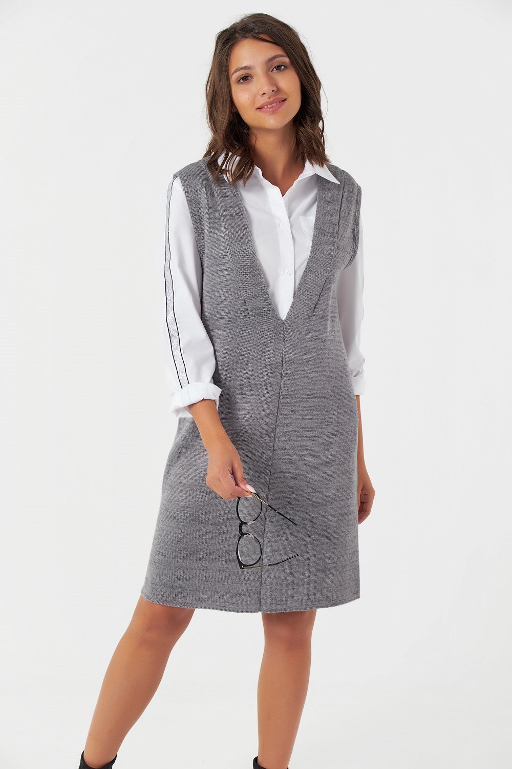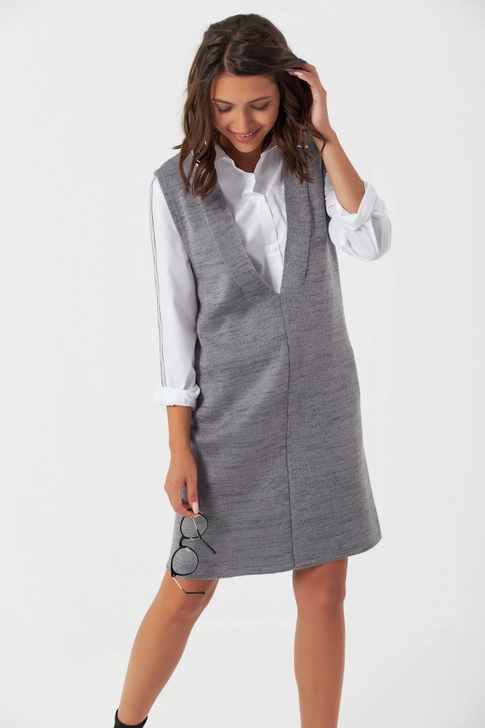 • Горловина: V-образная на переде и спинке Особенности: Вязаный сарафан выполнен из смесовой пряжи с содержанием шерсти и хлопка. Сарафан имеет две плечевые вытачки на переде и спинке.