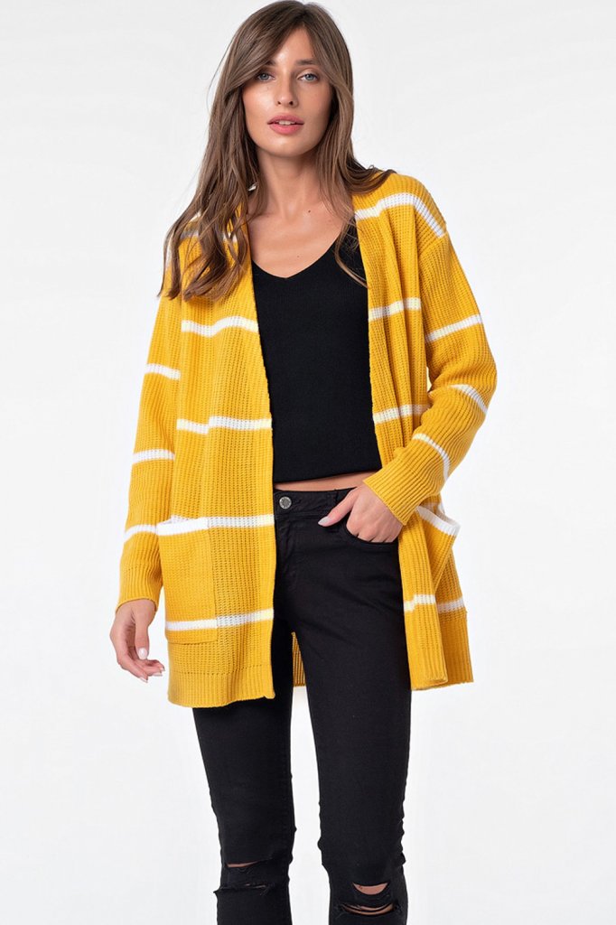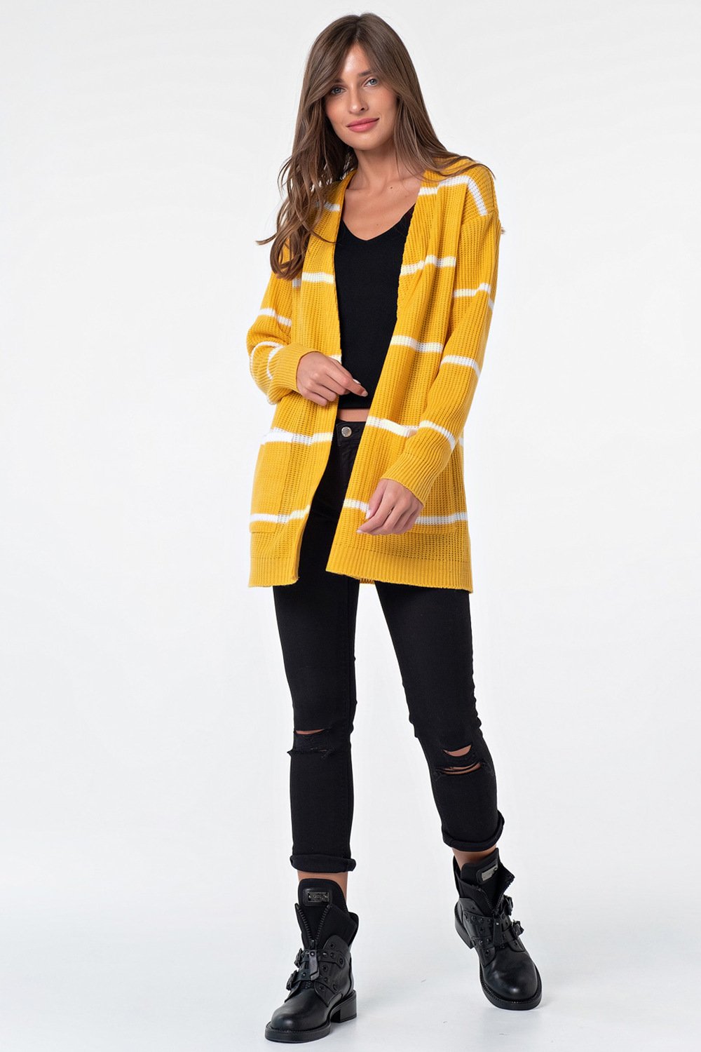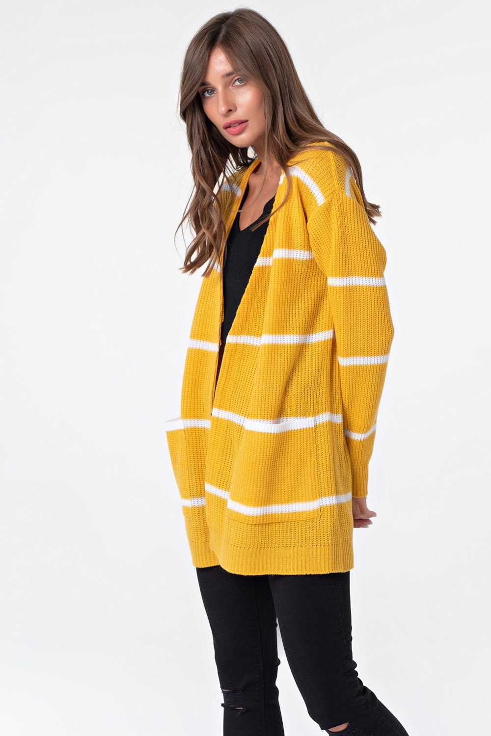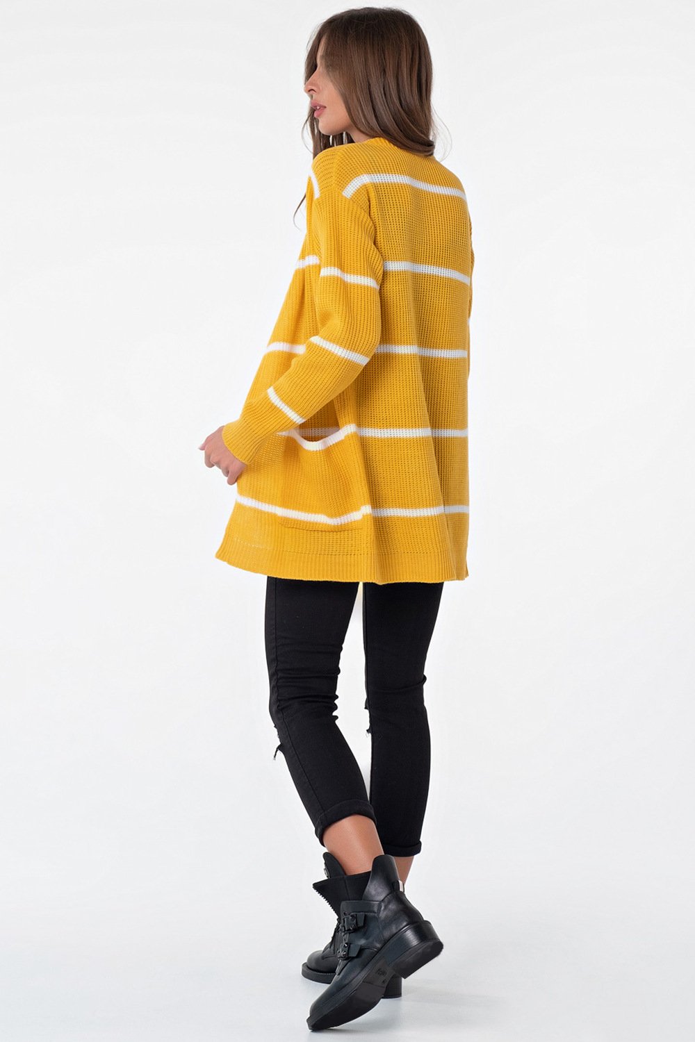 • Особенности: Вязаный кардиган в узкую контрастную полоску свободного силуэта фактурной вязкой.
