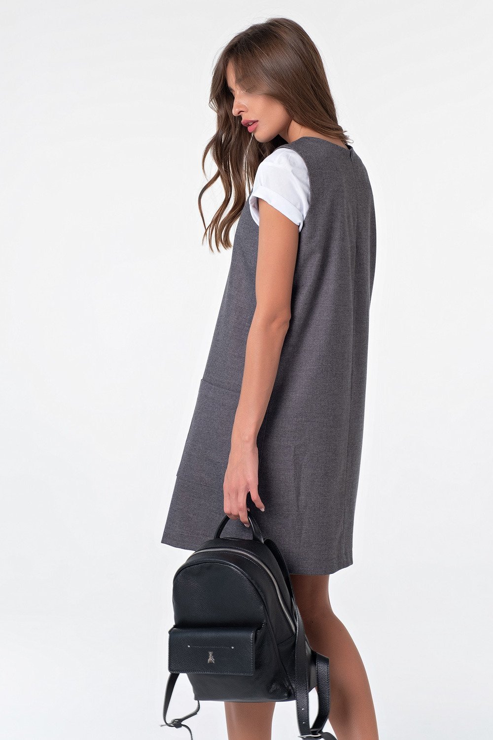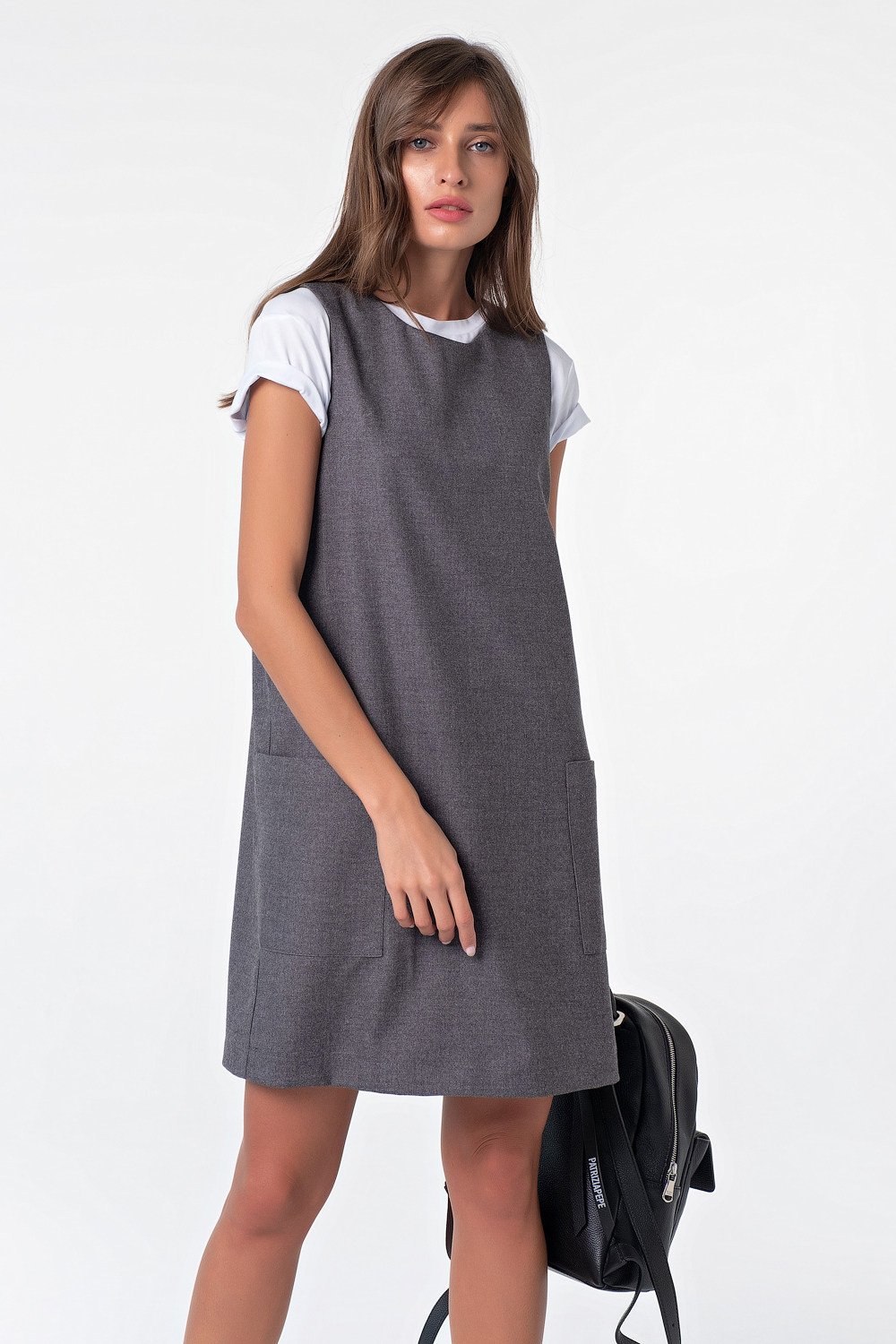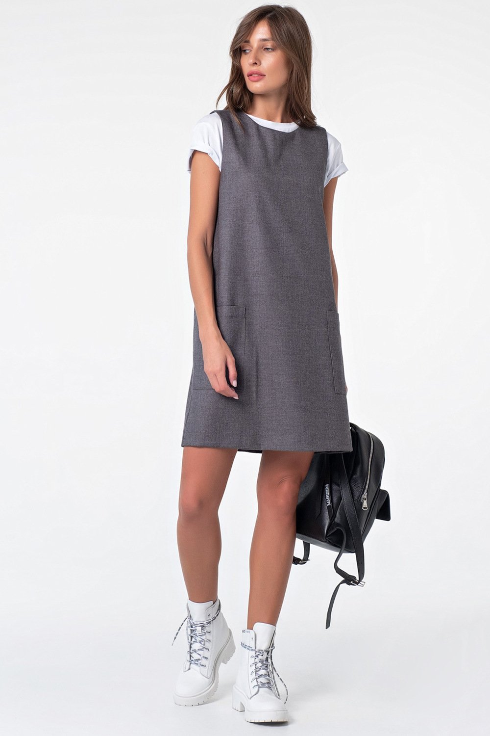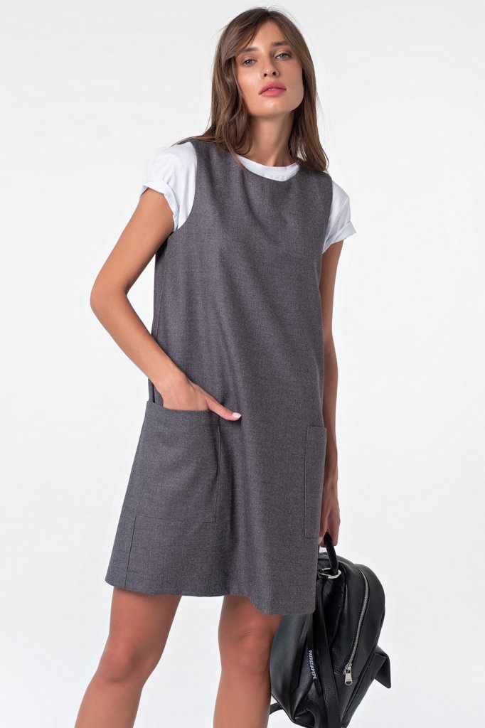 • Длина рукава: без рукавов • Тип горловины: округлый • Линия плеча: на естественном месте • Силуэт: прямой • Длина изделия: 94см • Карманы: накладные • Особенности: Сарафан из плотной костюмной ткани. Детали: горловина округлой формы накладные карманы.