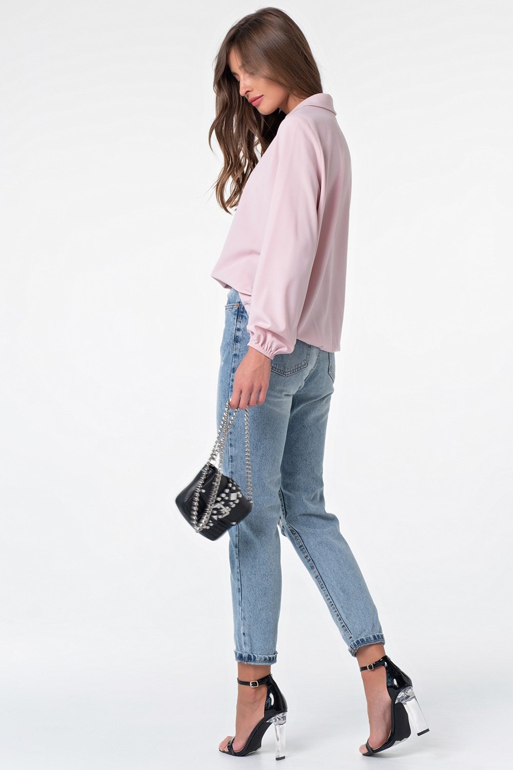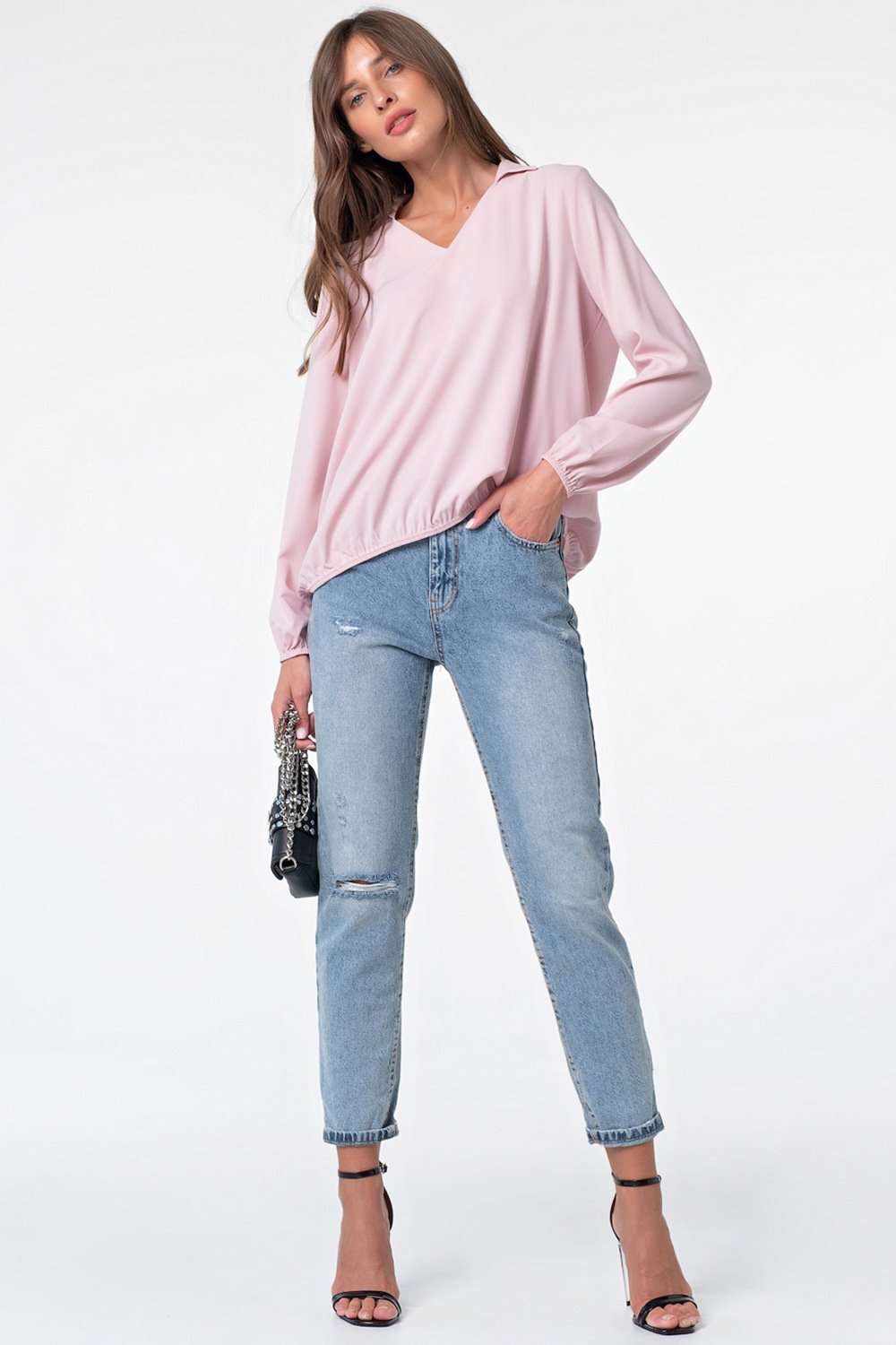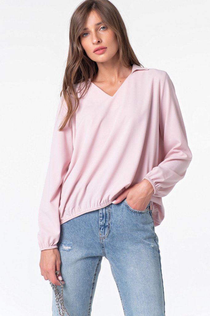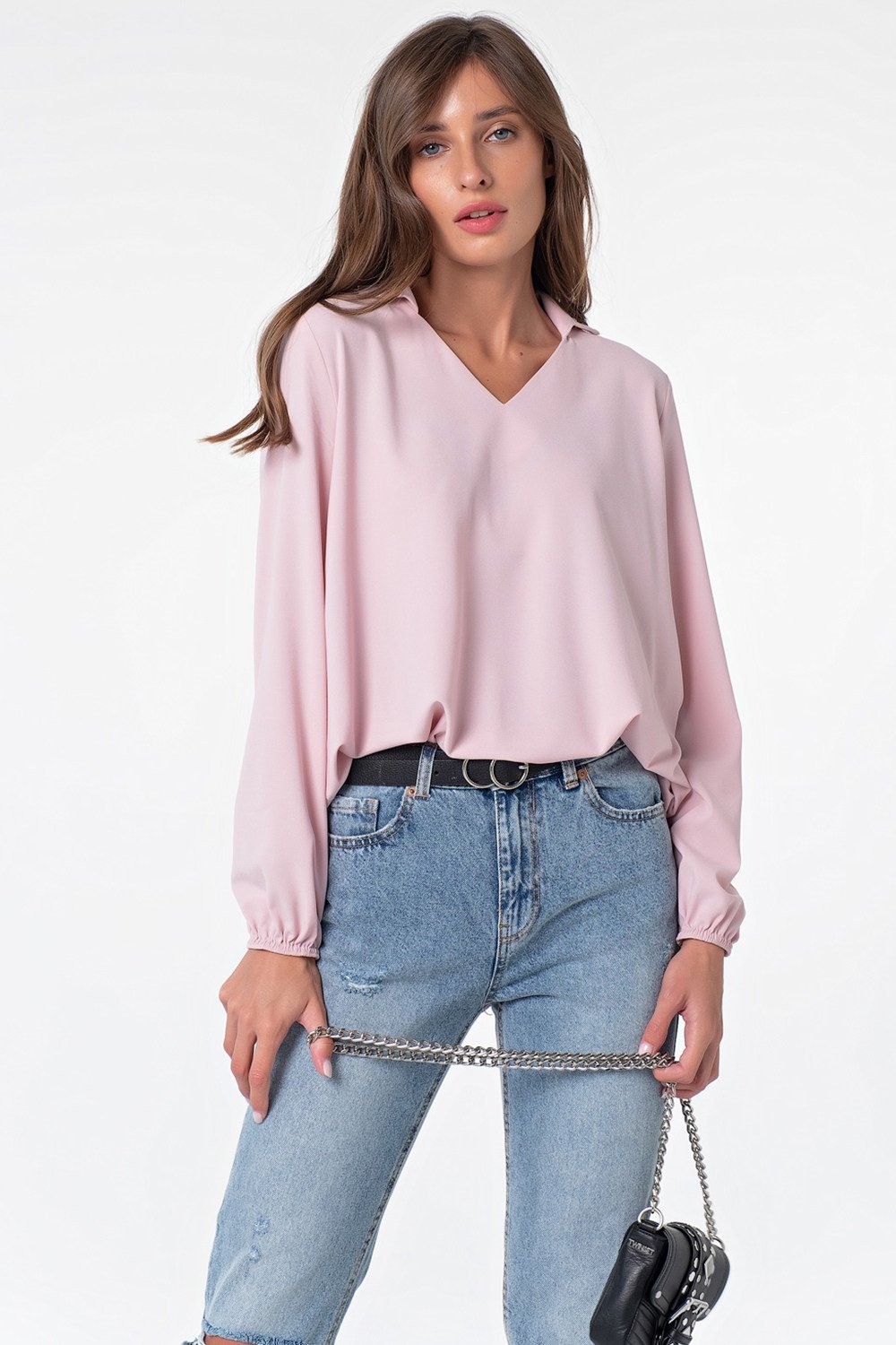 • Особенности: Блуза прямого силуэта из креповой ткани. Детали: отложной воротник вырез горловины V-образной формы длинный втачной рукав без манжет; по низу блузы и рукава сборка на резинку.