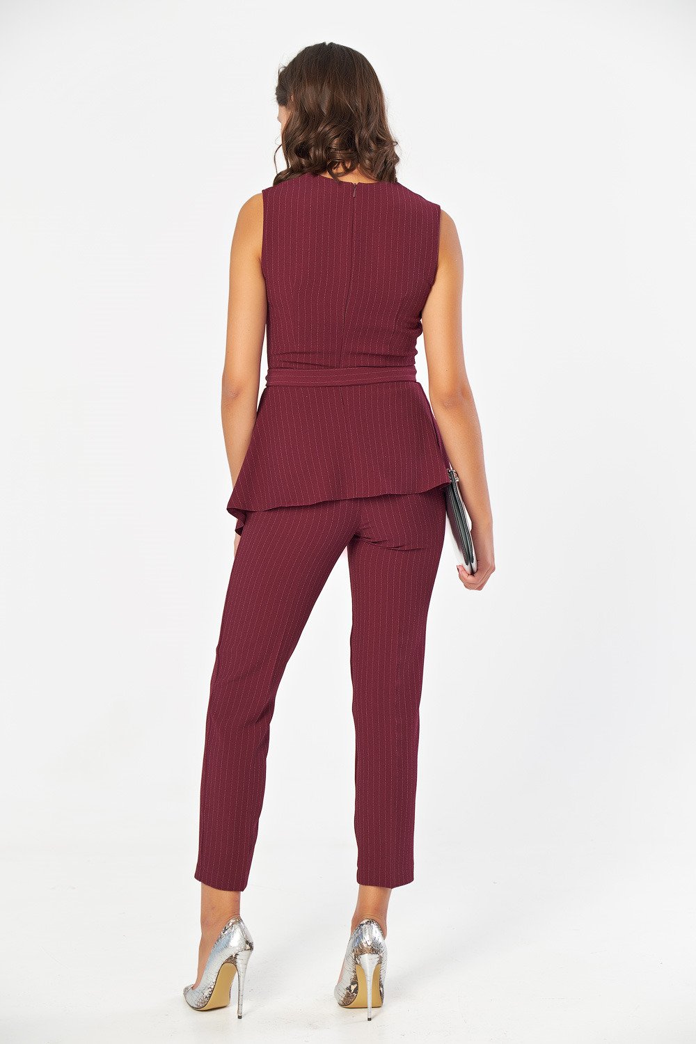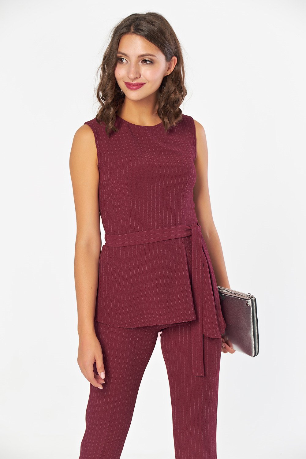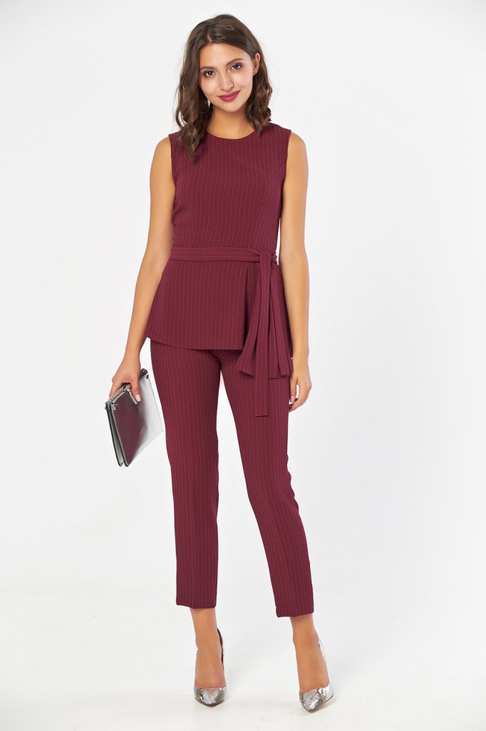 • Особенности: Костюм состоит из топа брюк и пояса. Детали топа: горловина округлой формы рельефные швы отрезной по талии нижняя часть выполнена с небольшим расклешением и декоративной деталью с левой стороны застежка на молнию по спинке. Брюки прилегающего силуэта посадка на талии застежка на молнию в боковом шве изделия.