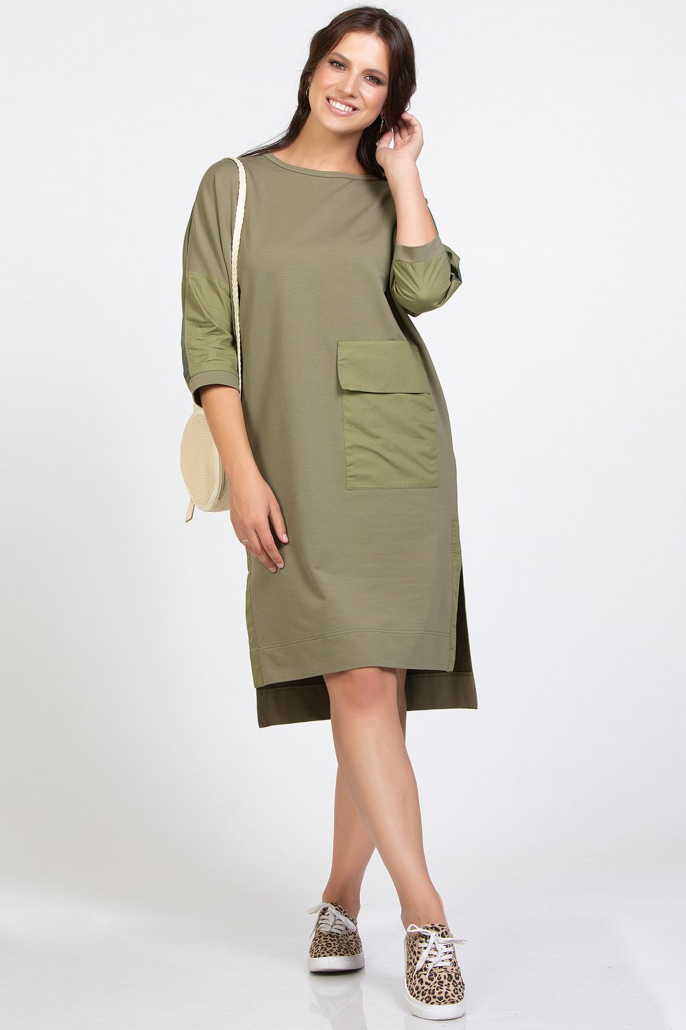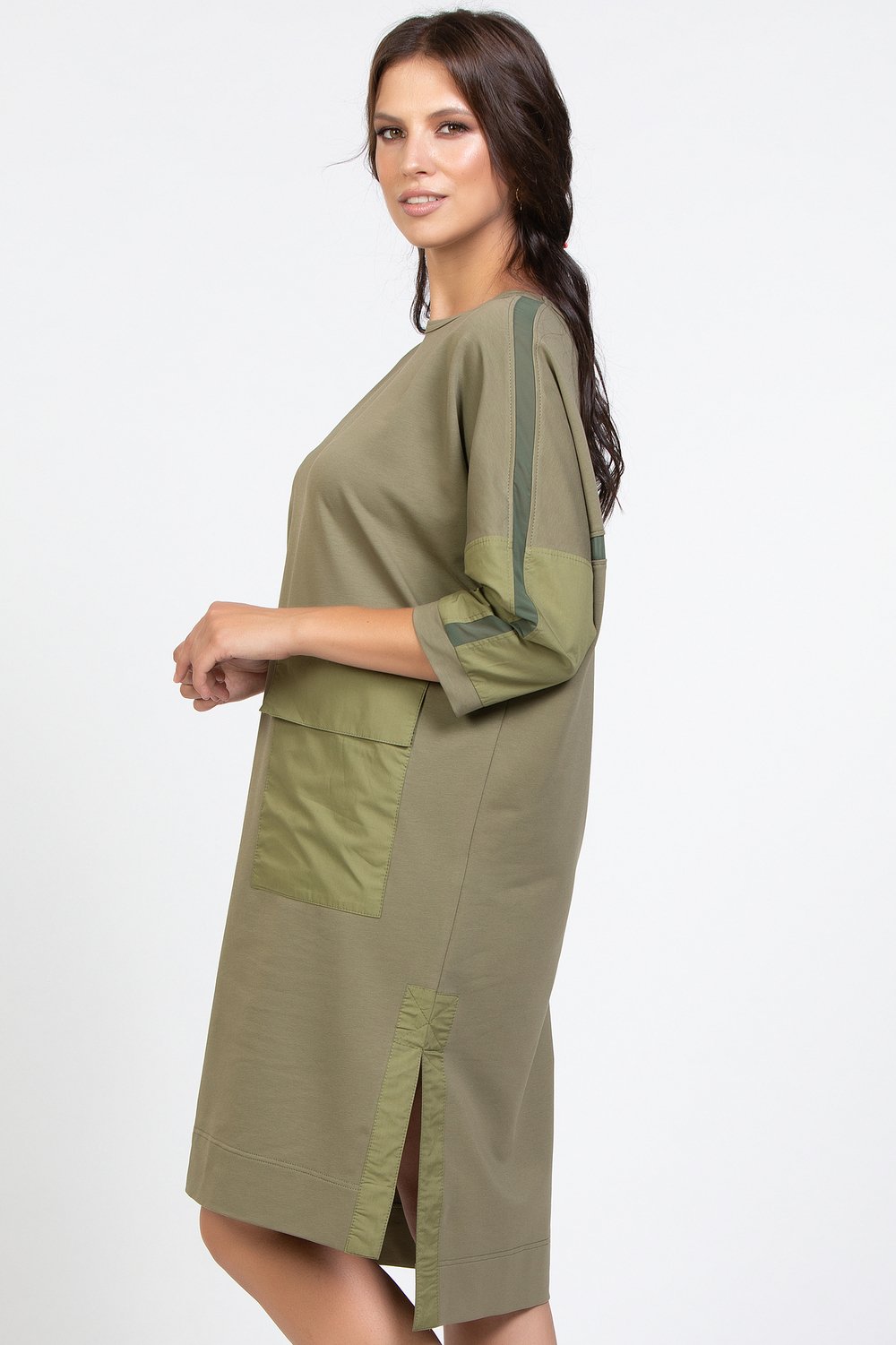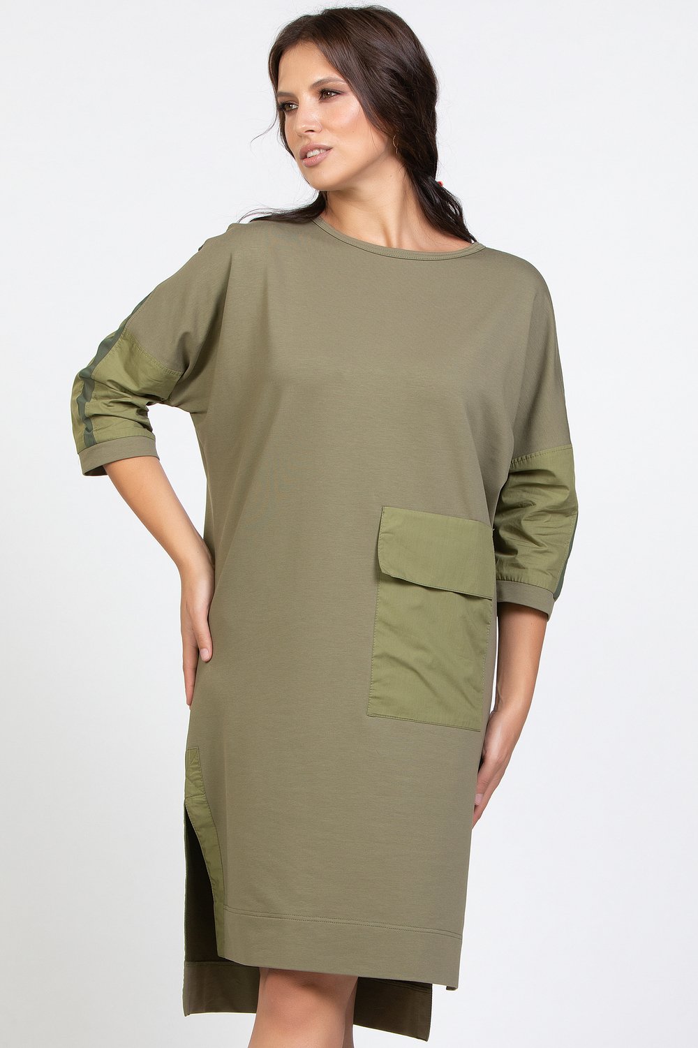 Платье прямого силуэта, с цельнокроеным рукавом, разноуровневое. , с разрезами в боковых швах. Горловина круглая. Перед с накладным карманом с клапаном. Спинка и рукав с членением. Низ рукава с притачной манжетой. По верхнему шву рукава, по спинке вертикально и горизонтально втачаны отделочные детали из шифона шириной 2, 0см в готовом виде. Боковые разрезы обработаны обтачкой. Карман, клапан, обтачки бокового разреза и нижняя часть рукава выполнены из хлопка в тон основного сырья. Цвет. хаки.Характеристики: