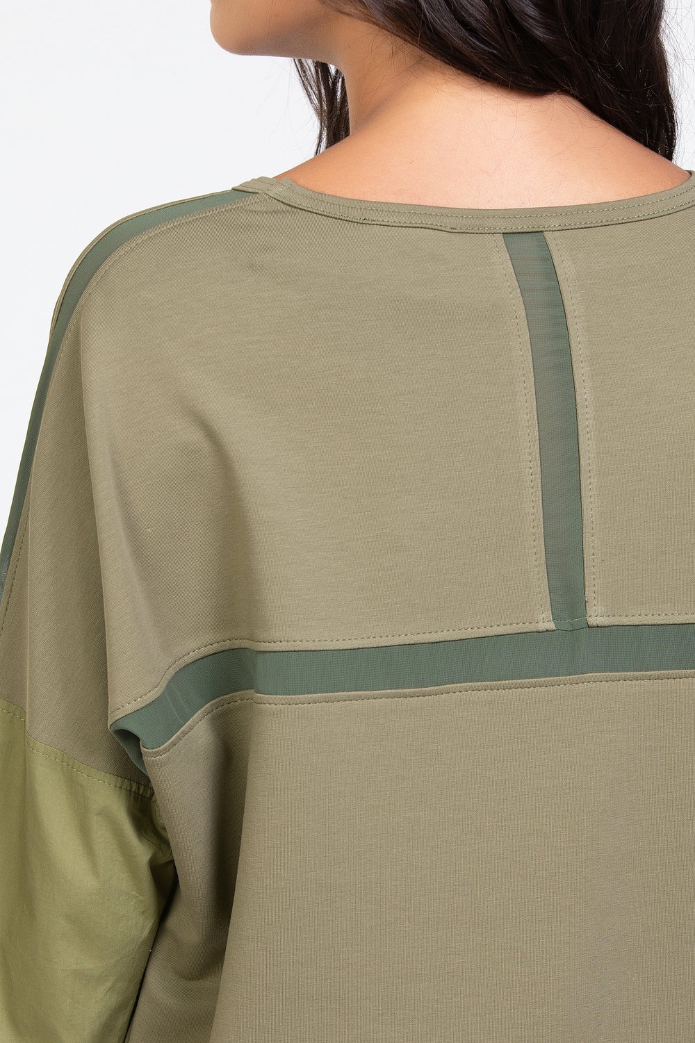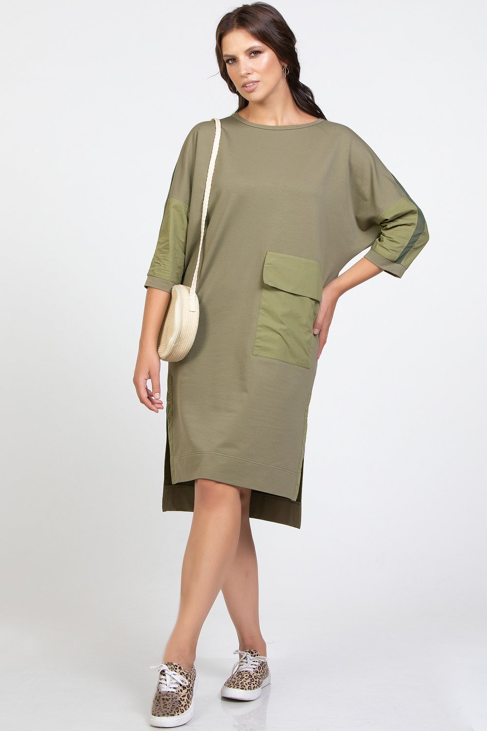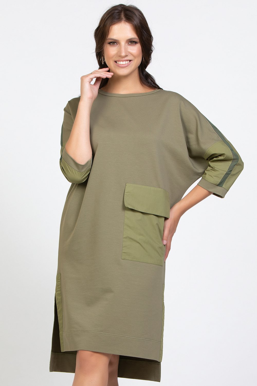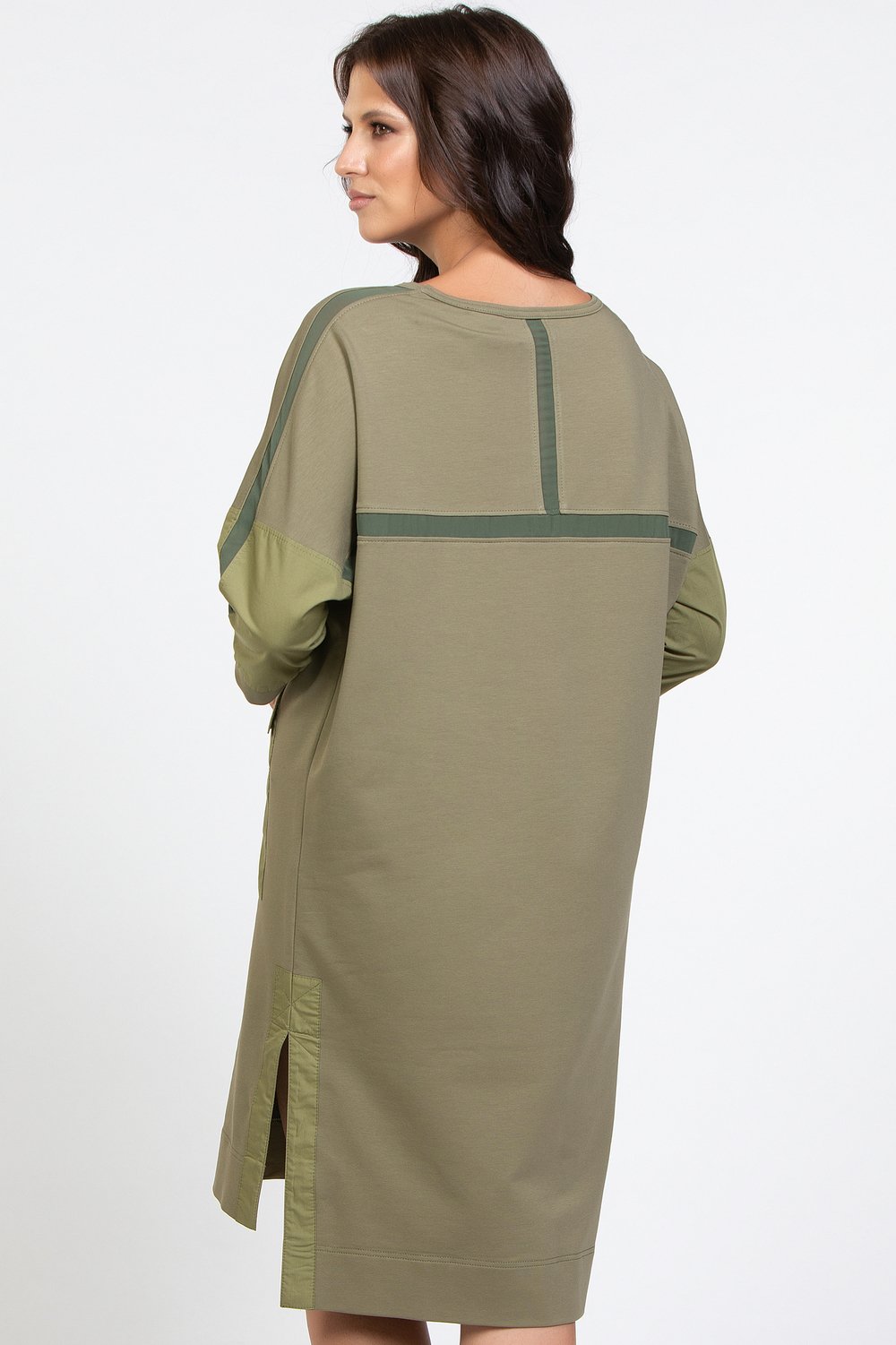 Платье прямого силуэта, с цельнокроеным рукавом, разноуровневое. , с разрезами в боковых швах. Горловина круглая. Перед с накладным карманом с клапаном. Спинка и рукав с членением. Низ рукава с притачной манжетой. По верхнему шву рукава, по спинке вертикально и горизонтально втачаны отделочные детали из шифона шириной 2, 0см в готовом виде. Боковые разрезы обработаны обтачкой. Карман, клапан, обтачки бокового разреза и нижняя часть рукава выполнены из хлопка в тон основного сырья. Цвет. хаки.Характеристики: