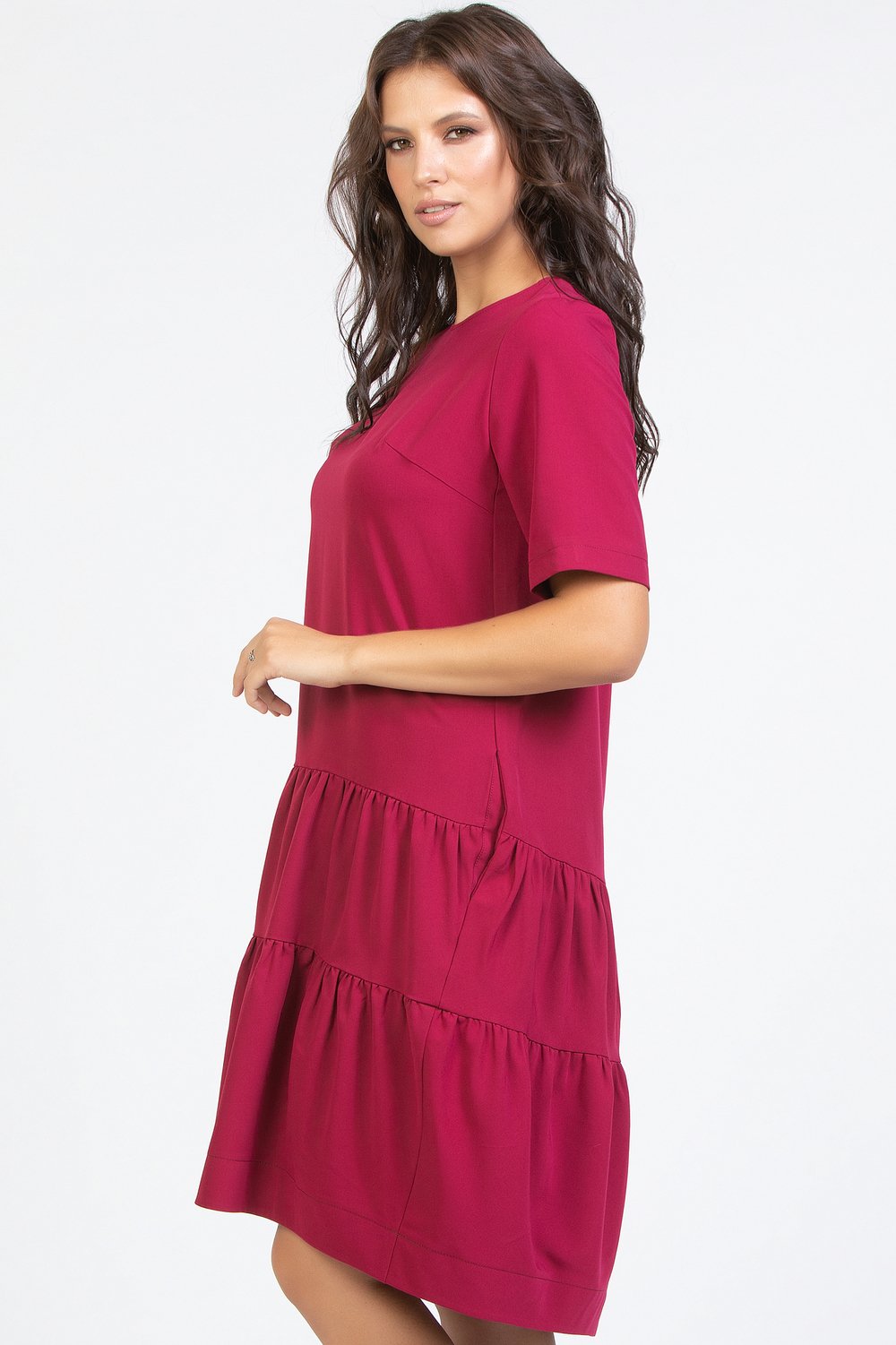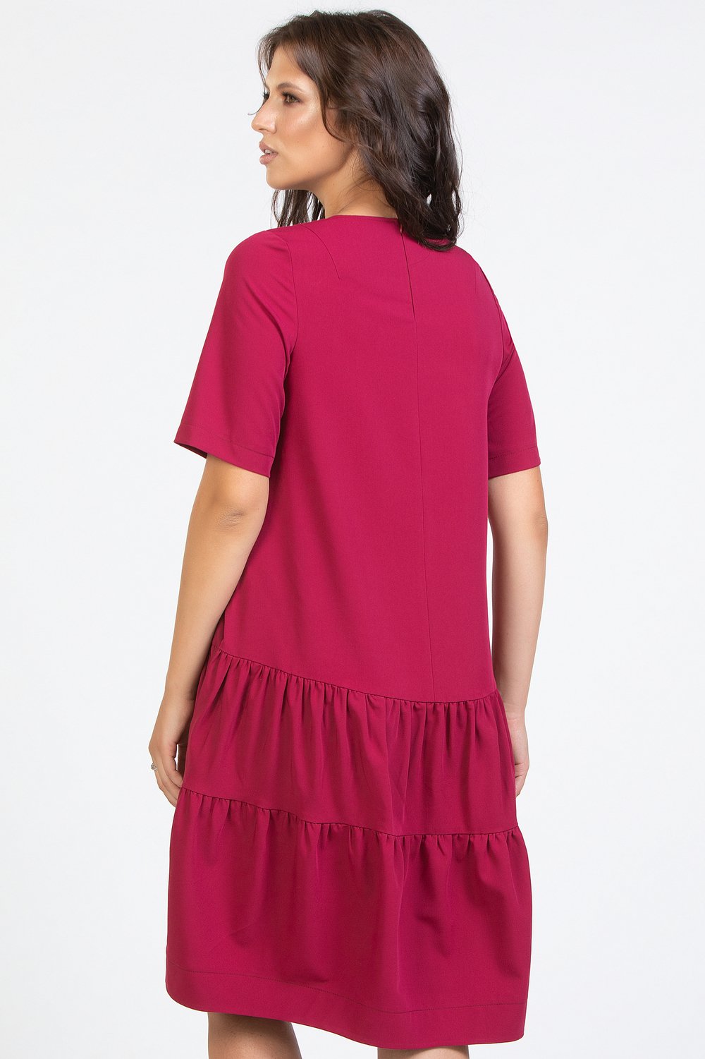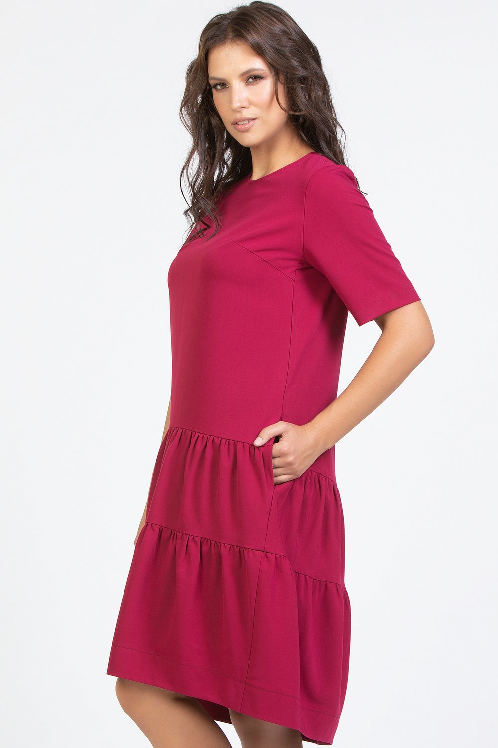 Платье трапециевидного силуэта, отрезное по линии бедер, с карманами в рельефных швах переда. Горловина круглая, рукав втачной, короткий. Спинка с застежкой в среднем шве на тесьму молнию. Нижняя часть переда и спинки с воланами в два ряда, собранными в сборку. Низ платья на обтачке.Характеристики: