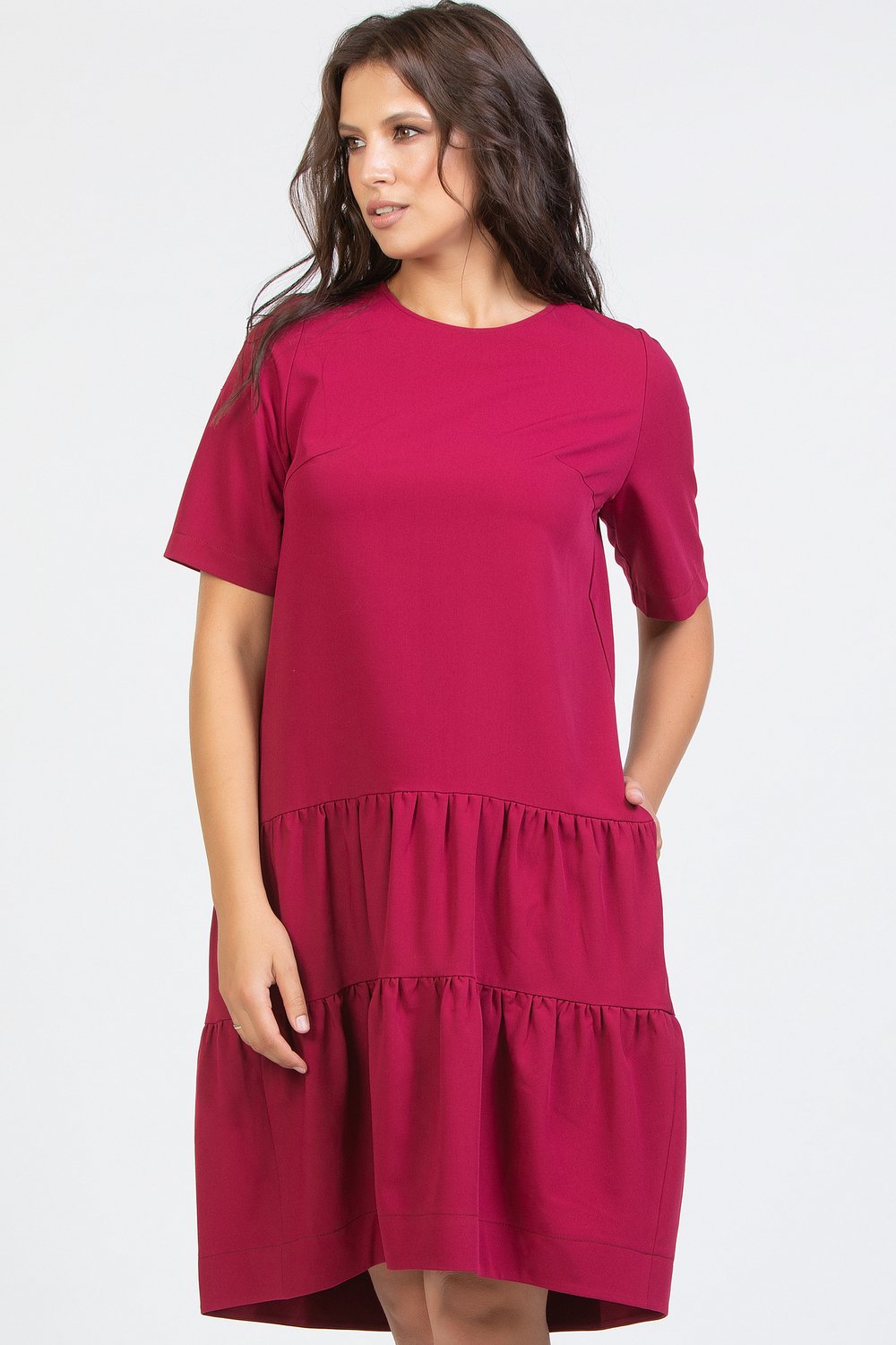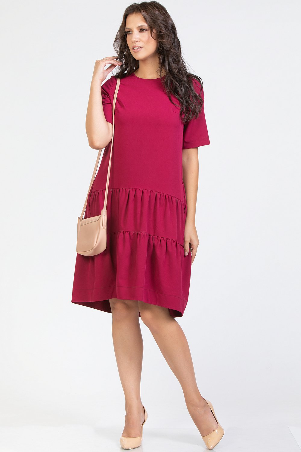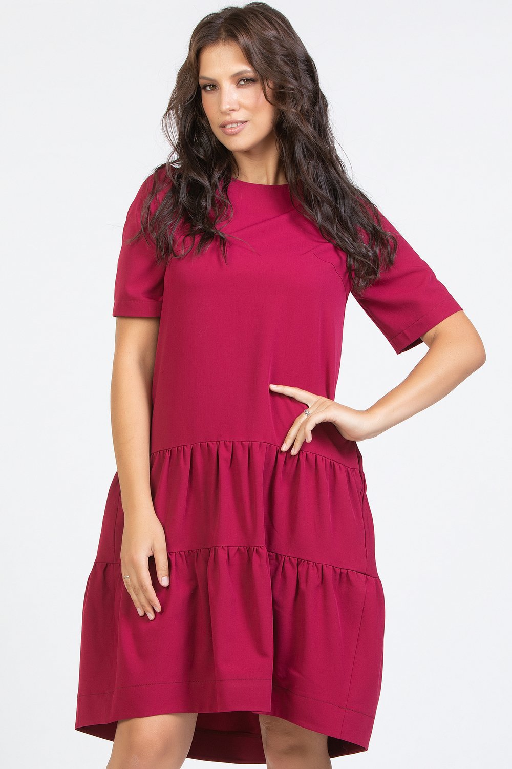 Платье трапециевидного силуэта, отрезное по линии бедер, с карманами в рельефных швах переда. Горловина круглая, рукав втачной, короткий. Спинка с застежкой в среднем шве на тесьму молнию. Нижняя часть переда и спинки с воланами в два ряда, собранными в сборку. Низ платья на обтачке.Характеристики: