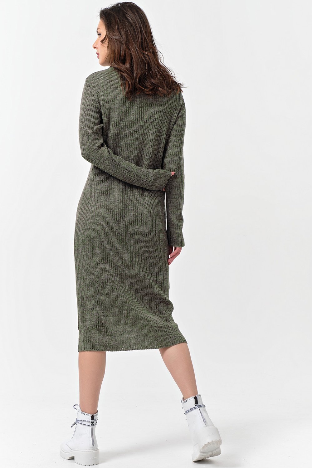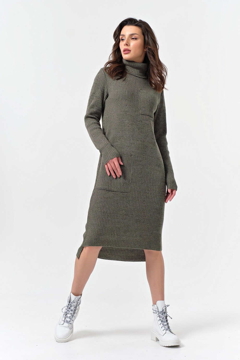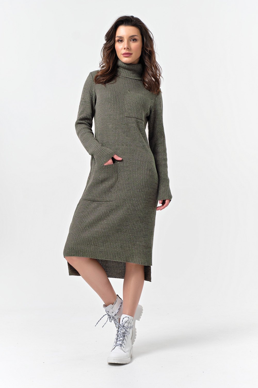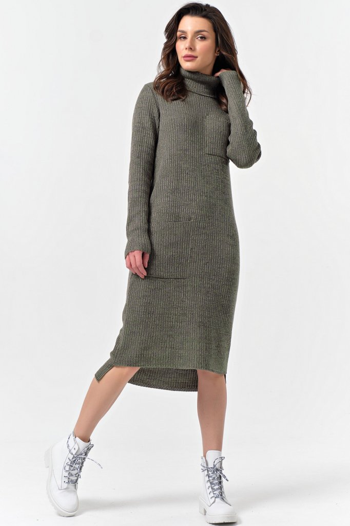 Особенности: Вязаное тонкое платье выполнено из смесовой пряжи с содержанием хлопка - миди прямого силуэта с большими накладными карманами по переду.