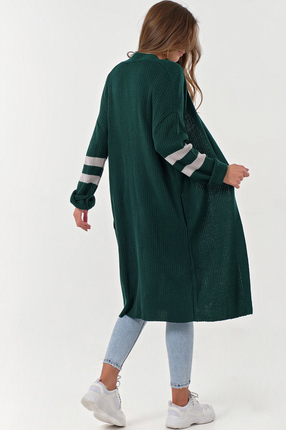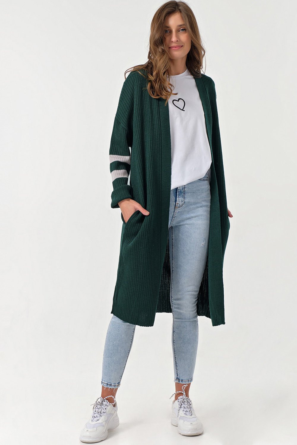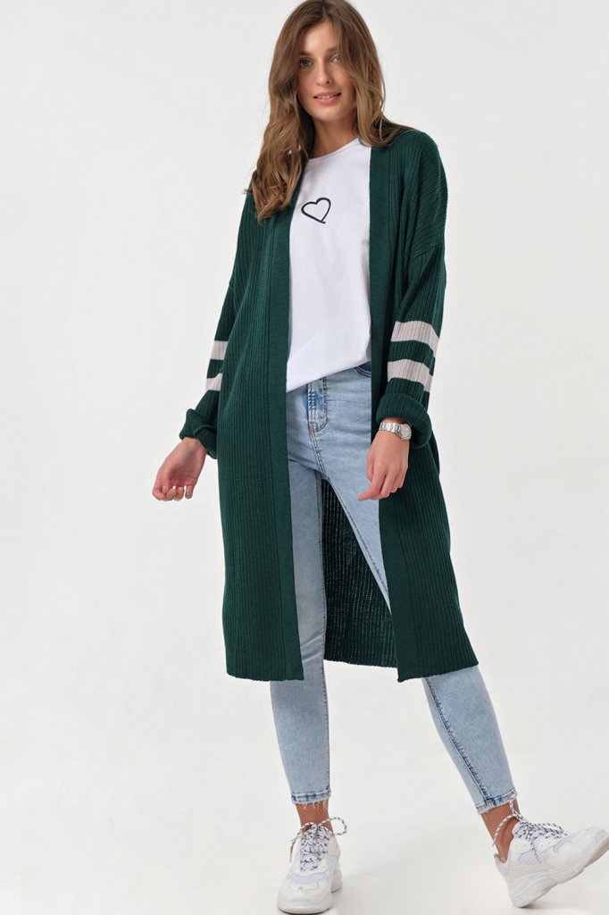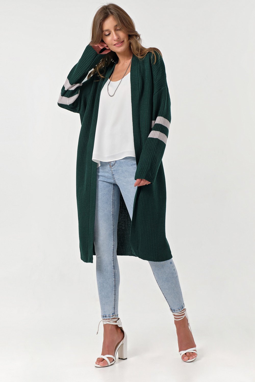 • Длина изделия: 106 см. Особенности: Вязаный кардиган свободного силуэта выполнен из полушерстяной пряжи с цельновязаной планкой. Кардиган дополнен контрастными полосками по рукаву
