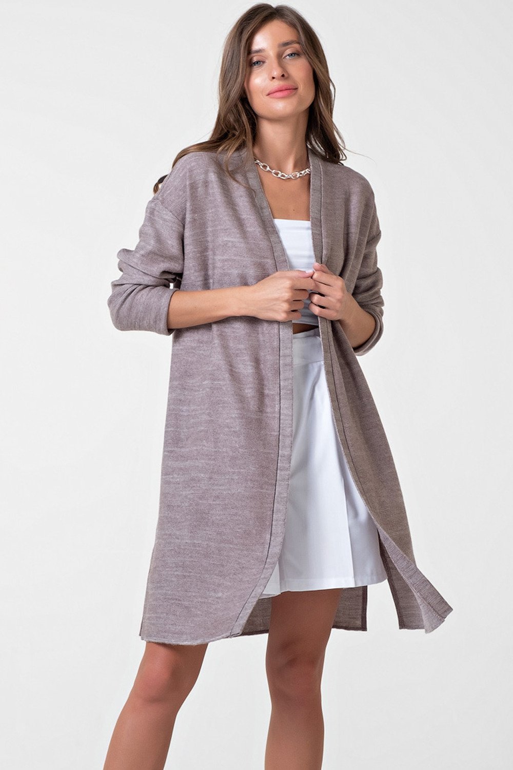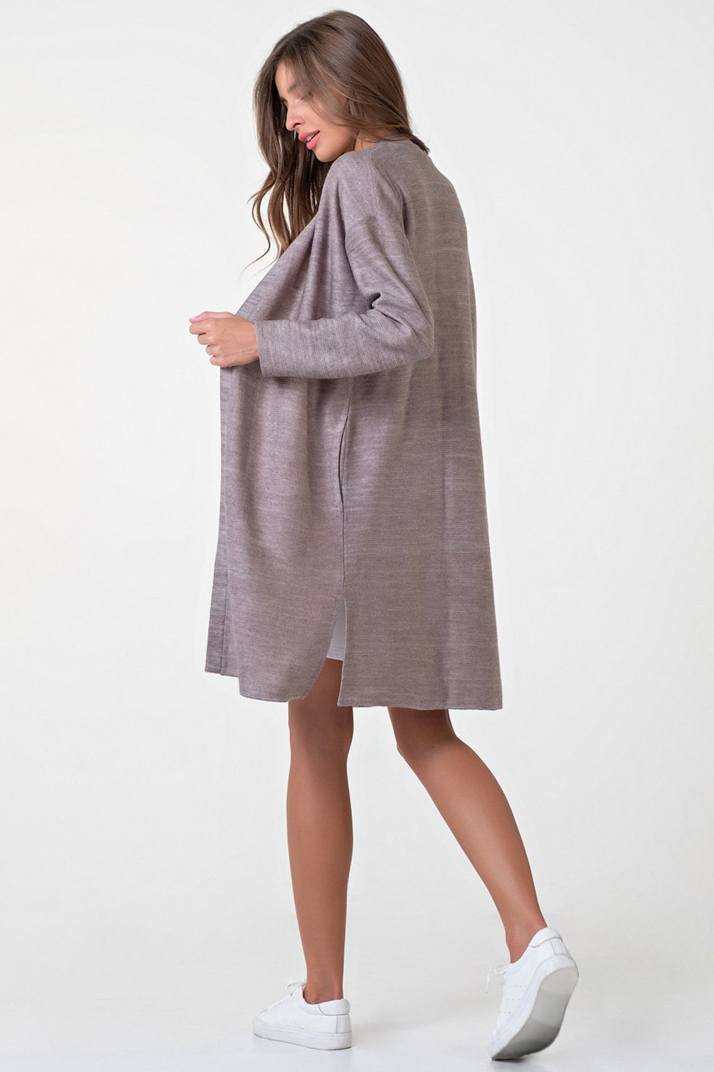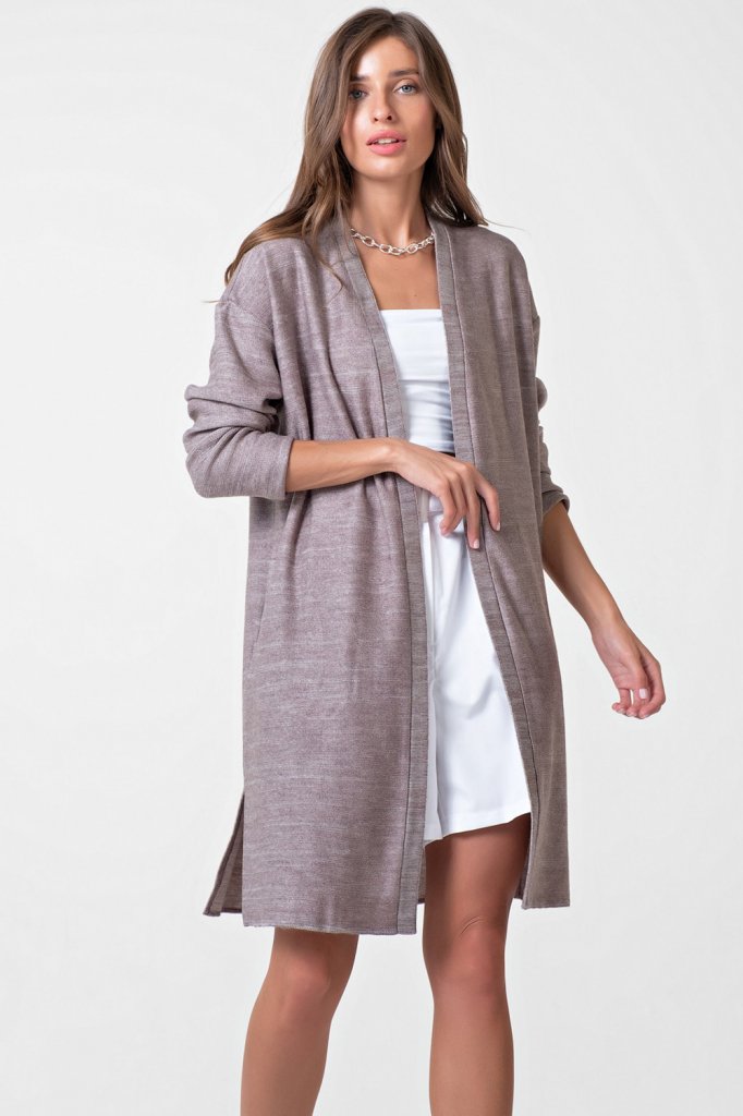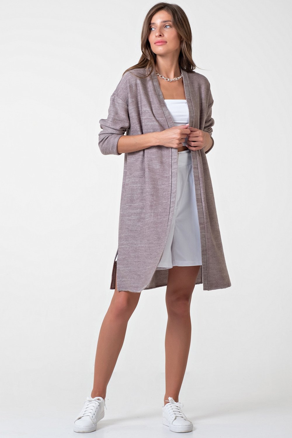 Вязаный кардиган свободного силуэта без застежки. Полочки обработаны узкой бейкой. Рукав удлиненный линия плеча спущена. В боковых швах выполнены карманы и имеются разрезы.