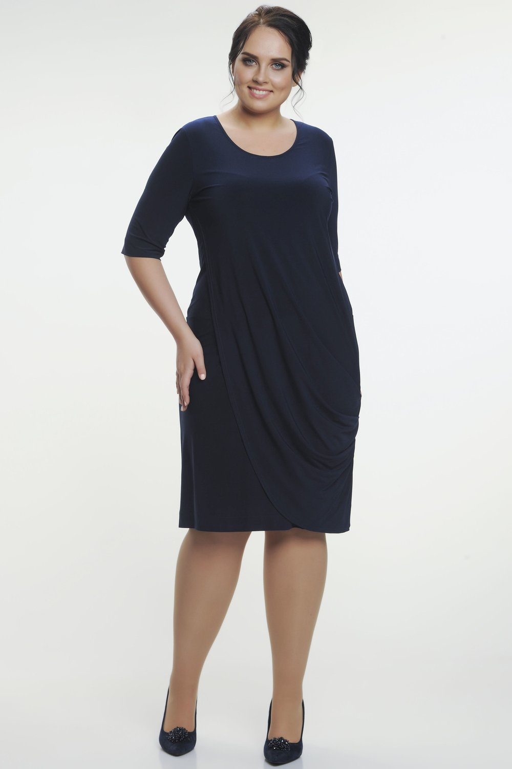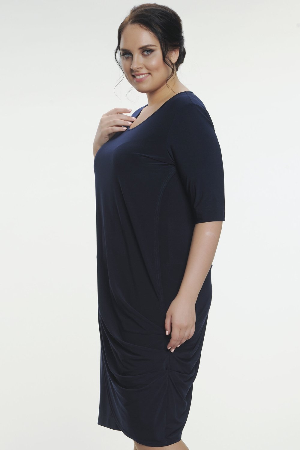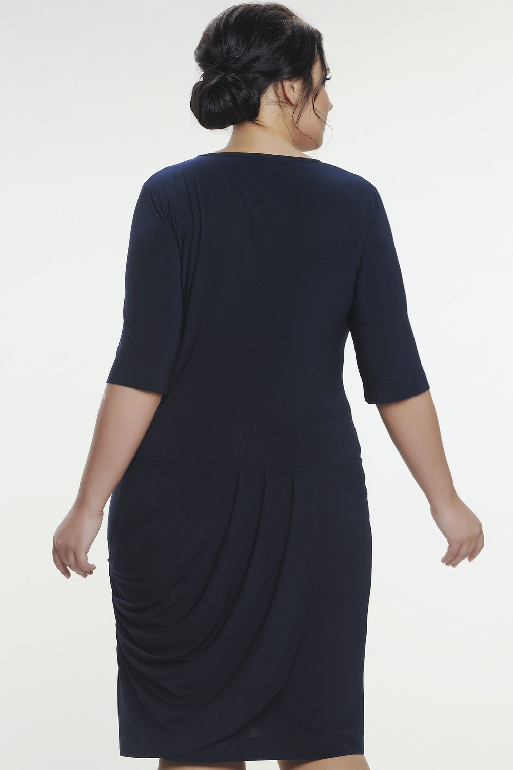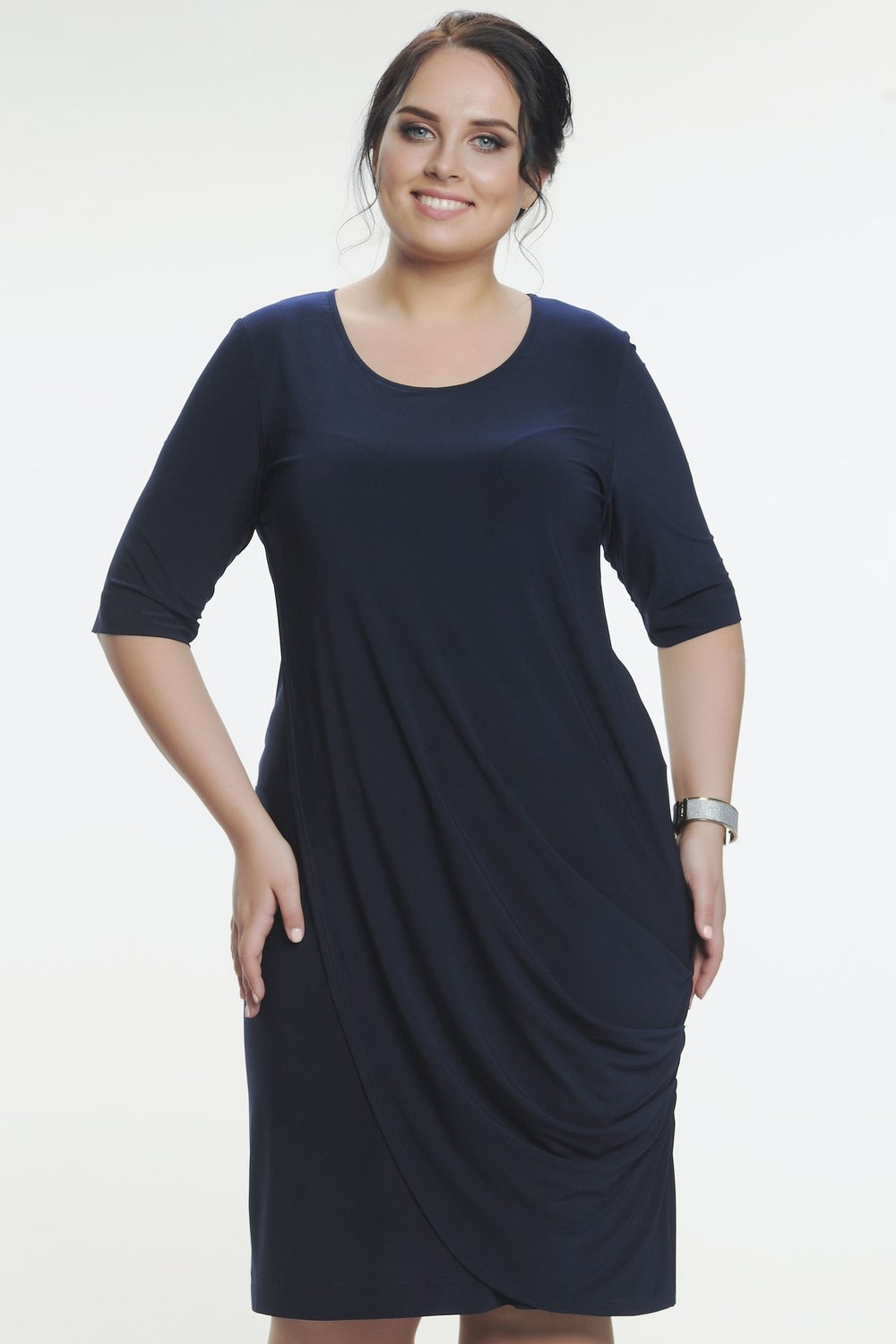Платье из мягкого темно-синего гладкого трикотажа, с драпировкой по правому боковому шву изделия - эффект платья с запахом, рукав 3/4. Самодостаточное платье, но при желании можно украсить бусами, цепями, жемчужными бусами, ярким цветком!