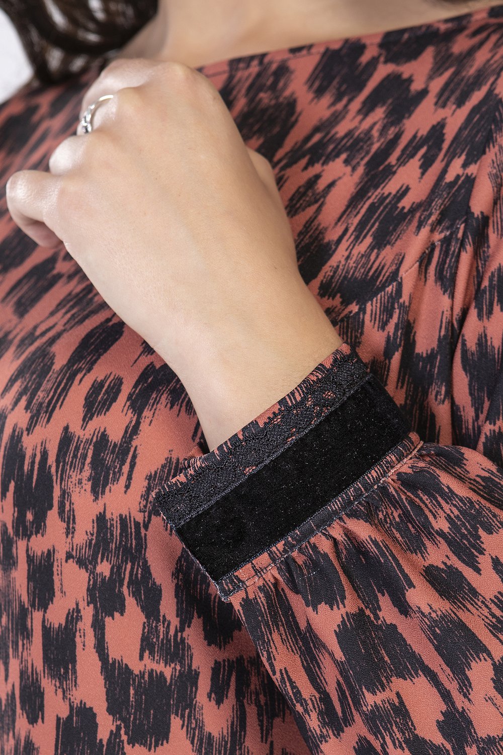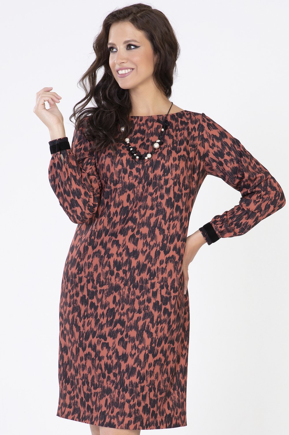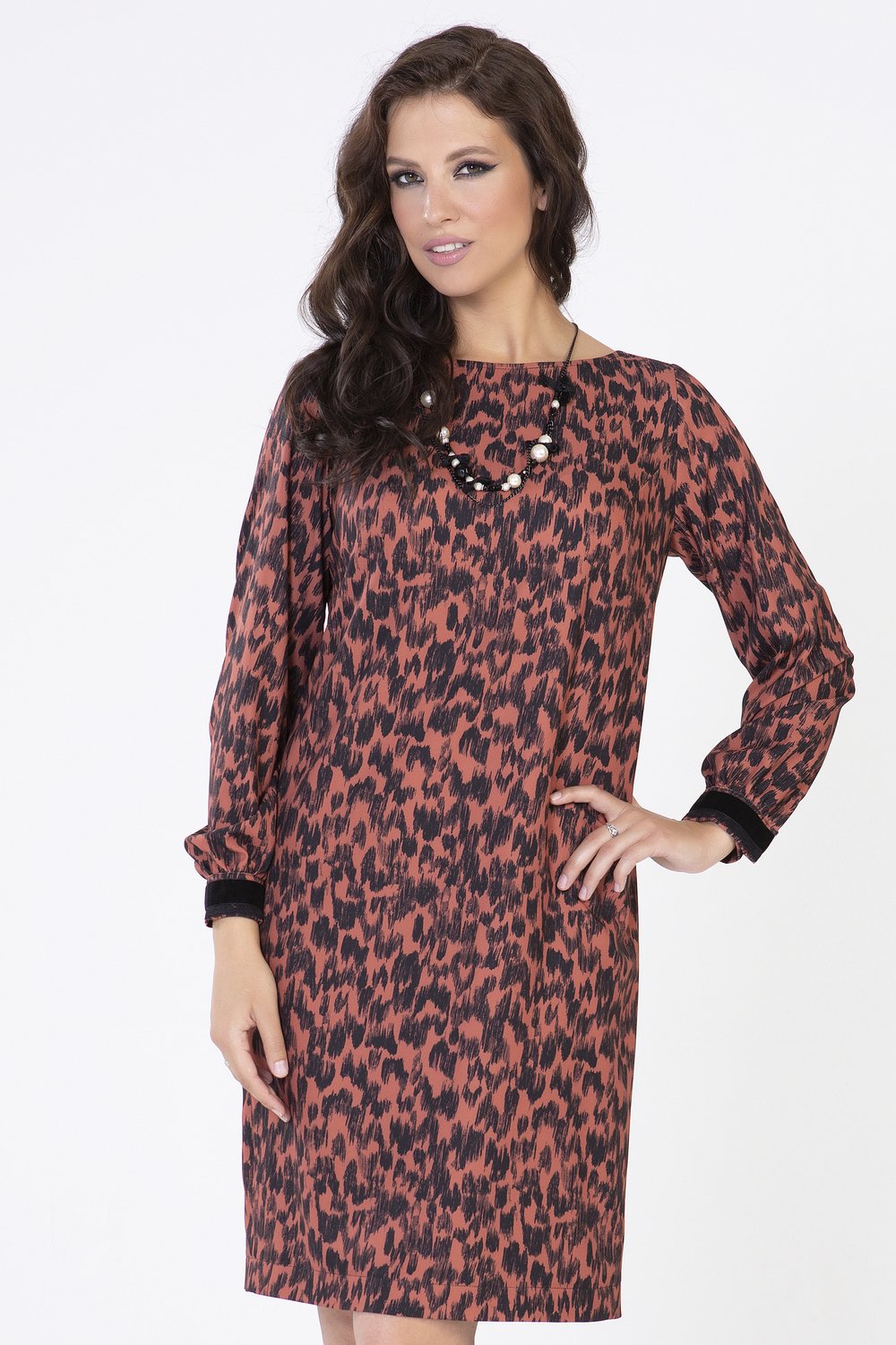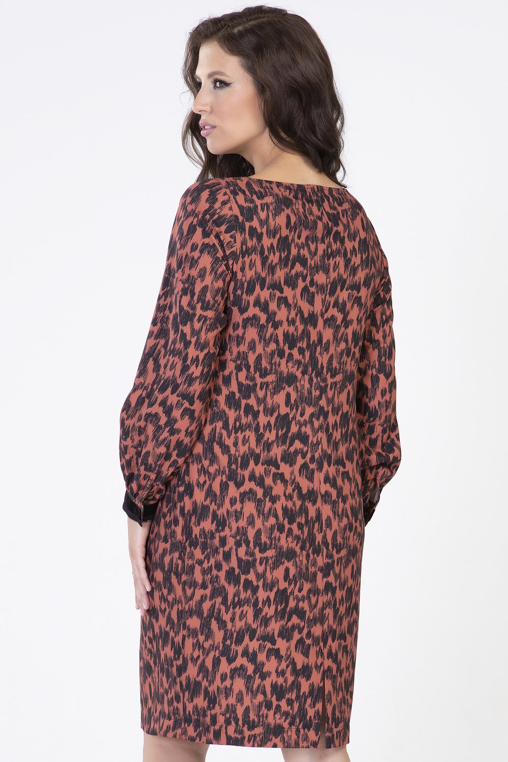 Платье полуприлугающего силуэта с эффектным модным принтом. Горловина лодочка. Спинка с разрезом в среднем шве. Рукав длинный втачной, собран в сборку по низу, на притачной манжете, застегивающейся на две пришивные кнопки. Манжет декорирован матовой бархатной лентой.