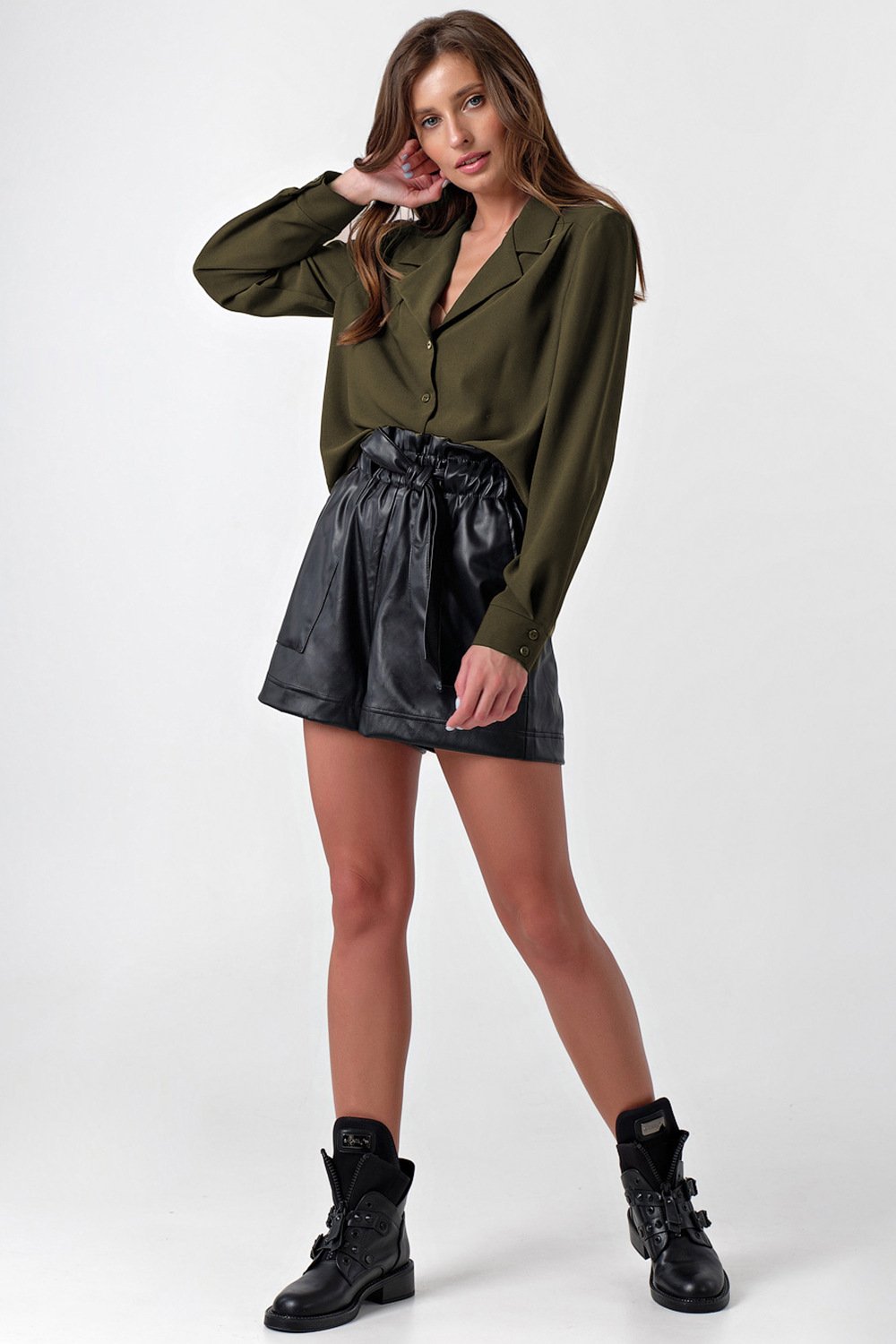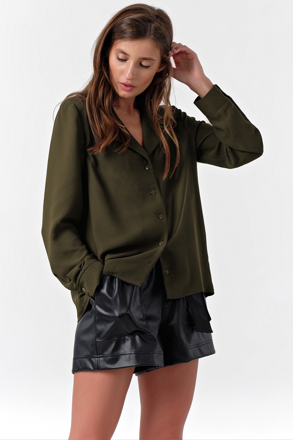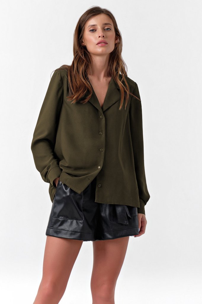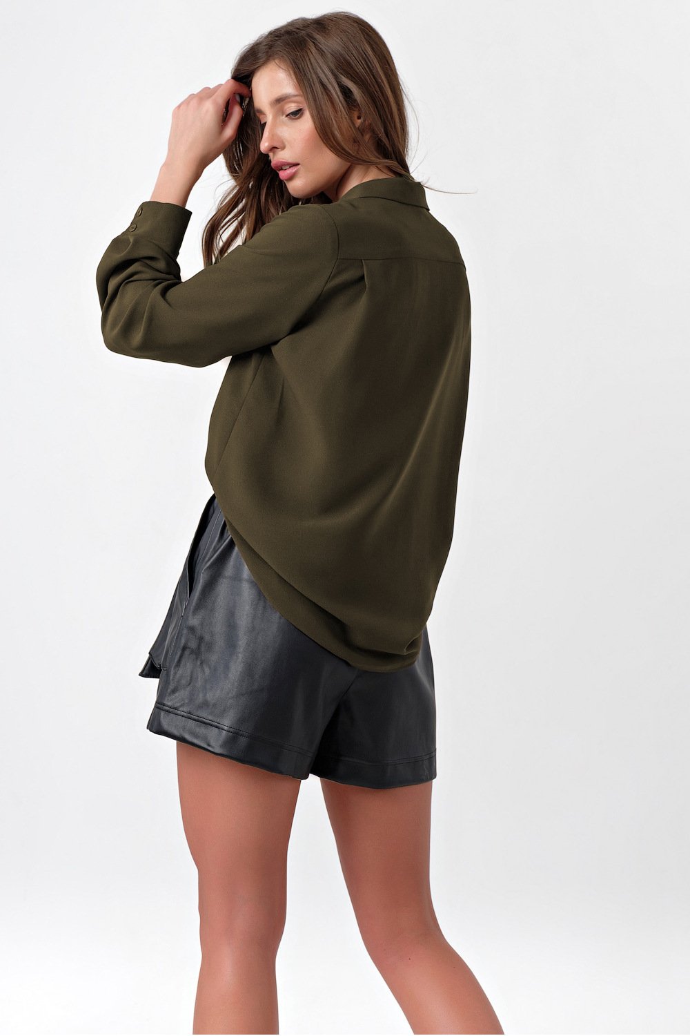 • Особенности: Блузка прямого силуэта из крепа. Детали: кокетка по переду и спинке, защипы по линии кокетки переда и спинки, отложной воротник, длинный втачной рукав с манжетой с застежкой на петли-пуговицы. Застежка по переду на петли-пуговицы.
