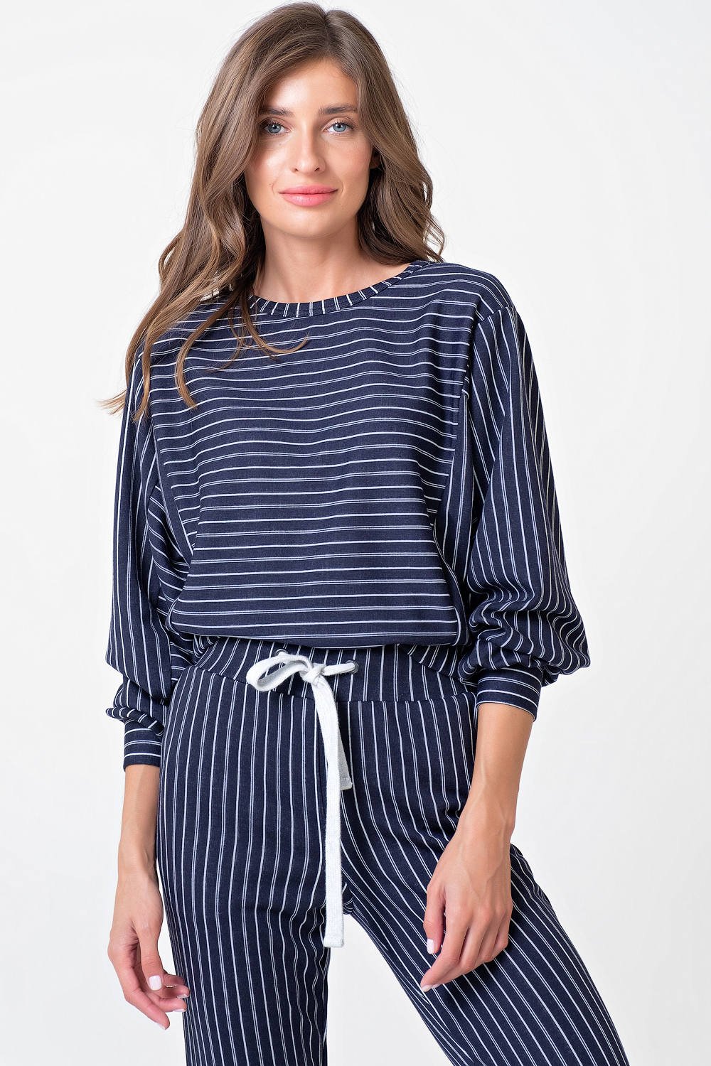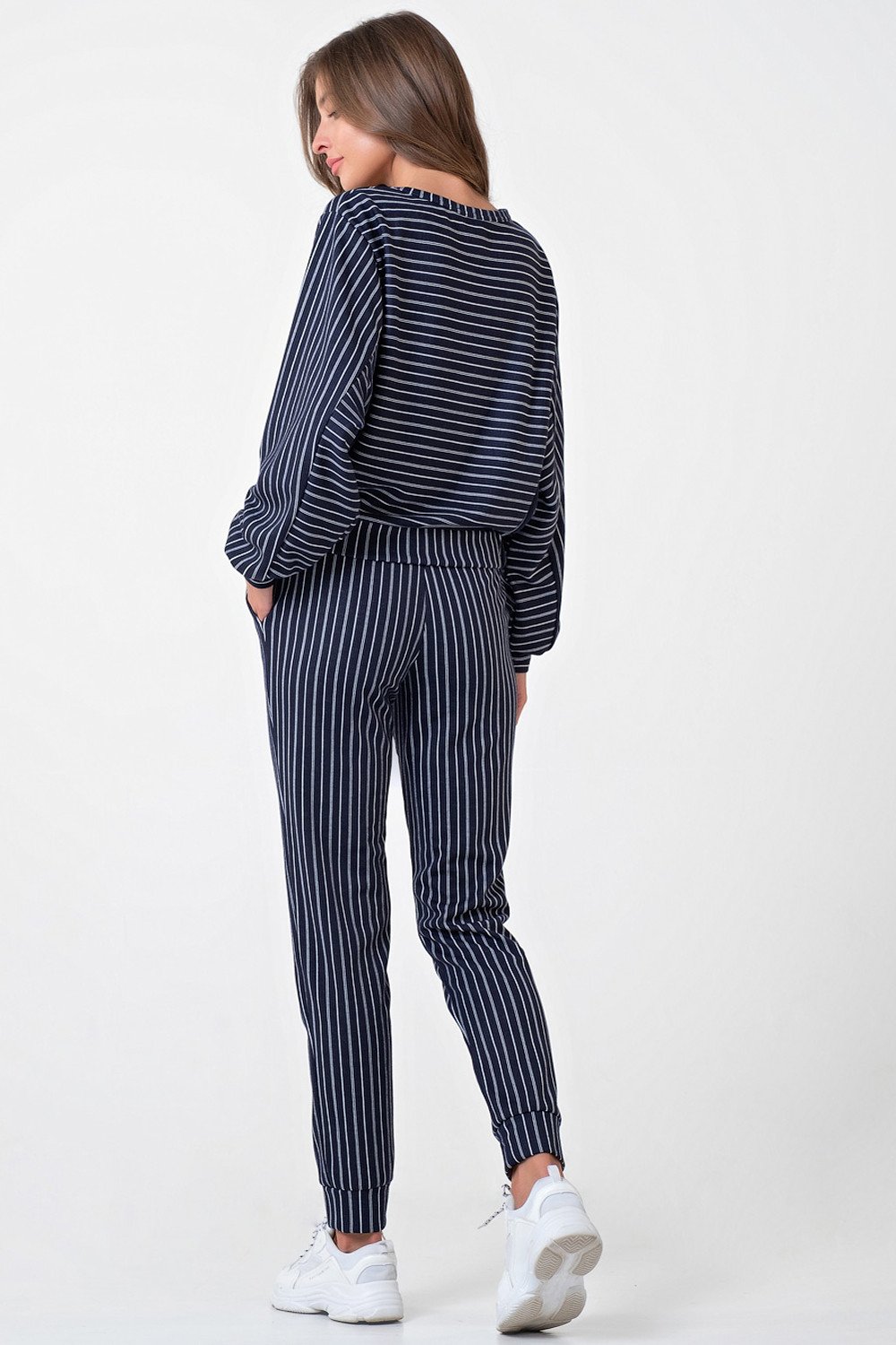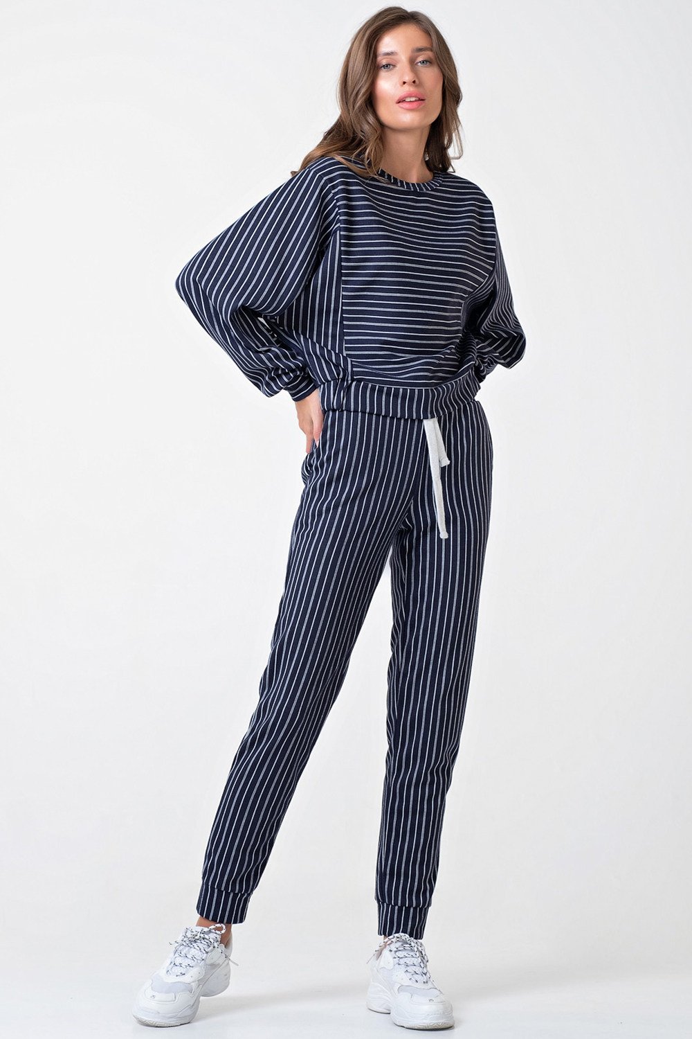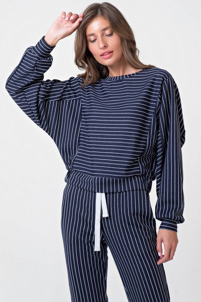 • Особенности: Костюм из свитшота и брюк из плотного трикотажа в полоску. Детали свитшота: горловина обработана бейкой, спущенная линия плеча, широкий рукав с манжетой, по бокам вставки в другом направлении, по низу свитшота притачной пояс с боковыми вставками, присборенными на резину. Детали брюк: притачной пояс с кулиской, контрастный шнур в поясе, боковые карманы, по низу манжеты.