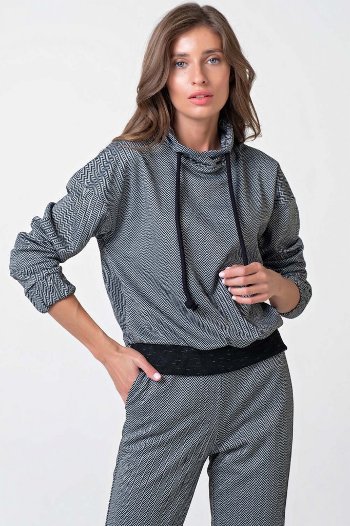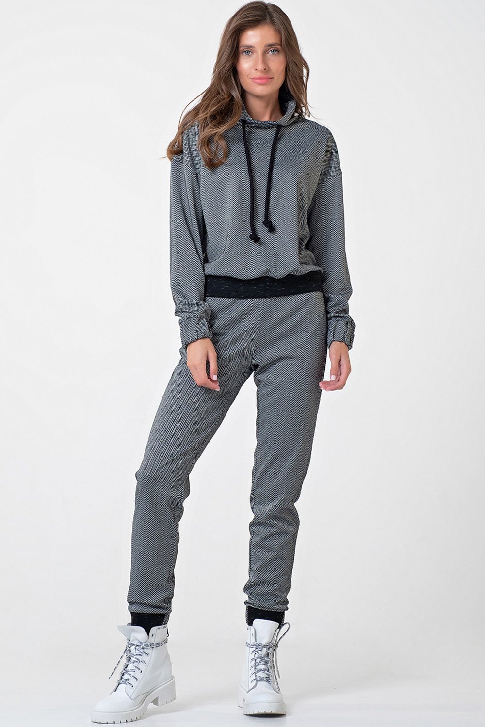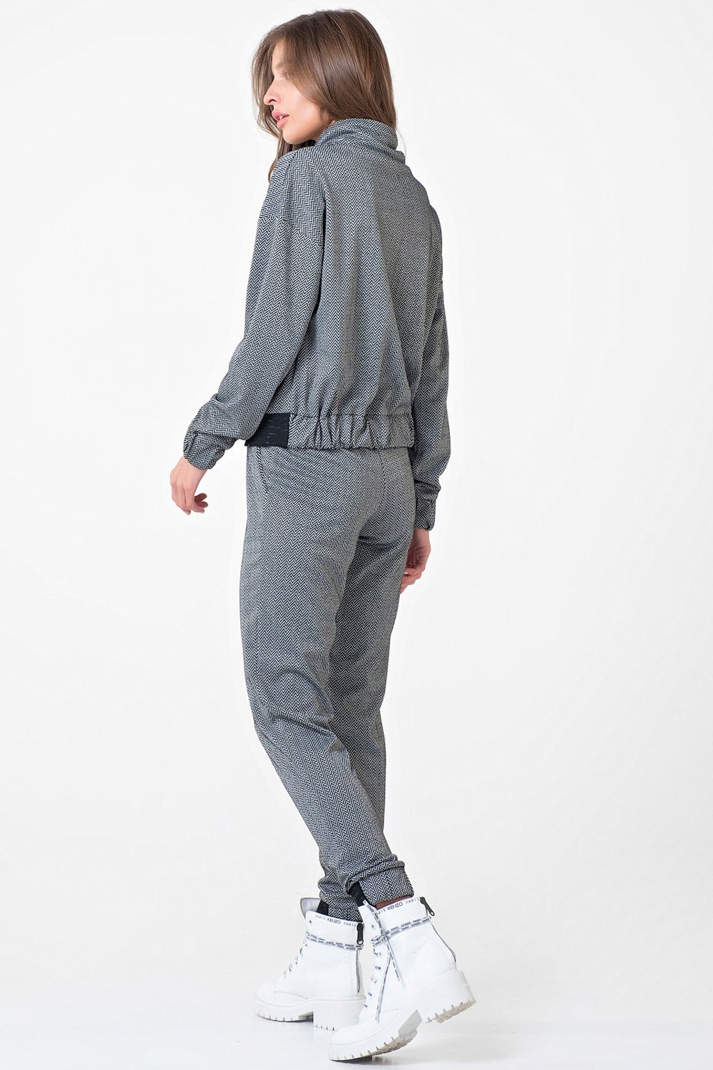 • Особенности: Костюм (свитшот и брюки) из трикотажа. Детали свитшота: воротник-стойка с кулиской, шнурок в стойке, спущенная линия плеча, втачной рукав с манжетой, присборенной на резину, по переду притачной пояс из отделочного Кашкорсе, по спинке притачной пояс из основного материала, присборенный на резину. Детали брюк: притачной пояс из основного материала, боковые карманы, по низу переда брюк манжета из Кашкорсе, по низу спинки брюк манжета из основного материала, присборенная на резину.