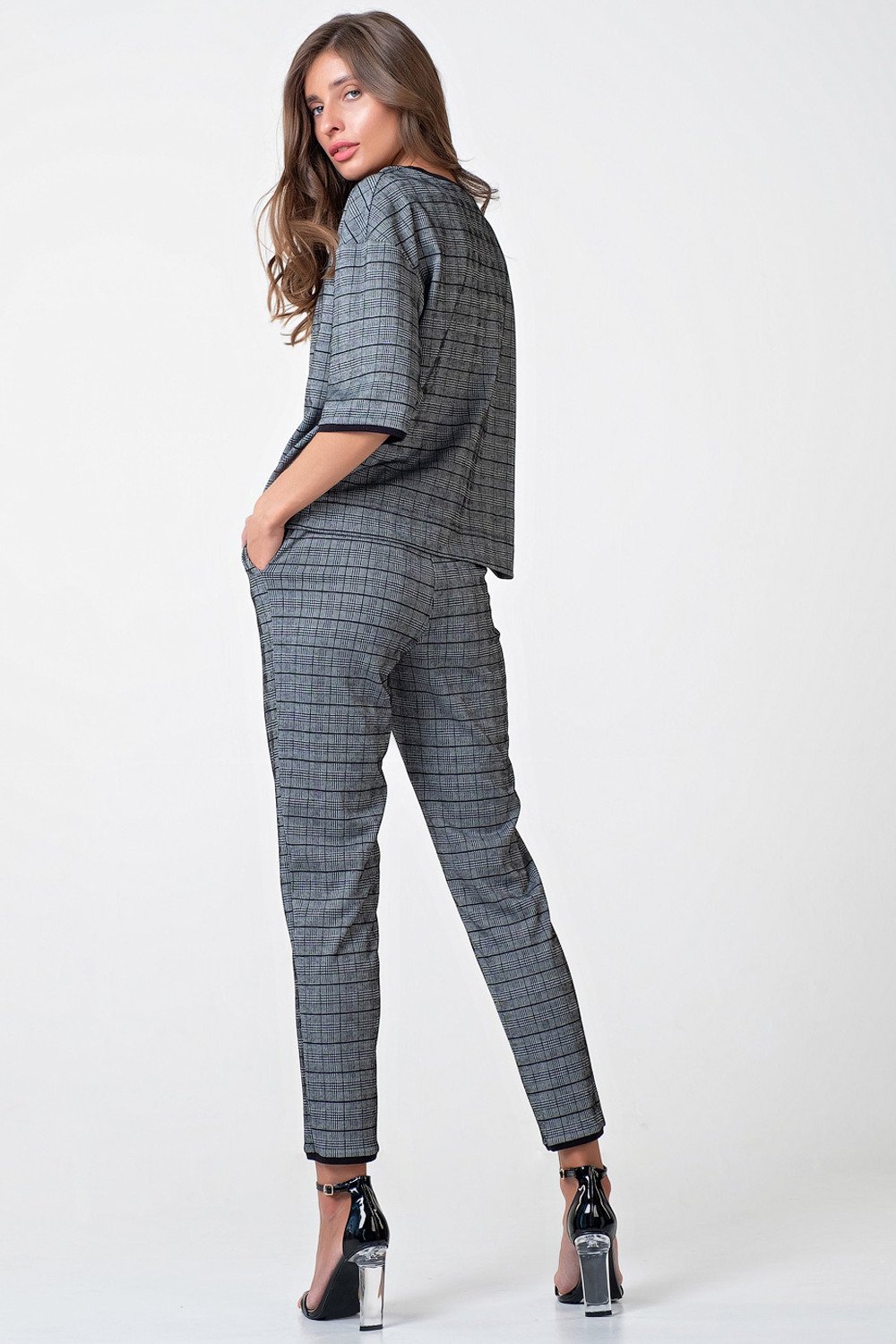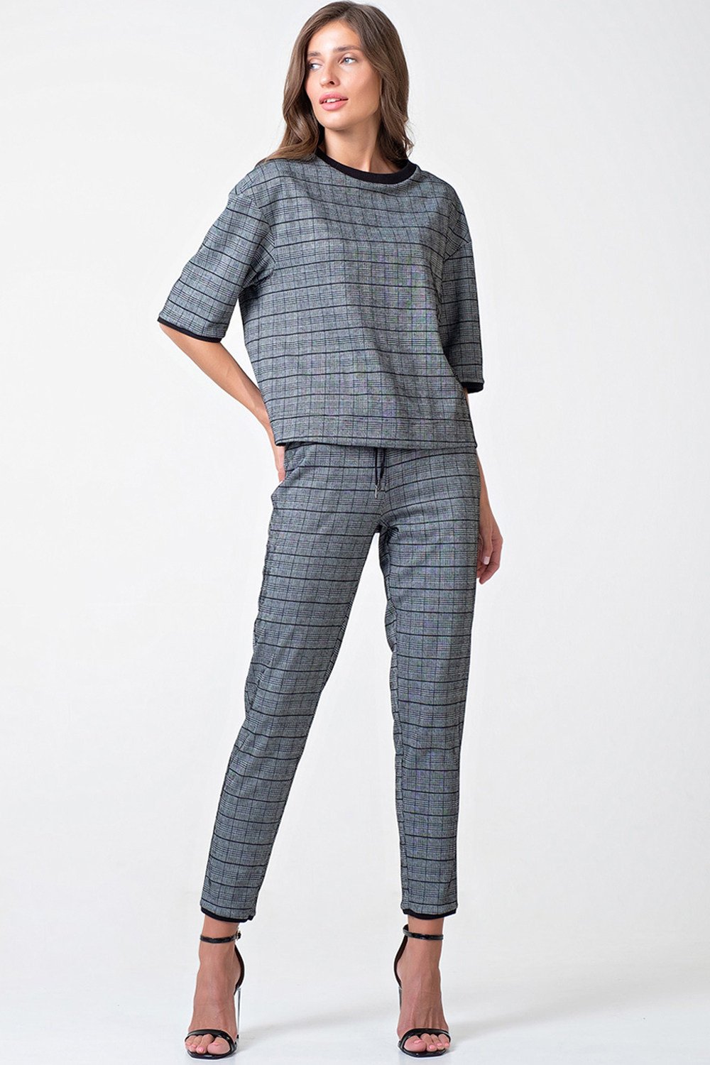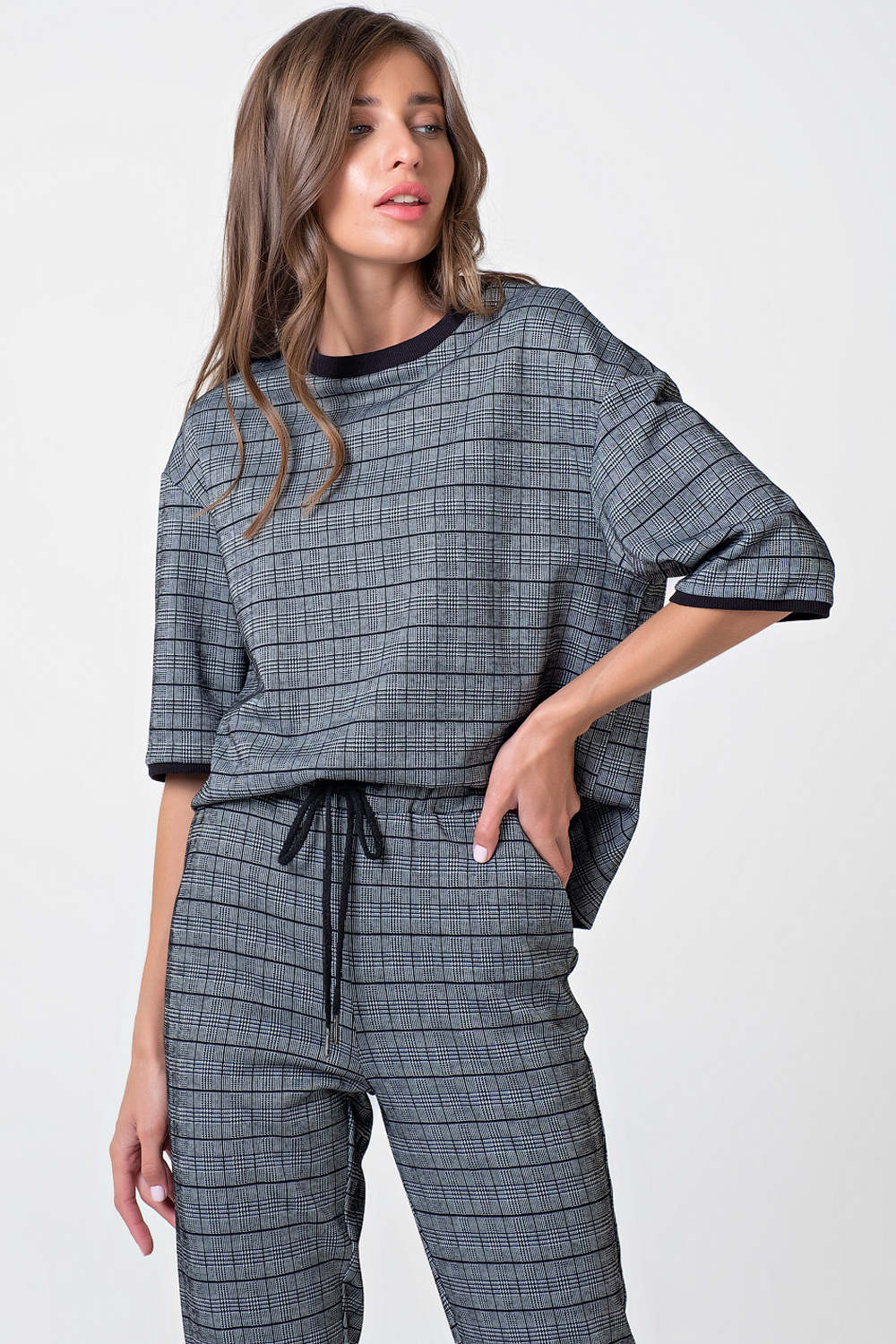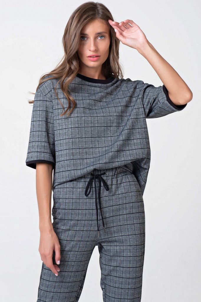 • Особенности: Костюм из блузы и брюк из плотного трикотажа. Детали блузы: свободный прямой силуэт, спущенная линия плеча по горловине и низу рукава притачная бейка из Кашкорсе. Детали брюк: притачной пояс с кулиской и шнуром, боковые карманы, по низу брюк притачная бейка из Кашкорсе.