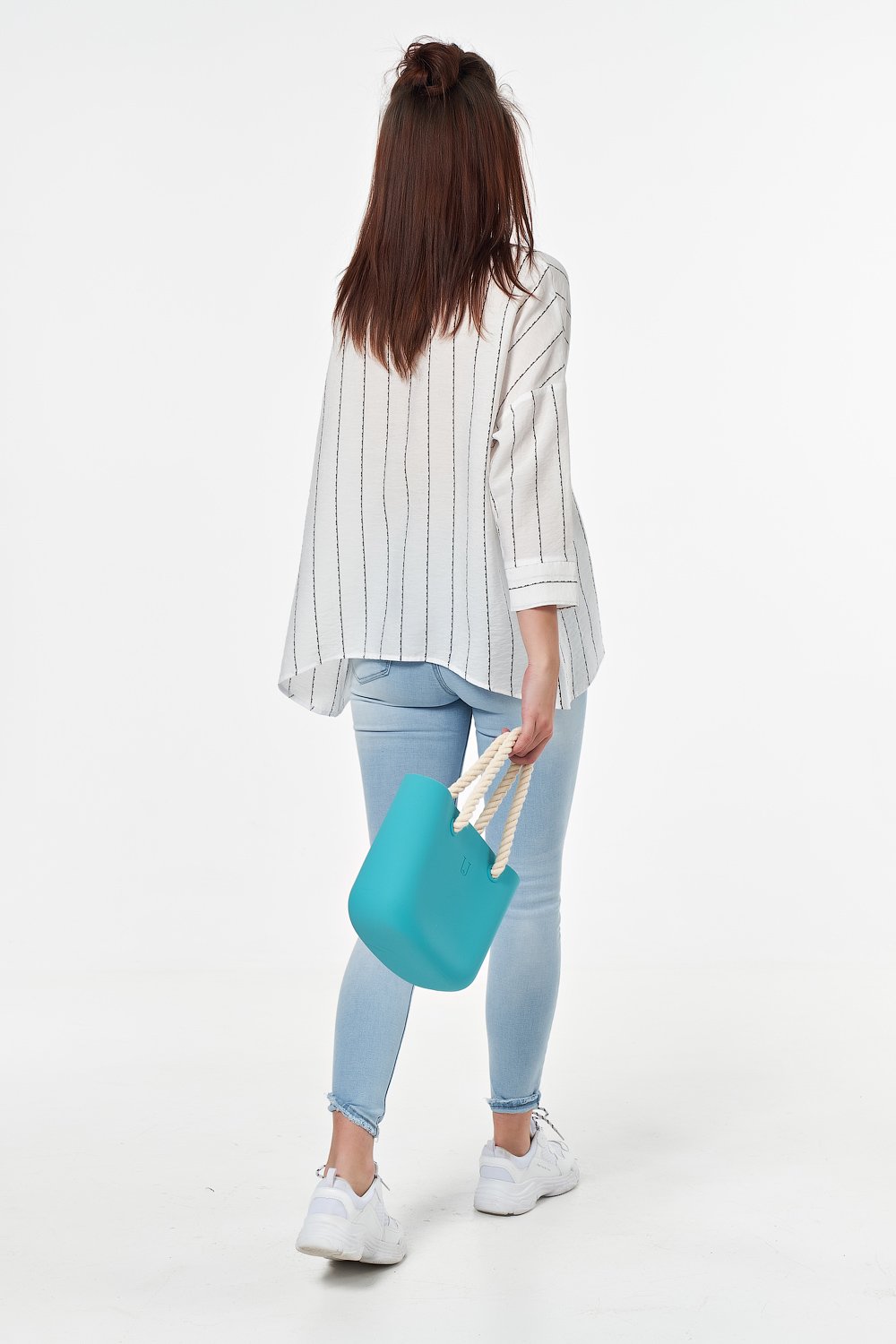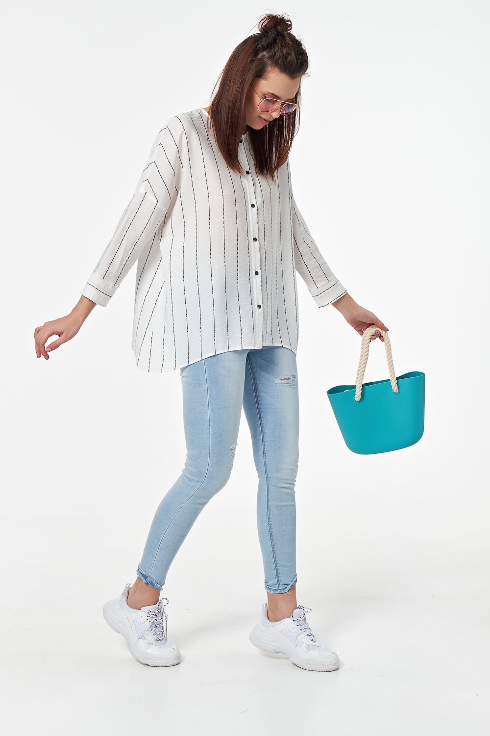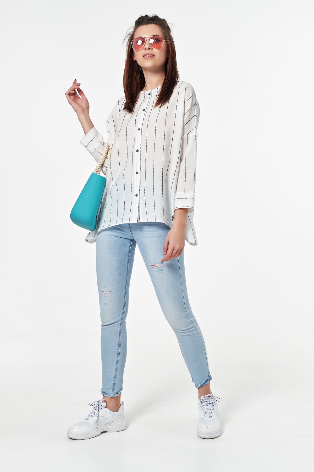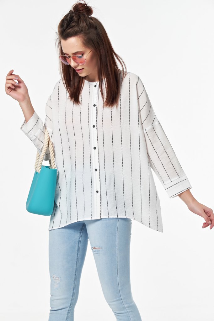 • Особенности: Блуза свободного А-образного силуэта из блузочной ткани. Детали: горловина обработана бейкой спущенная линия плеча втачной рукав с притачной манжетой фигурная линия низа. Застежка по переду на петли-пуговицы.